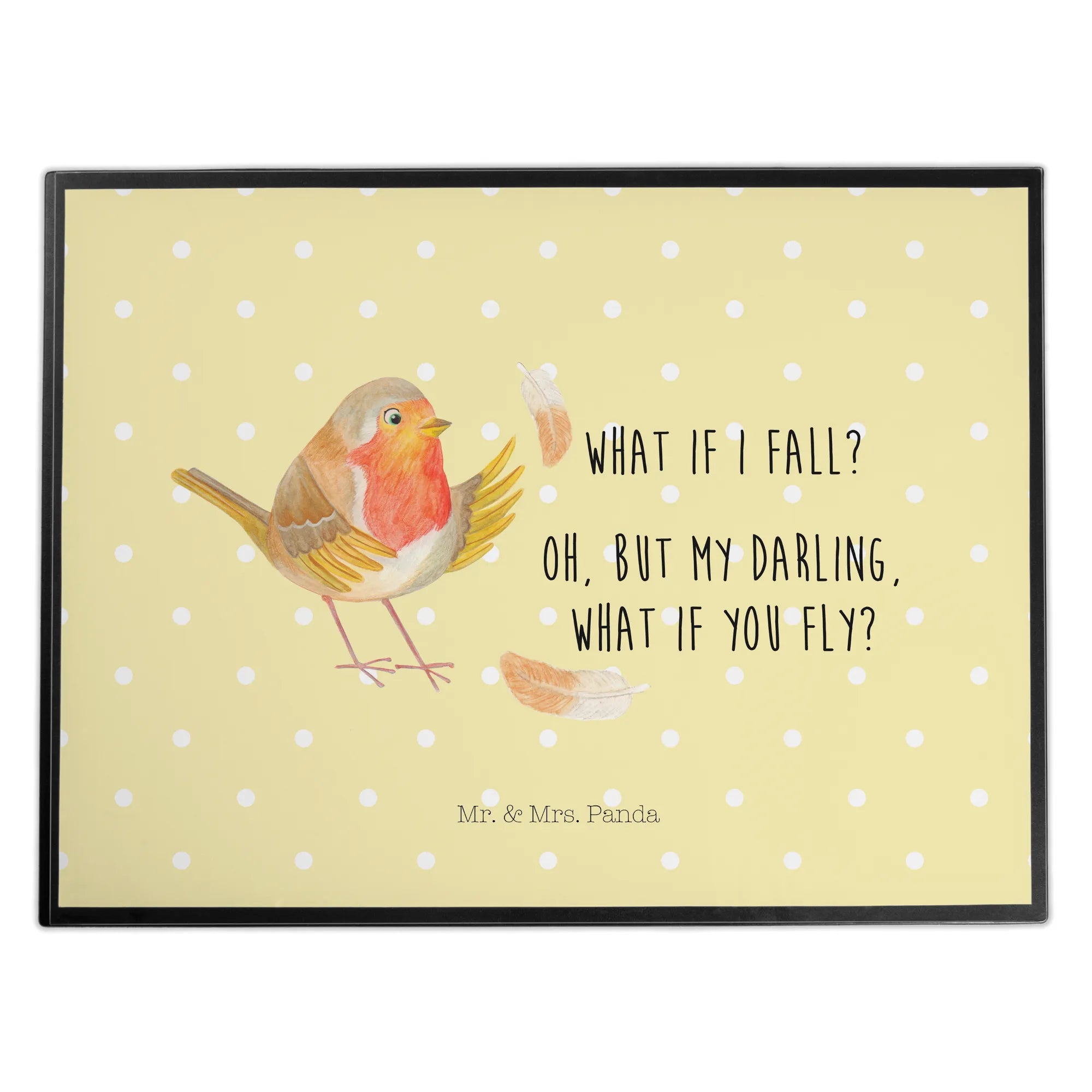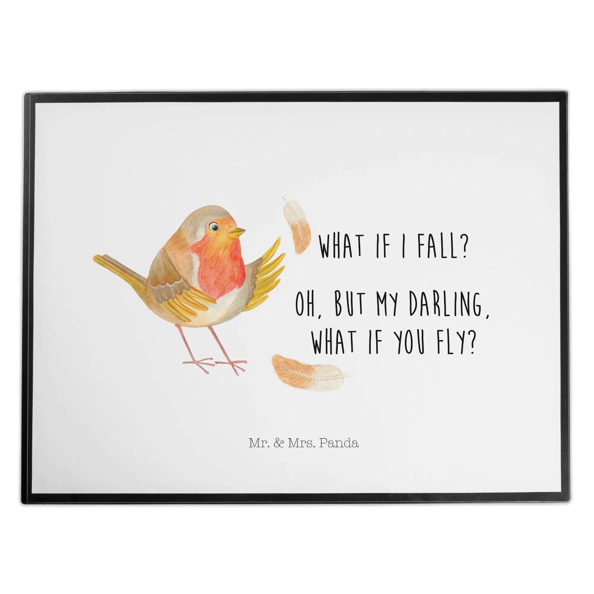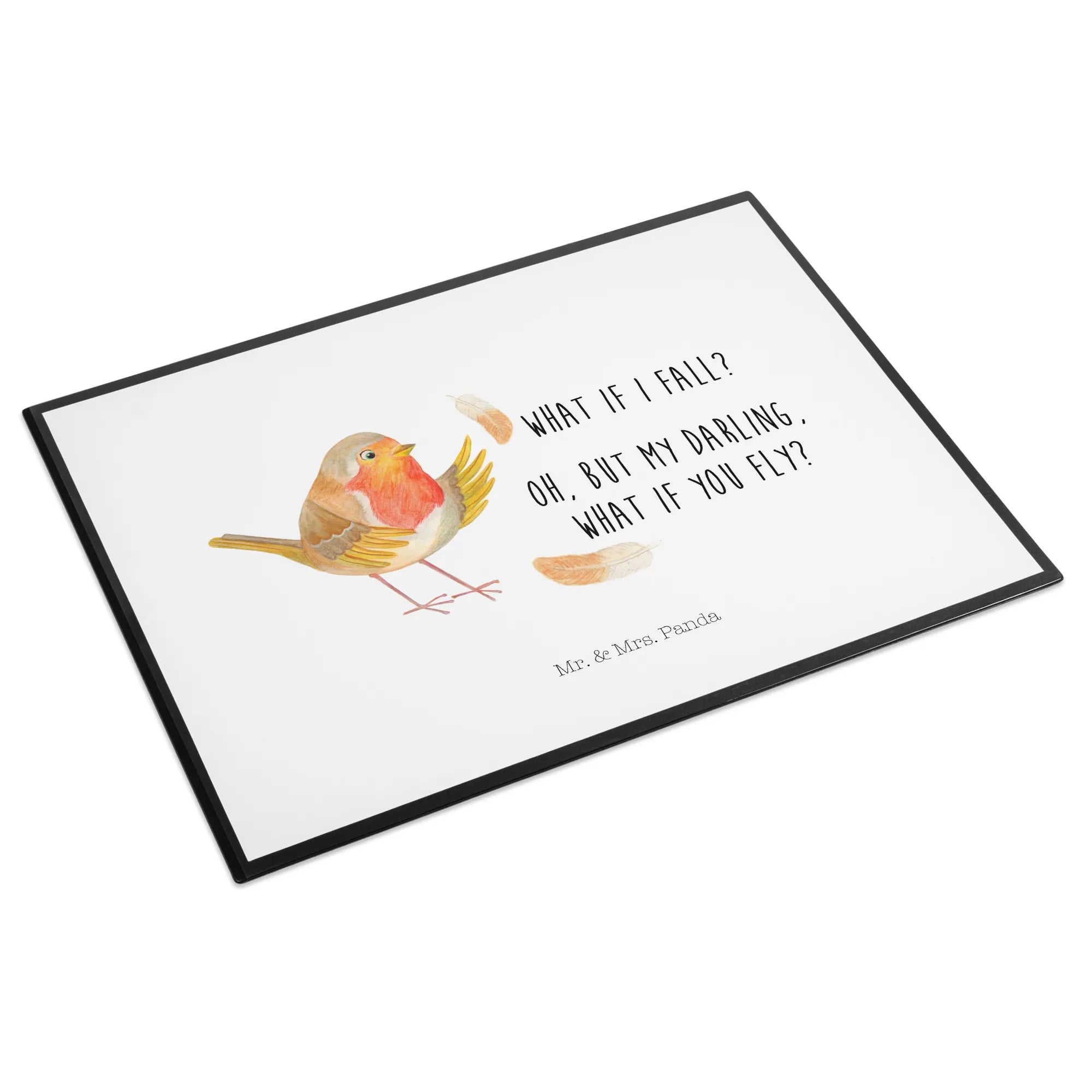 Die Schreibtischunterlage "Rotkehlchen mit Federn" aus der zauberhaften Small World Kollektion von Mr. & Mrs. Panda ist der perfekte Begleiter für deinen Schreibtisch. Sie bietet nicht nur einen idealen Schutz für deine Arbeitsfläche, sondern bringt auch Freude und Motivation in deinen Alltag. Das niedliche Rotkehlchen, liebevoll von Hand gezeichnet, umgeben von bunten Federn, strahlt eine Einladung zur Entspannung und Kreativität aus. Der inspirierende Spruch "What if I fall? Oh, but my darling, what if you fly?" erinnert dich daran, im Leben mutig zu sein und deine Träume zu verwirklichen.