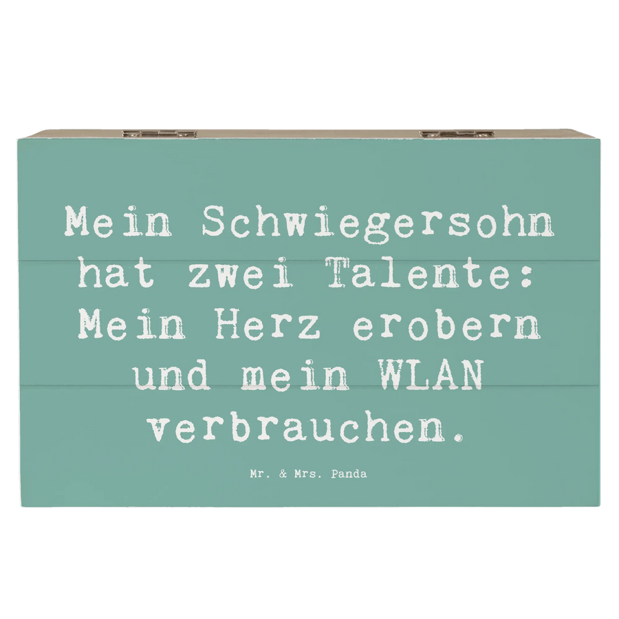 Die wunderschöne Holzkiste von Mr. & Mrs. Panda ist das perfekte Geschenk für Deinen Schwiegersohn! Mit dem charmanten Spruch 'Mein Schwiegersohn hat zwei Talente: Mein Herz erobern und mein WLAN verbrauchen.' wird diese Kiste zu einem unvergesslichen Erinnerungsstück. Perfekt für alle Anlässe, sei es zum Geburtstag oder einfach nur, um Deine Wertschätzung für ihn auszudrücken.