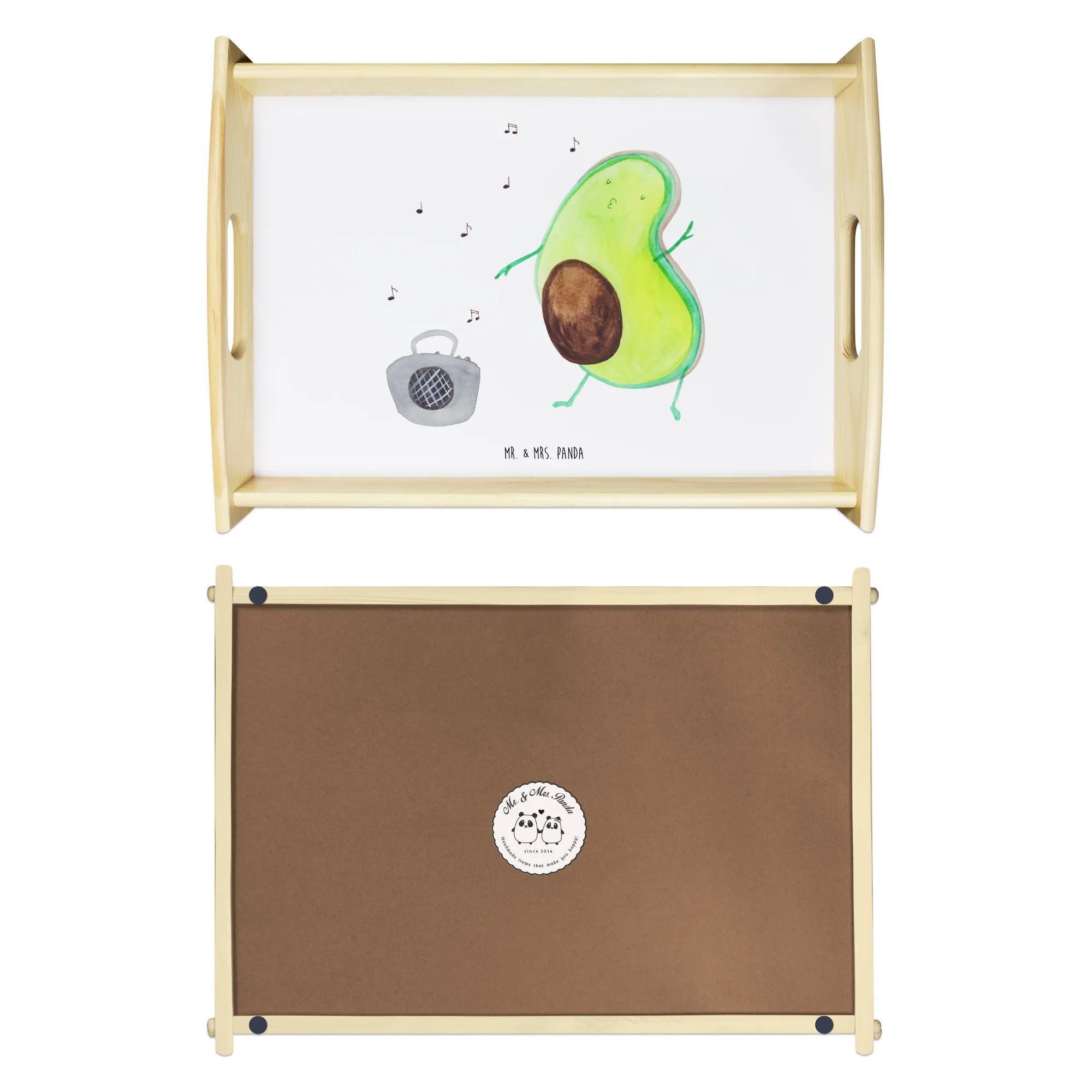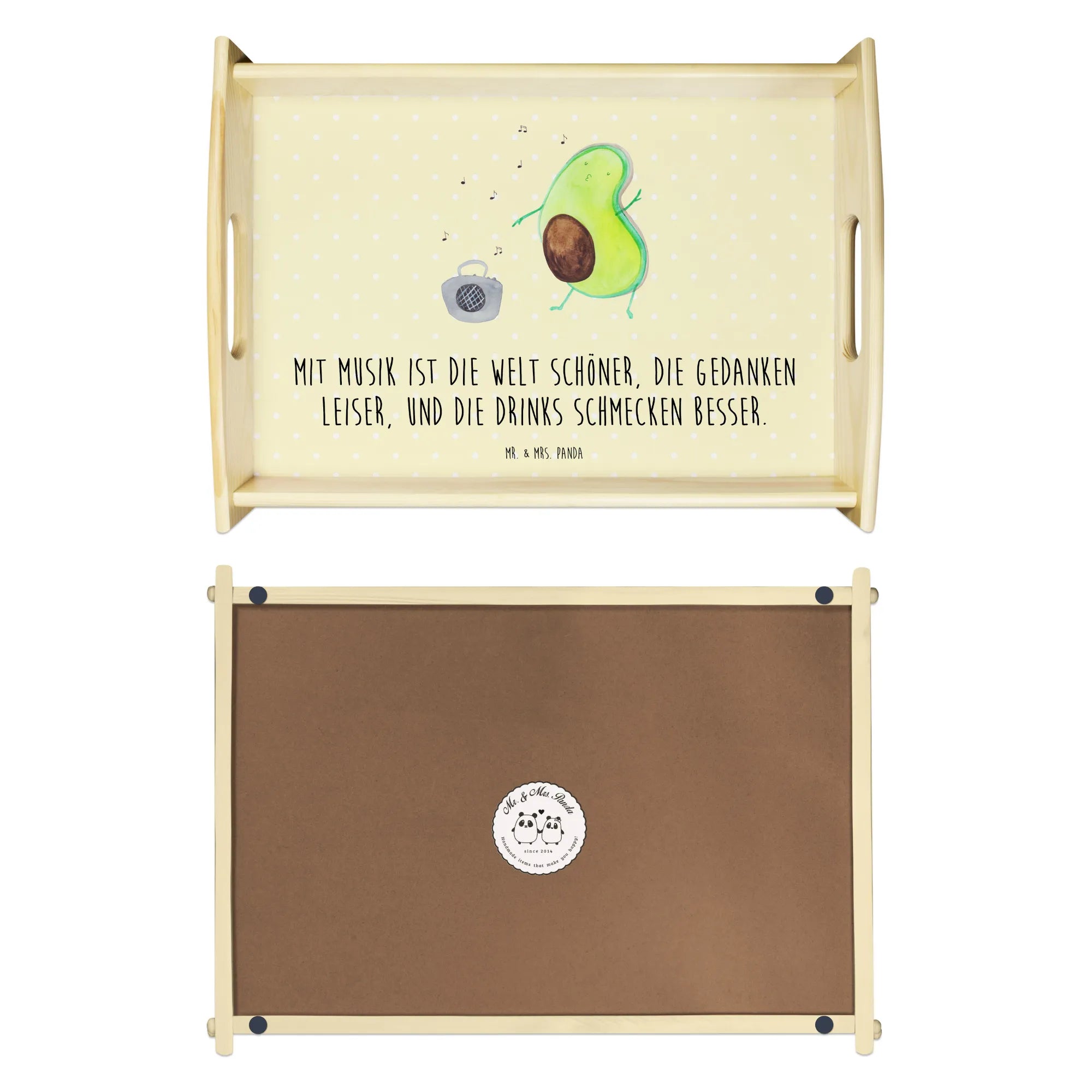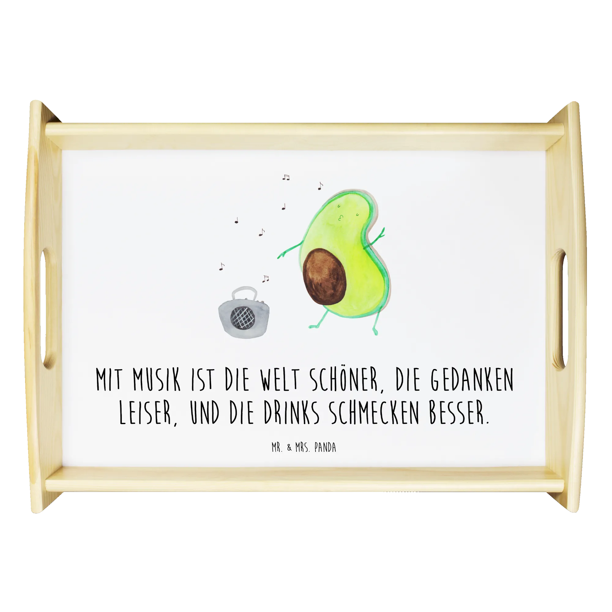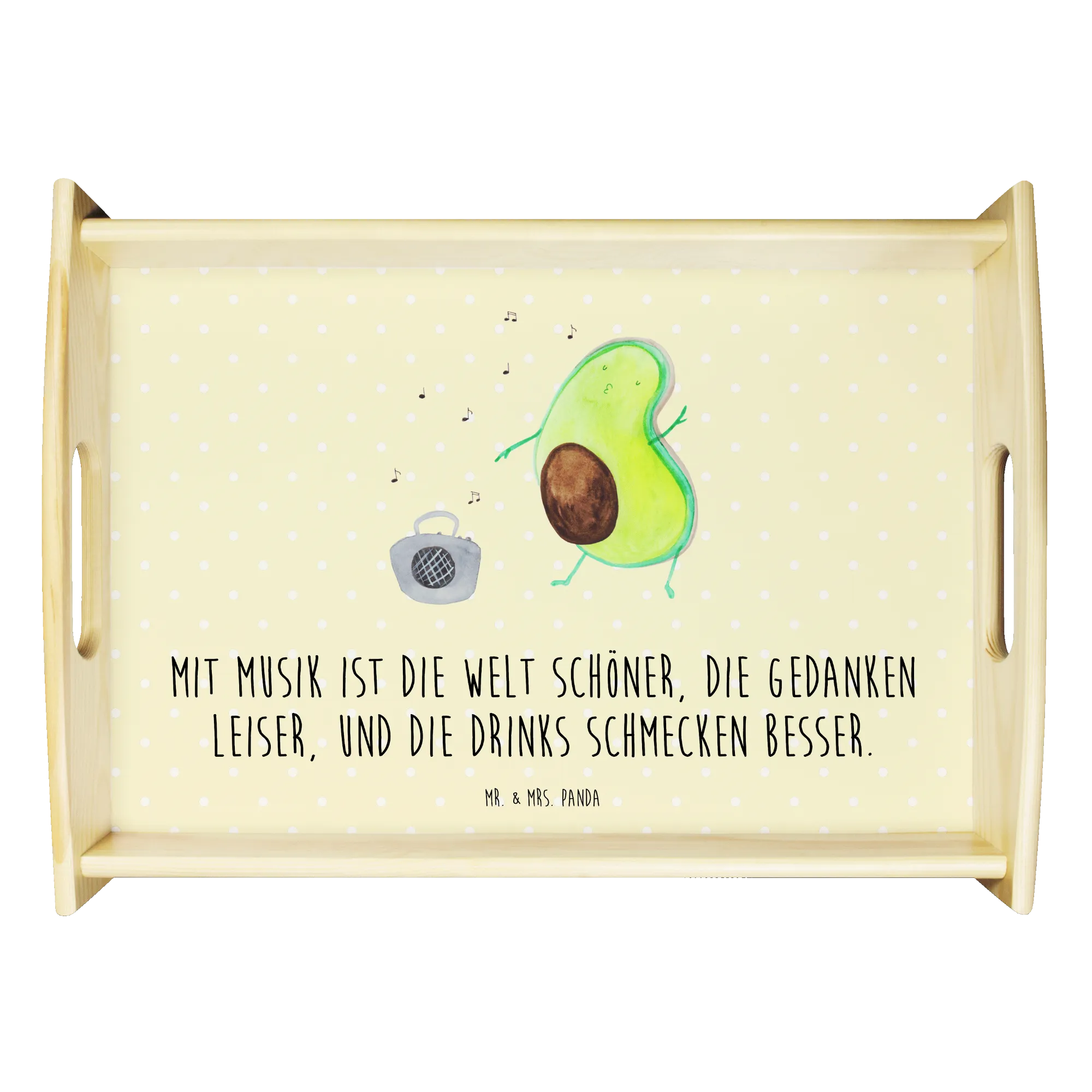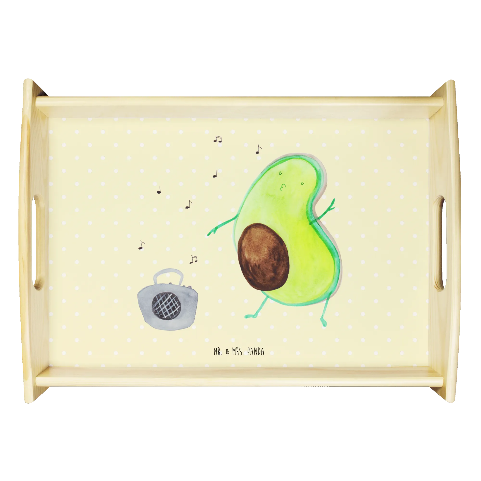 Das Serviertablett "Avocado tanzt" aus der Avocado-Kollektion von Mr. & Mrs. Panda ist nicht nur ein praktisches Küchenutensil, sondern auch ein wunderbares Geschenk für alle, die gesunde Ernährung und kreative Designs lieben. Mit einem brillanten Aufdruck einer tanzenden Avocado, die vor einem Ghettoblaster tanzt, zaubert dieses Tischtablett sofort ein Lächeln in jedes Gesicht.