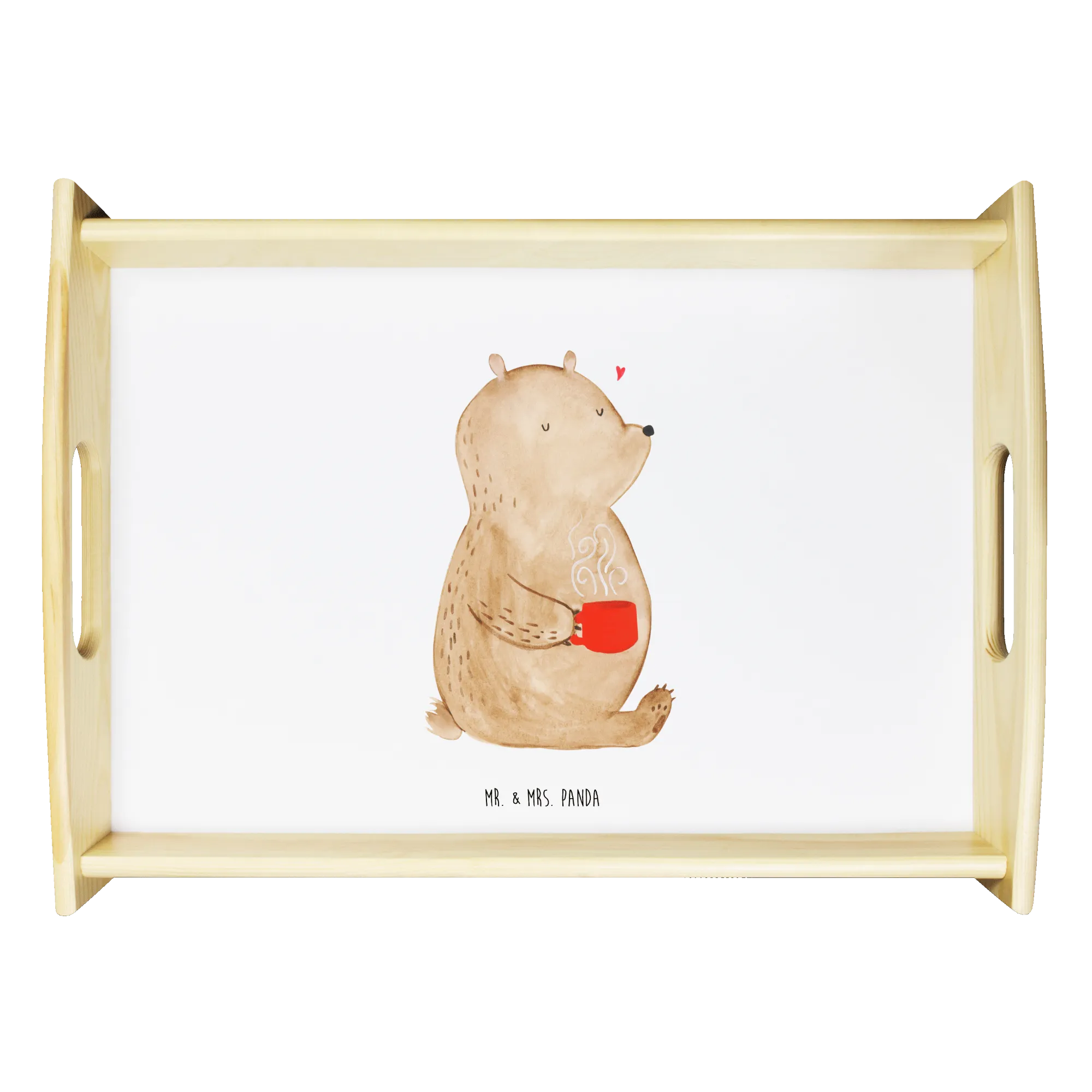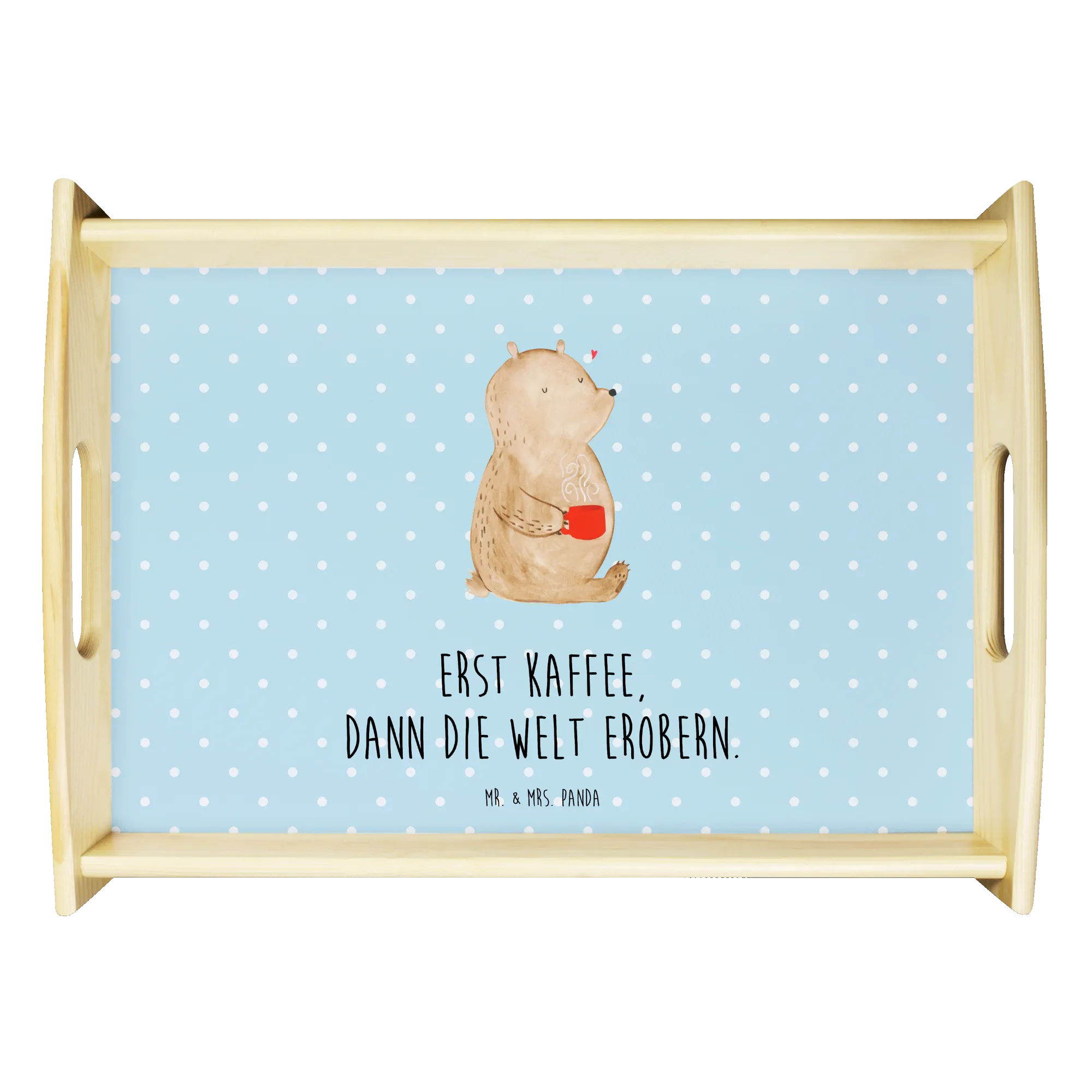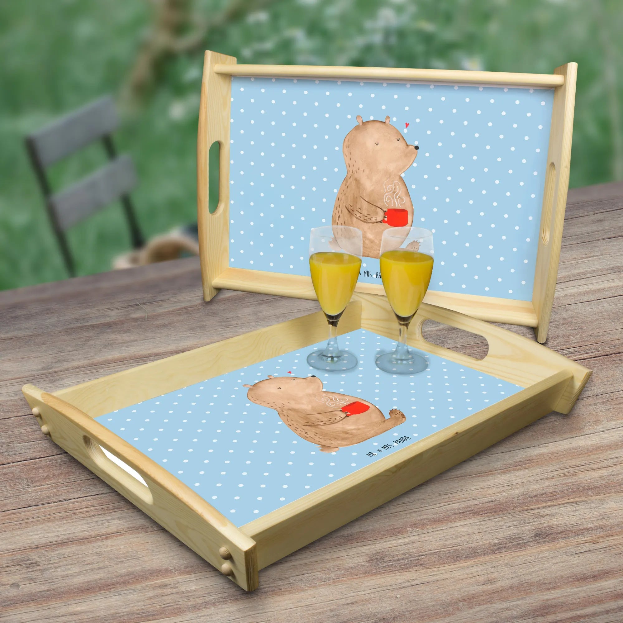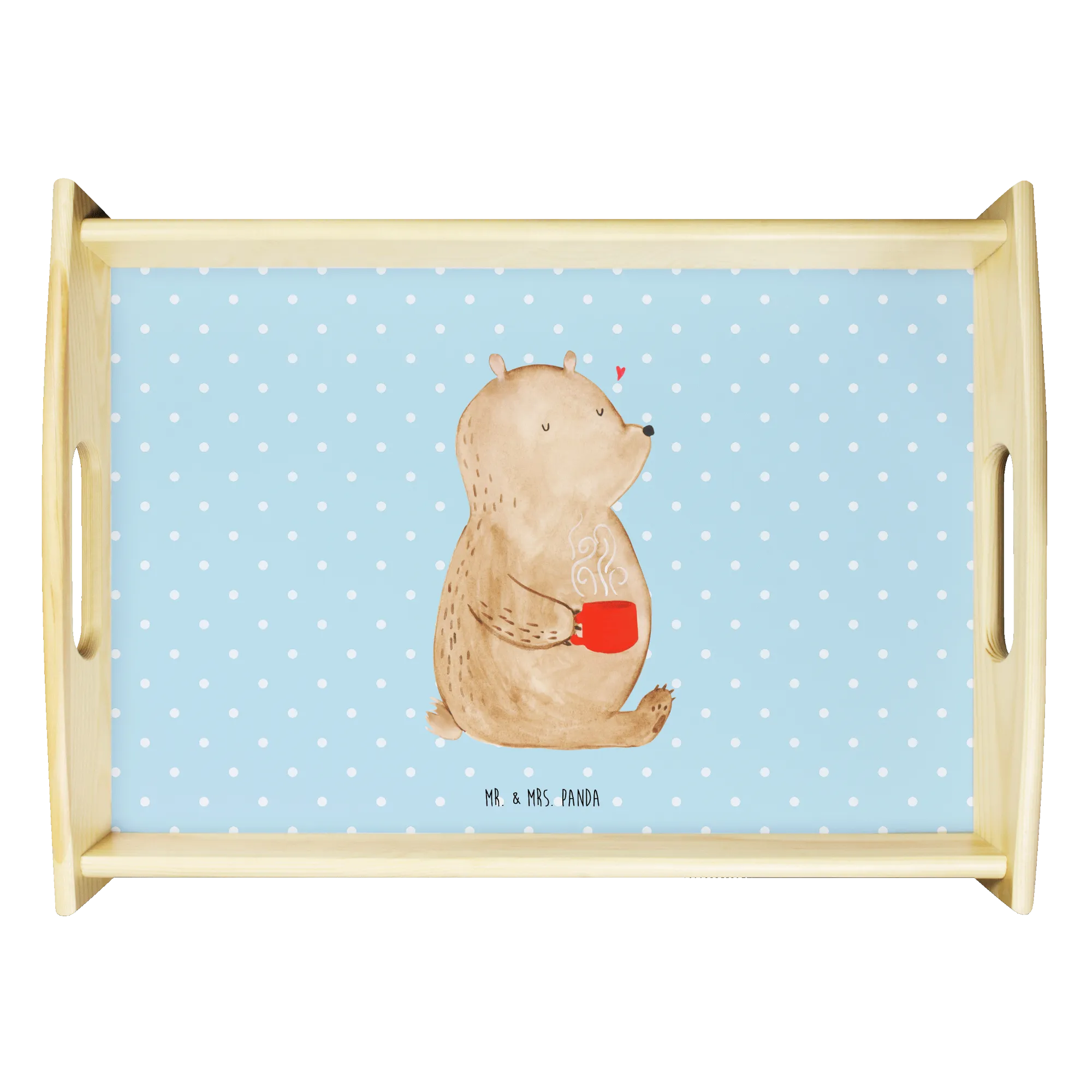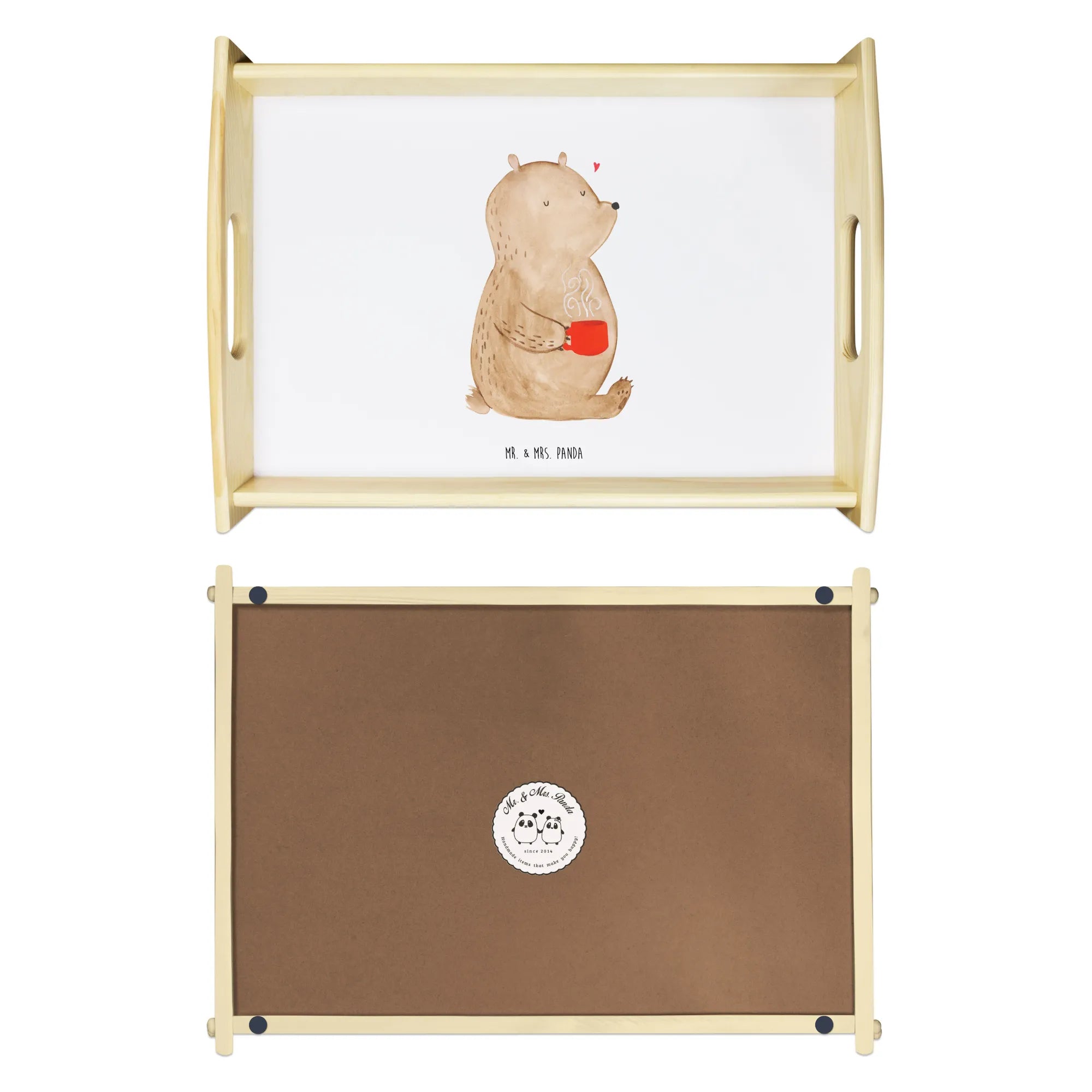 Das einzigartige Serviertablett von Mr. & Mrs. Panda wird dein Frühstücksbuffet zum Erlebnis machen! Mit seinen großzügigen Maßen von 480 mm x 480 mm x 65 mm und einem Gewicht von 925 g ist es die perfekte Kombination aus Funktionalität und Stil. Aus hochwertigem, lasiertem Echtholz gefertigt, verzückt das Tablett mit einem strahlenden Druck, der für gute Laune sorgt. Ob im Bett oder auf dem Sofa, die seitlichen Griffmulden garantieren ein angenehmes Handling. Die spezielle Anti-Rutsch Beschichtung sorgt dafür, dass alles sicher an seinem Platz bleibt. Dank der kratzfesten Oberfläche ist das Tablett sehr pflegeleicht – einfach mit einem feuchten Tuch und etwas Spülmittel abwischen. Bitte nicht einweichen! Denke daran, dass die Anfertigung wegen der hohen Qualität etwas Zeit in Anspruch nimmt.
