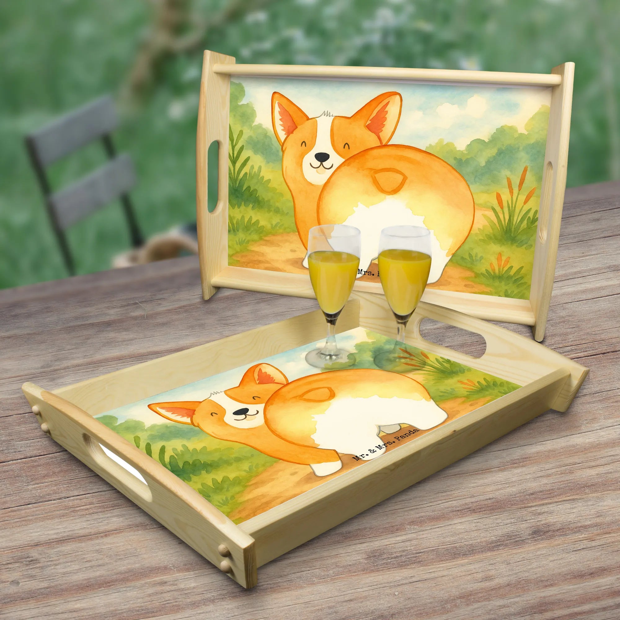 Das einzigartige Serviertablett von Mr. & Mrs. Panda wird dein Frühstücksbuffet zum Erlebnis machen! Mit seinen großzügigen Maßen von 480 mm x 480 mm x 65 mm und einem Gewicht von 925 g ist es die perfekte Kombination aus Funktionalität und Stil. Aus hochwertigem, lasiertem Echtholz gefertigt, verzückt das Tablett mit einem strahlenden Druck, der für gute Laune sorgt. Ob im Bett oder auf dem Sofa, die seitlichen Griffmulden garantieren ein angenehmes Handling. Die spezielle Anti-Rutsch Beschichtung sorgt dafür, dass alles sicher an seinem Platz bleibt. Dank der kratzfesten Oberfläche ist das Tablett sehr pflegeleicht – einfach mit einem feuchten Tuch und etwas Spülmittel abwischen. Bitte nicht einweichen! Denke daran, dass die Anfertigung wegen der hohen Qualität etwas Zeit in Anspruch nimmt.