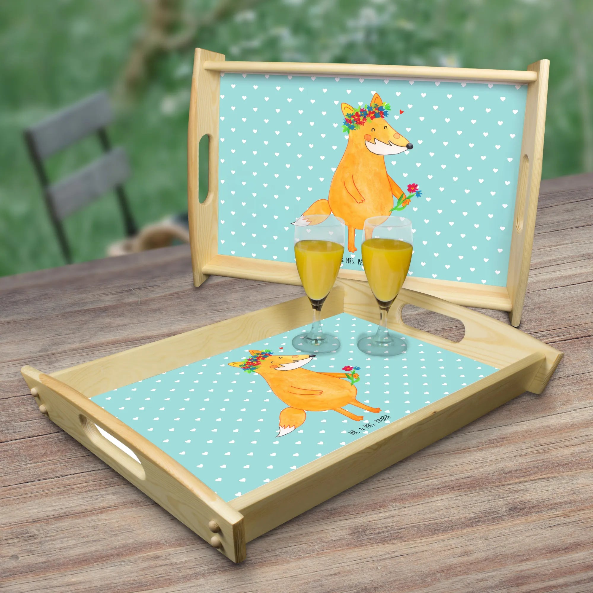 Verwöhne Deine Liebsten mit unserem bezaubernden Serviertablett von Mr. & Mrs. Panda! Mit den Maßen von 480 mm x 480 mm x 65 mm und einem gewicht von 925 g ist es nicht nur hübsch, sondern auch praktisch. Aus lasiertem Echtholz gefertigt, begeistert es mit einem lebendigen Druck, der gute Stimmung verbreitet. Egal ob beim Frühstück im Bett oder beim gemütlichen Abendessen auf dem Sofa – die seitlichen Griffmulden ermöglichen ein einfaches Tragen. Die Anti-Rutsch Pads auf der Unterseite sorgen dafür, dass alles sicher an seinem Platz bleibt. Dank der kratzfesten Oberfläche bleibt dein Tablett nach jeder Benutzung in bestem Zustand – einfach mit einem feuchten Tuch und Spülmittel abwischen, aber nicht einweichen! Beachte bitte die längere Anfertigungszeit aufgrund der besonderen Verarbeitung.
