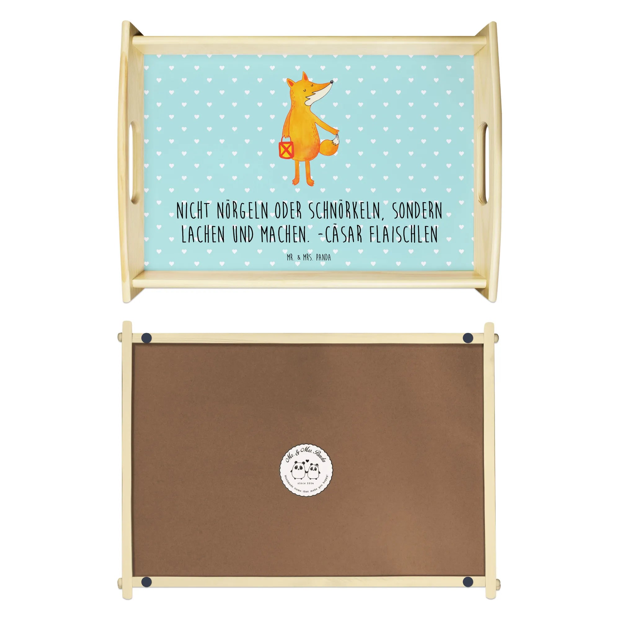 Verwöhne Deine Liebsten mit unserem bezaubernden Serviertablett von Mr. & Mrs. Panda! Mit den Maßen von 480 mm x 480 mm x 65 mm und einem gewicht von 925 g ist es nicht nur hübsch, sondern auch praktisch. Aus lasiertem Echtholz gefertigt, begeistert es mit einem lebendigen Druck, der gute Stimmung verbreitet. Egal ob beim Frühstück im Bett oder beim gemütlichen Abendessen auf dem Sofa – die seitlichen Griffmulden ermöglichen ein einfaches Tragen. Die Anti-Rutsch Pads auf der Unterseite sorgen dafür, dass alles sicher an seinem Platz bleibt. Dank der kratzfesten Oberfläche bleibt dein Tablett nach jeder Benutzung in bestem Zustand – einfach mit einem feuchten Tuch und Spülmittel abwischen, aber nicht einweichen! Beachte bitte die längere Anfertigungszeit aufgrund der besonderen Verarbeitung.