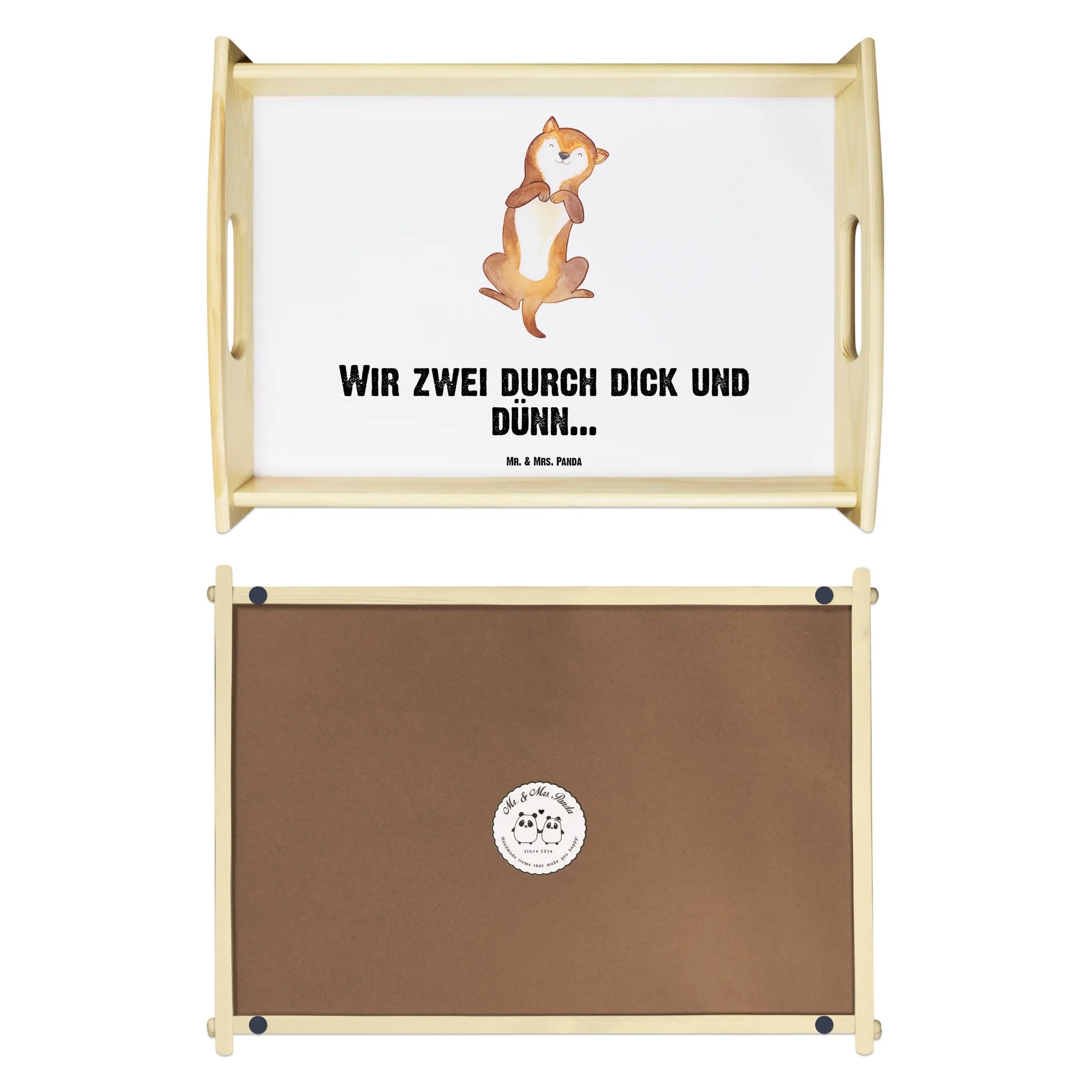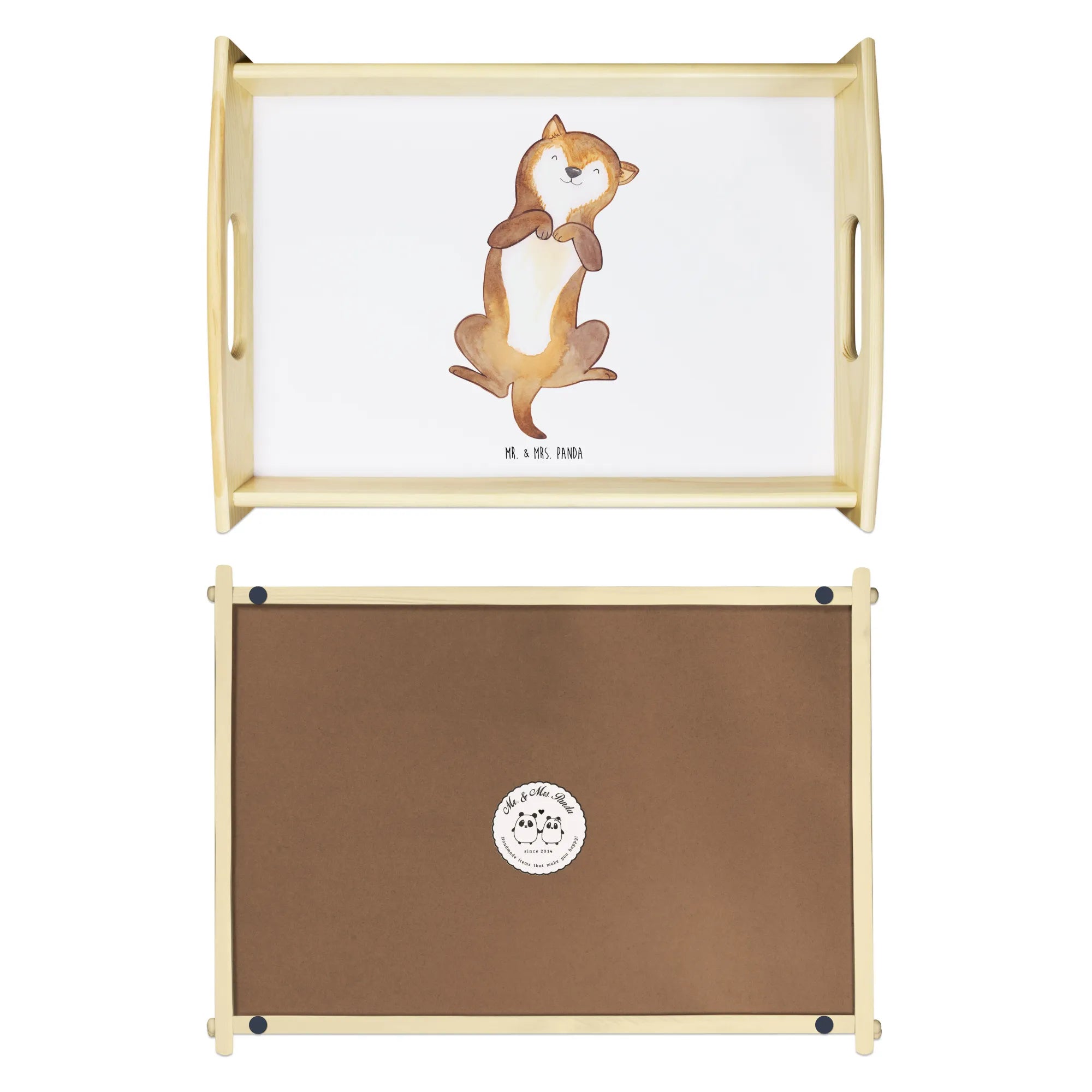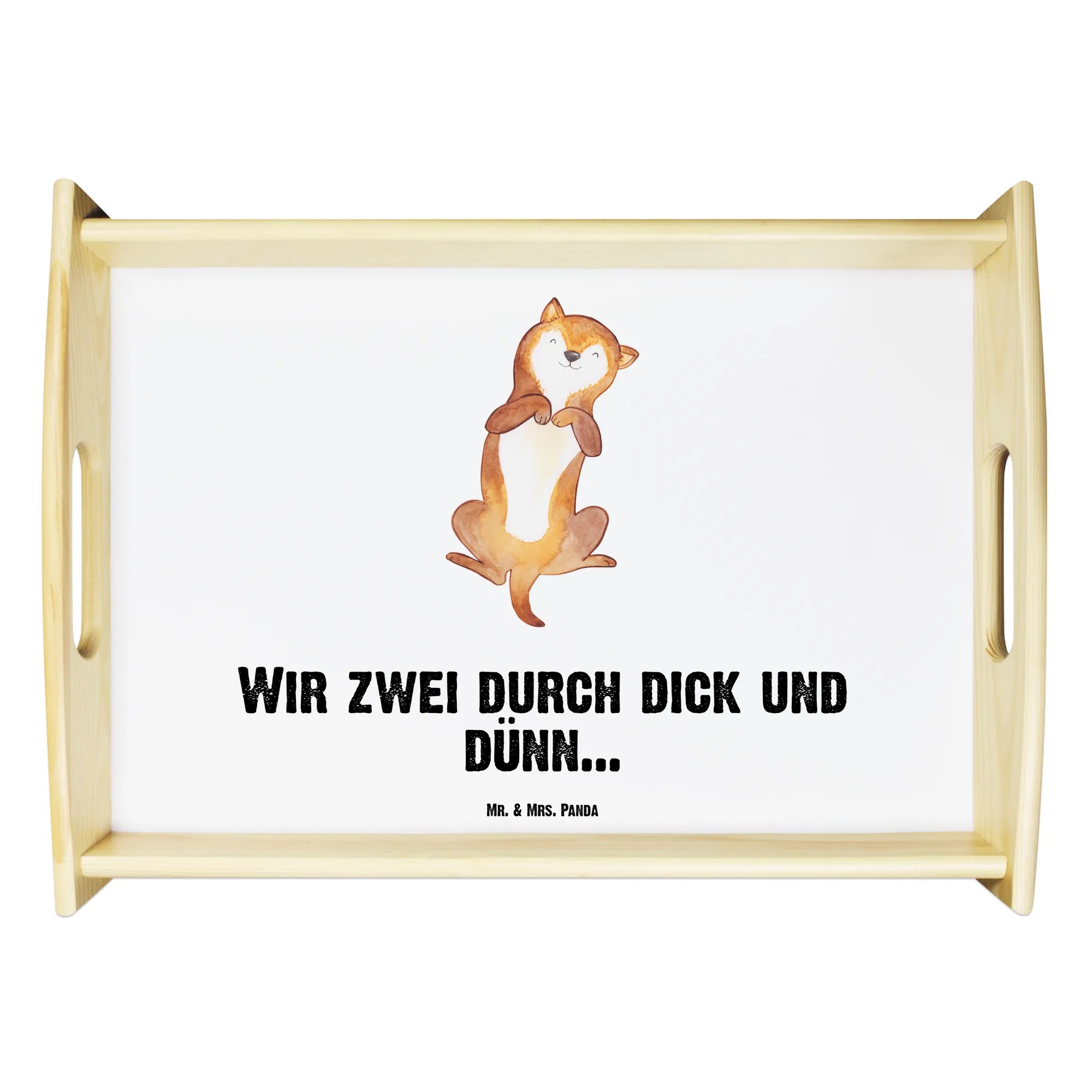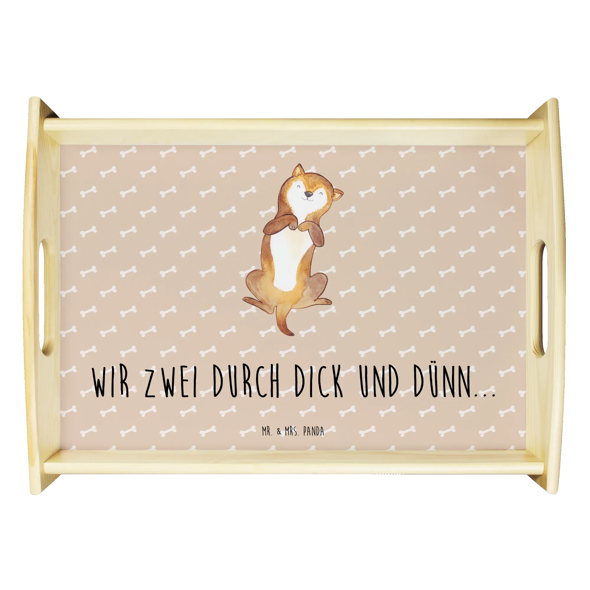 Verwöhne Deine Liebsten mit unserem bezaubernden Serviertablett von Mr. & Mrs. Panda! Mit den Maßen von 480 mm x 480 mm x 65 mm und einem gewicht von 925 g ist es nicht nur hübsch, sondern auch praktisch. Aus lasiertem Echtholz gefertigt, begeistert es mit einem lebendigen Druck, der gute Stimmung verbreitet. Egal ob beim Frühstück im Bett oder beim gemütlichen Abendessen auf dem Sofa – die seitlichen Griffmulden ermöglichen ein einfaches Tragen. Die Anti-Rutsch Pads auf der Unterseite sorgen dafür, dass alles sicher an seinem Platz bleibt. Dank der kratzfesten Oberfläche bleibt dein Tablett nach jeder Benutzung in bestem Zustand – einfach mit einem feuchten Tuch und Spülmittel abwischen, aber nicht einweichen! Beachte bitte die längere Anfertigungszeit aufgrund der besonderen Verarbeitung.