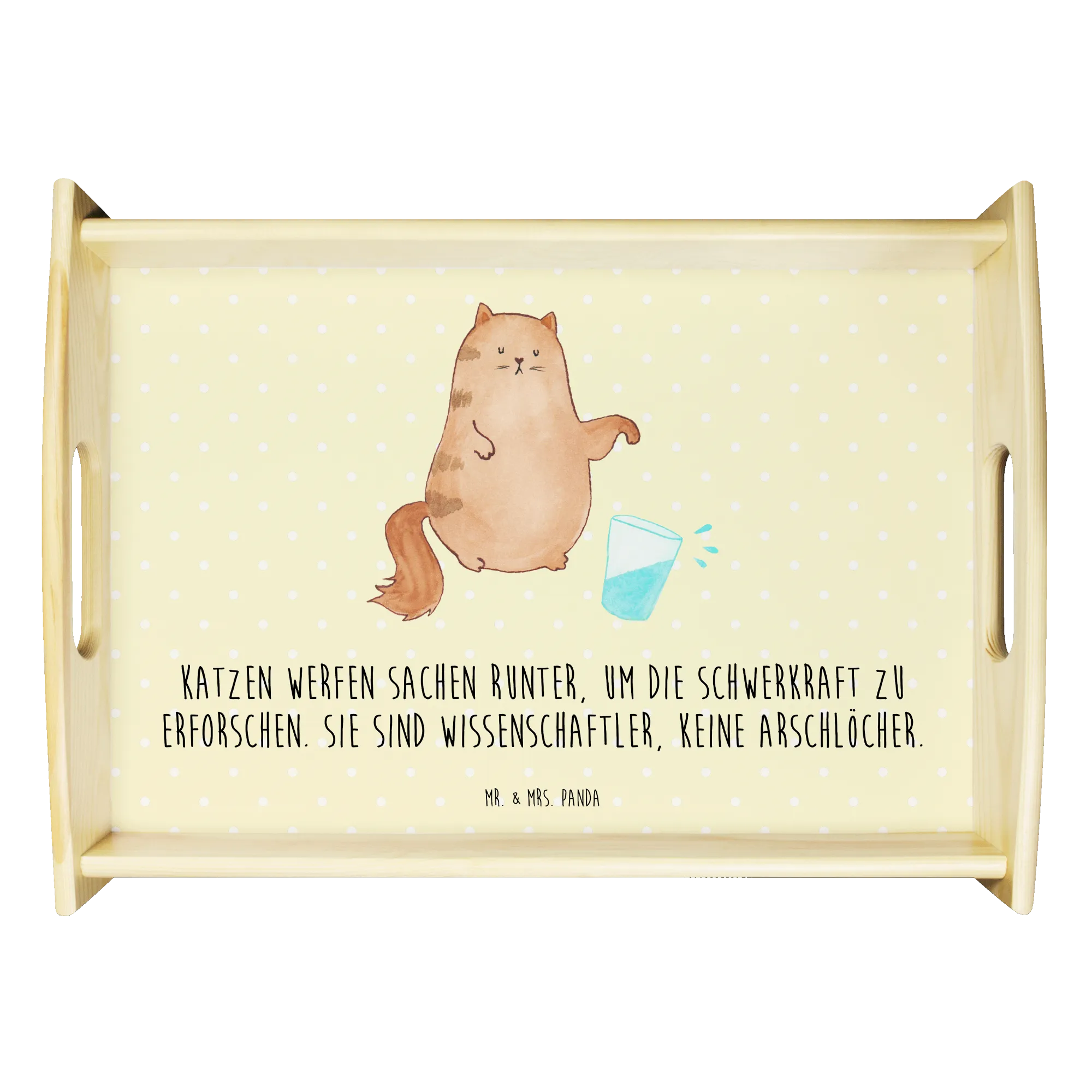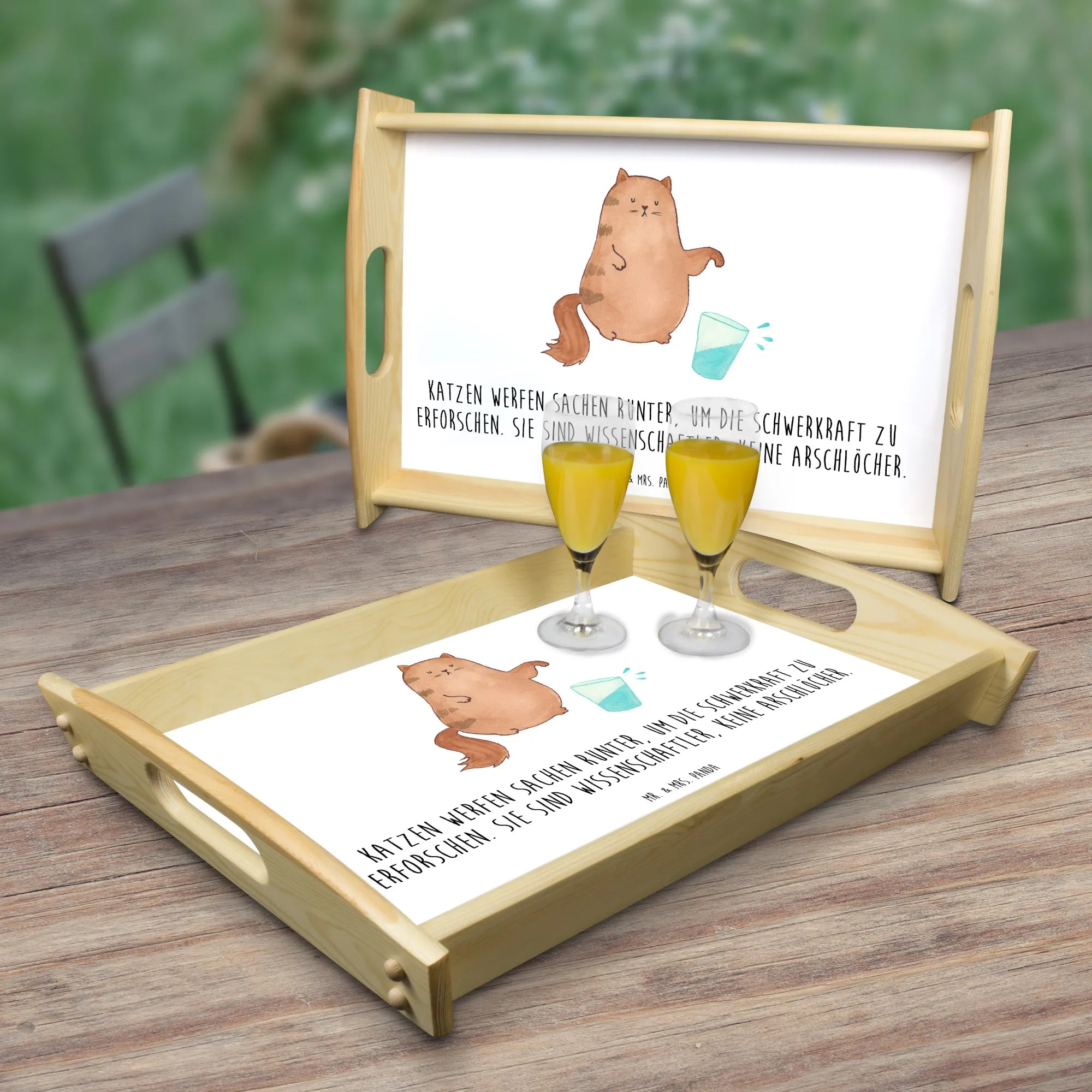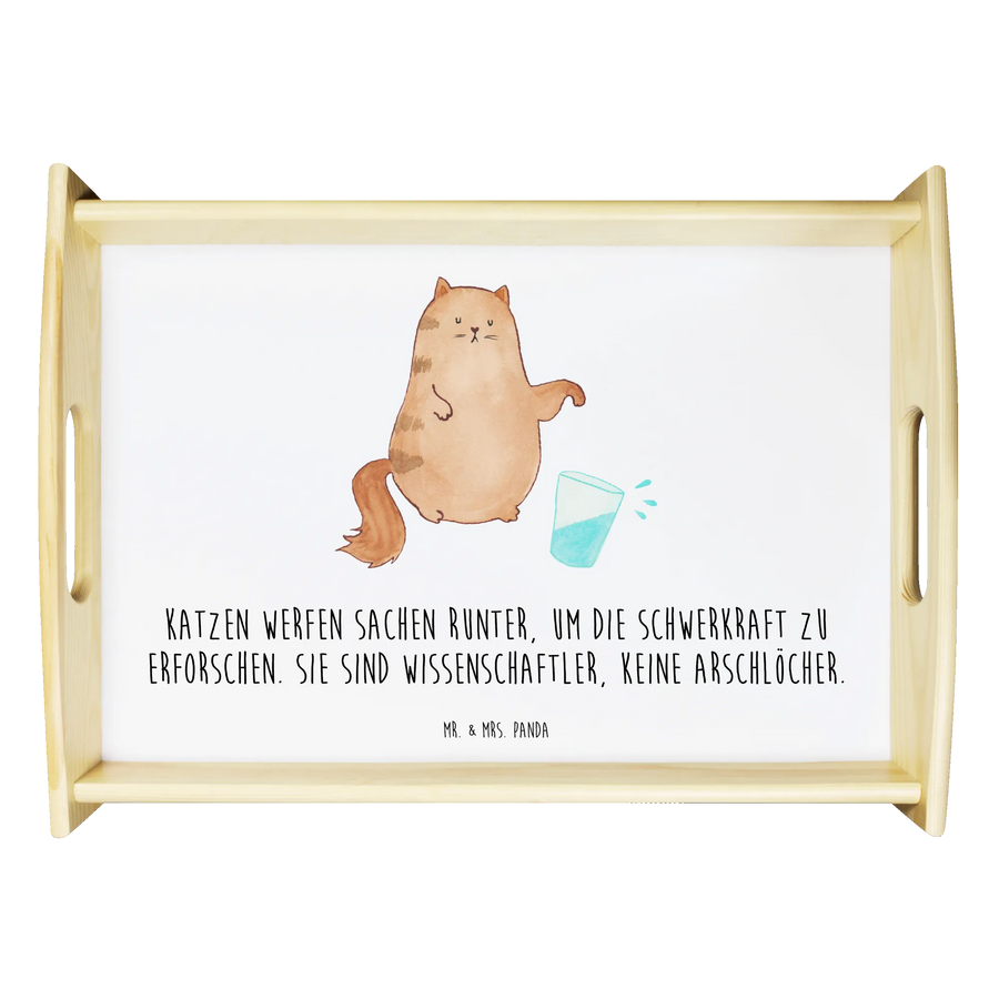 Dieses wunderschöne und praktische Holztablett ist nicht nur ein echter Blickfang, sondern bietet auch Platz für all deine leckeren Snacks, das Frühstück im Bett oder den nachmittäglichen Tee. Das Design zeigt eine niedliche Katze, die ein Wasserglas umstößt. Ein humorvoller Hinweis darauf, wie neugierig und verspielt Katzen sind. Das dazugehörige Motto lautet: "Katzen werfen Sachen runter, um die Schwerkraft zu erforschen. Sie sind Wissenschaftler, keine Arschlöcher." Ein absoluter Lacher für jeden Katzenfreund!