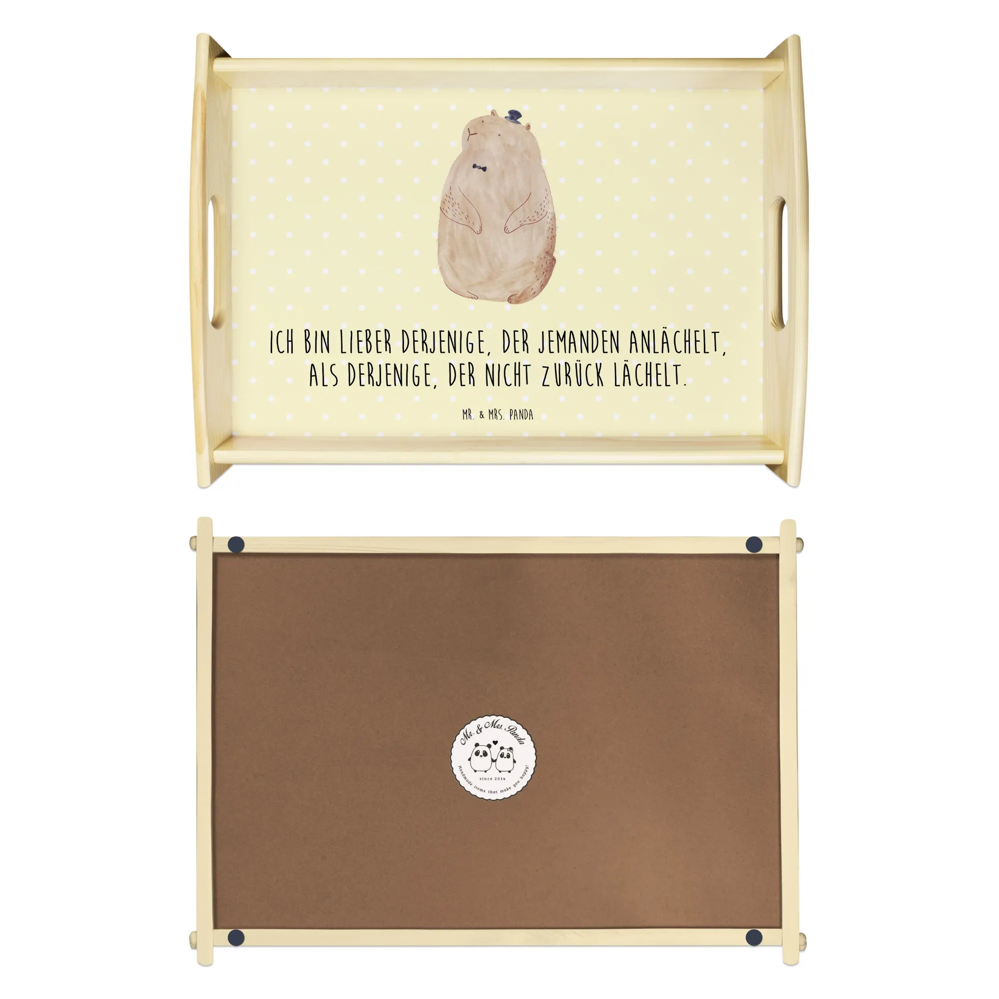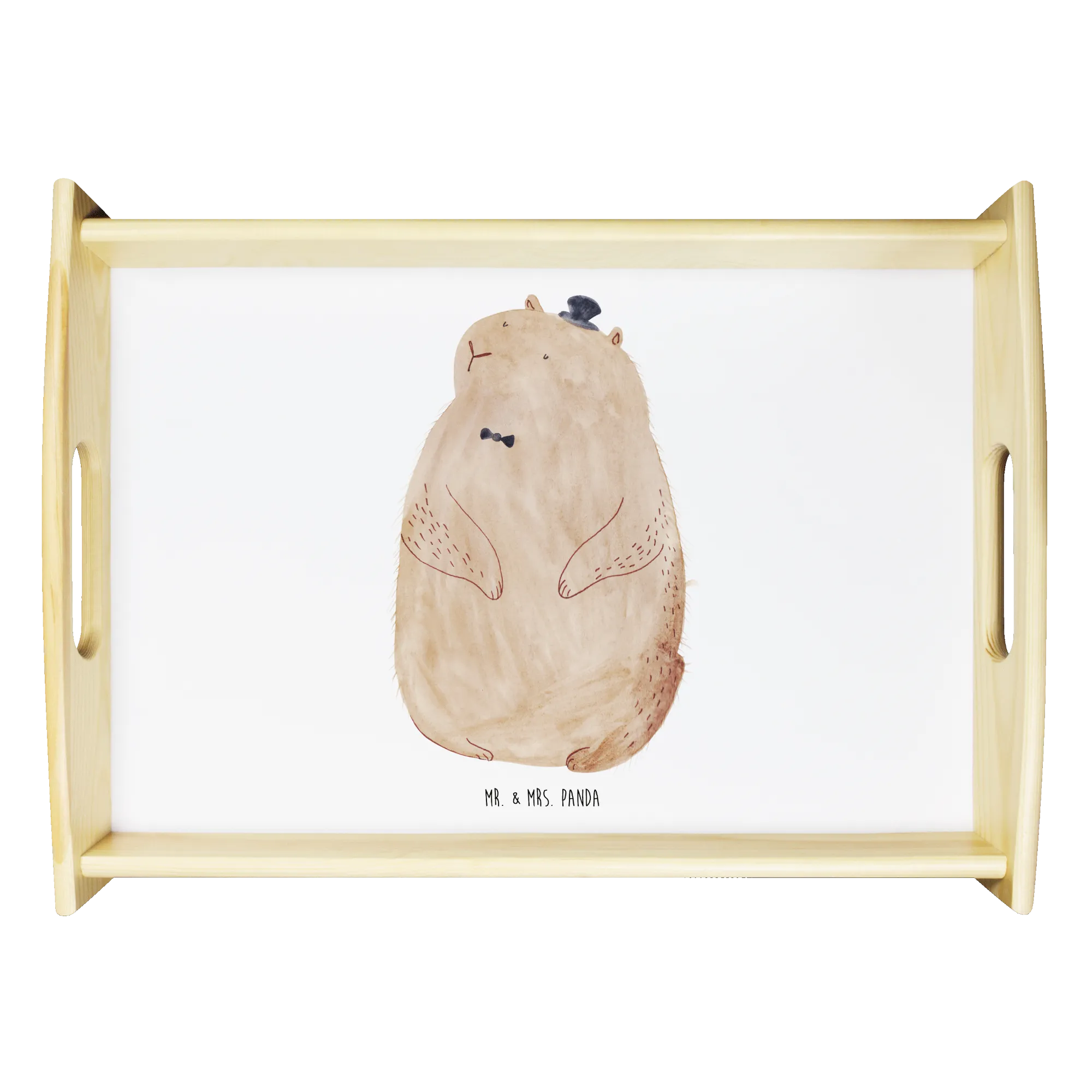 Verwöhne Deine Liebsten mit unserem bezaubernden Serviertablett von Mr. & Mrs. Panda! Mit den Maßen von 480 mm x 480 mm x 65 mm und einem gewicht von 925 g ist es nicht nur hübsch, sondern auch praktisch. Aus lasiertem Echtholz gefertigt, begeistert es mit einem lebendigen Druck, der gute Stimmung verbreitet. Egal ob beim Frühstück im Bett oder beim gemütlichen Abendessen auf dem Sofa – die seitlichen Griffmulden ermöglichen ein einfaches Tragen. Die Anti-Rutsch Pads auf der Unterseite sorgen dafür, dass alles sicher an seinem Platz bleibt. Dank der kratzfesten Oberfläche bleibt dein Tablett nach jeder Benutzung in bestem Zustand – einfach mit einem feuchten Tuch und Spülmittel abwischen, aber nicht einweichen! Beachte bitte die längere Anfertigungszeit aufgrund der besonderen Verarbeitung.