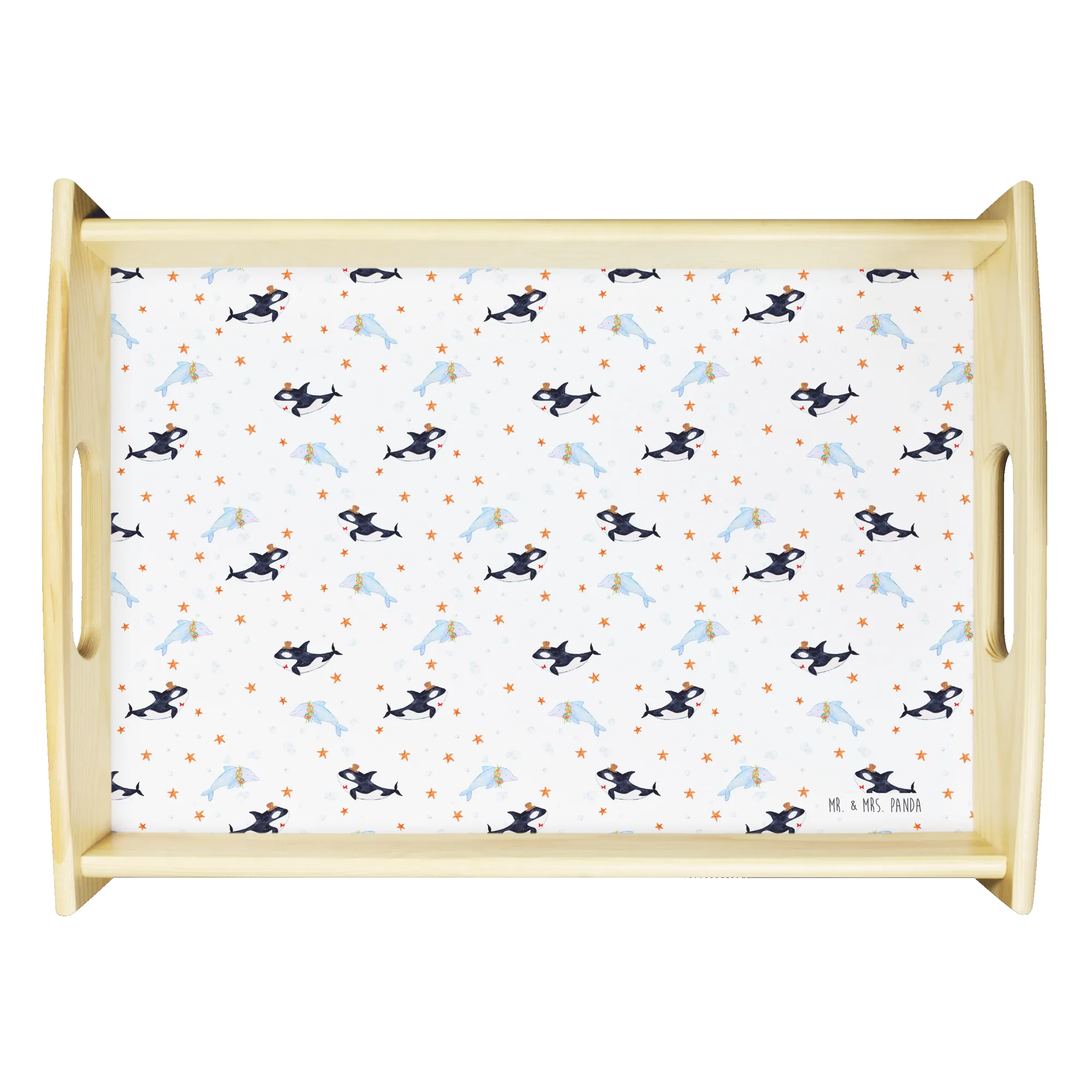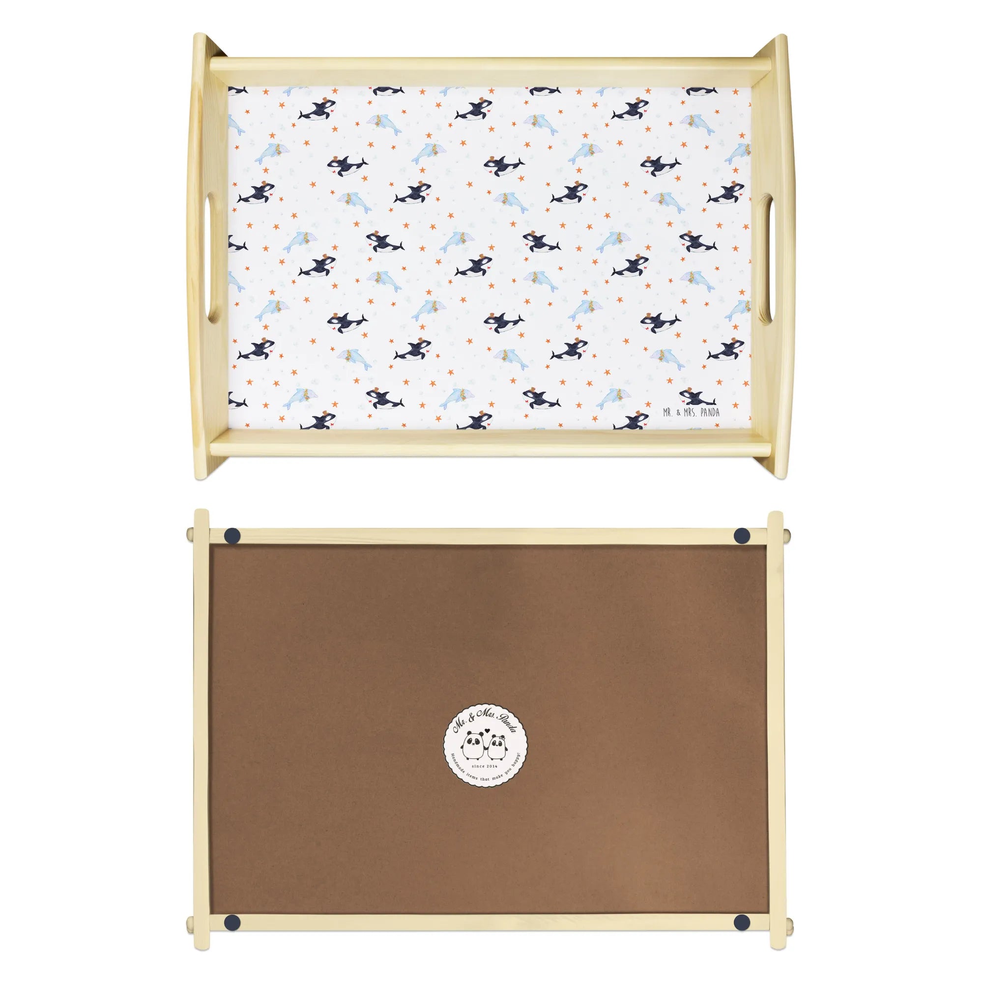 Verwöhne Deine Liebsten mit unserem bezaubernden Serviertablett von Mr. & Mrs. Panda! Mit den Maßen von 480 mm x 480 mm x 65 mm und einem gewicht von 925 g ist es nicht nur hübsch, sondern auch praktisch. Aus lasiertem Echtholz gefertigt, begeistert es mit einem lebendigen Druck, der gute Stimmung verbreitet. Egal ob beim Frühstück im Bett oder beim gemütlichen Abendessen auf dem Sofa – die seitlichen Griffmulden ermöglichen ein einfaches Tragen. Die Anti-Rutsch Pads auf der Unterseite sorgen dafür, dass alles sicher an seinem Platz bleibt. Dank der kratzfesten Oberfläche bleibt dein Tablett nach jeder Benutzung in bestem Zustand – einfach mit einem feuchten Tuch und Spülmittel abwischen, aber nicht einweichen! Beachte bitte die längere Anfertigungszeit aufgrund der besonderen Verarbeitung.