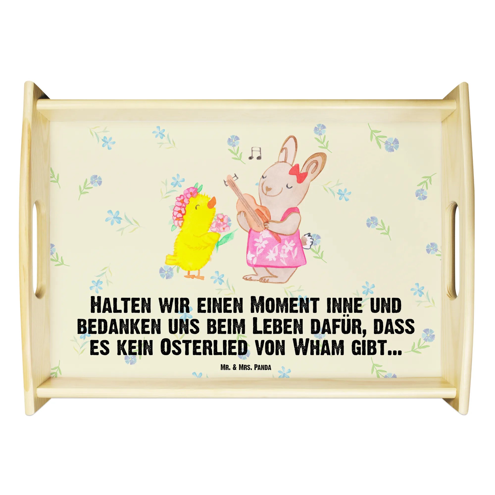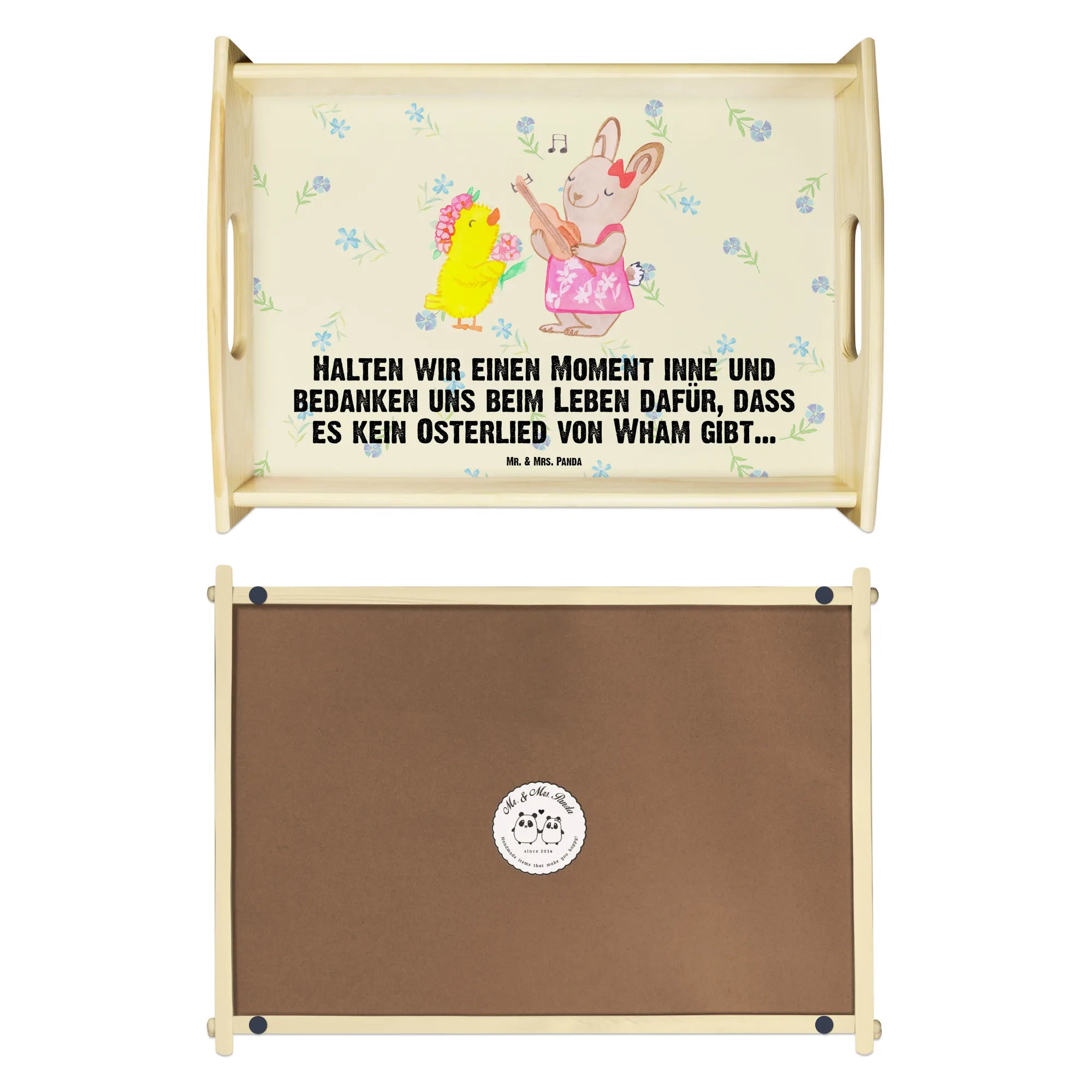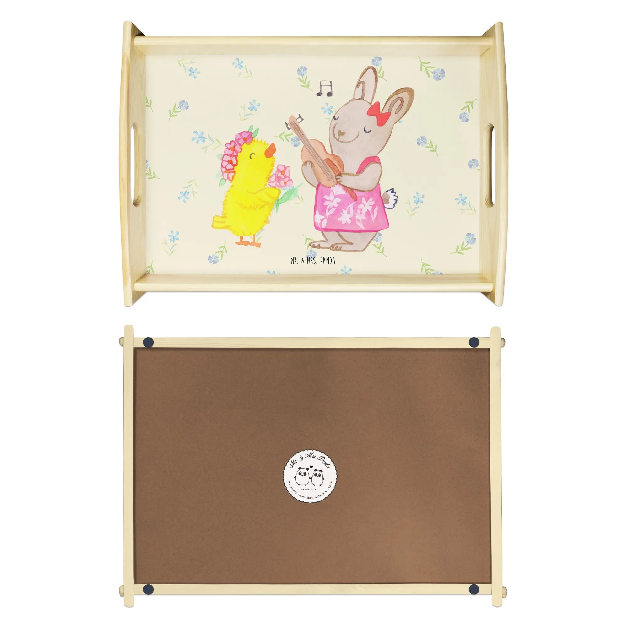 Verwöhne Deine Liebsten mit unserem bezaubernden Serviertablett von Mr. & Mrs. Panda! Mit den Maßen von 480 mm x 480 mm x 65 mm und einem gewicht von 925 g ist es nicht nur hübsch, sondern auch praktisch. Aus lasiertem Echtholz gefertigt, begeistert es mit einem lebendigen Druck, der gute Stimmung verbreitet. Egal ob beim Frühstück im Bett oder beim gemütlichen Abendessen auf dem Sofa – die seitlichen Griffmulden ermöglichen ein einfaches Tragen. Die Anti-Rutsch Pads auf der Unterseite sorgen dafür, dass alles sicher an seinem Platz bleibt. Dank der kratzfesten Oberfläche bleibt dein Tablett nach jeder Benutzung in bestem Zustand – einfach mit einem feuchten Tuch und Spülmittel abwischen, aber nicht einweichen! Beachte bitte die längere Anfertigungszeit aufgrund der besonderen Verarbeitung.
