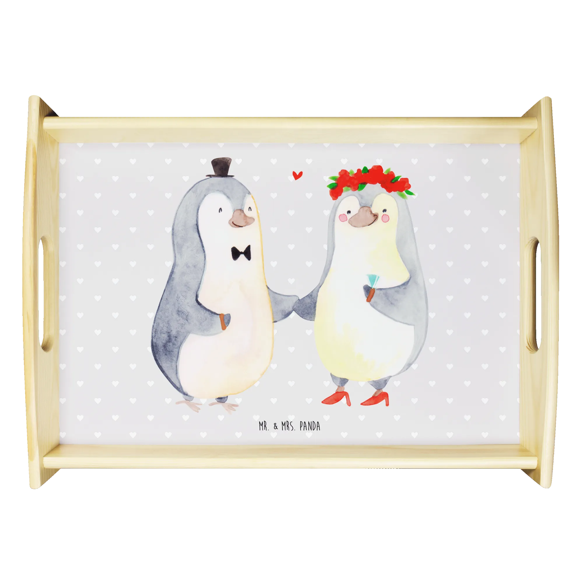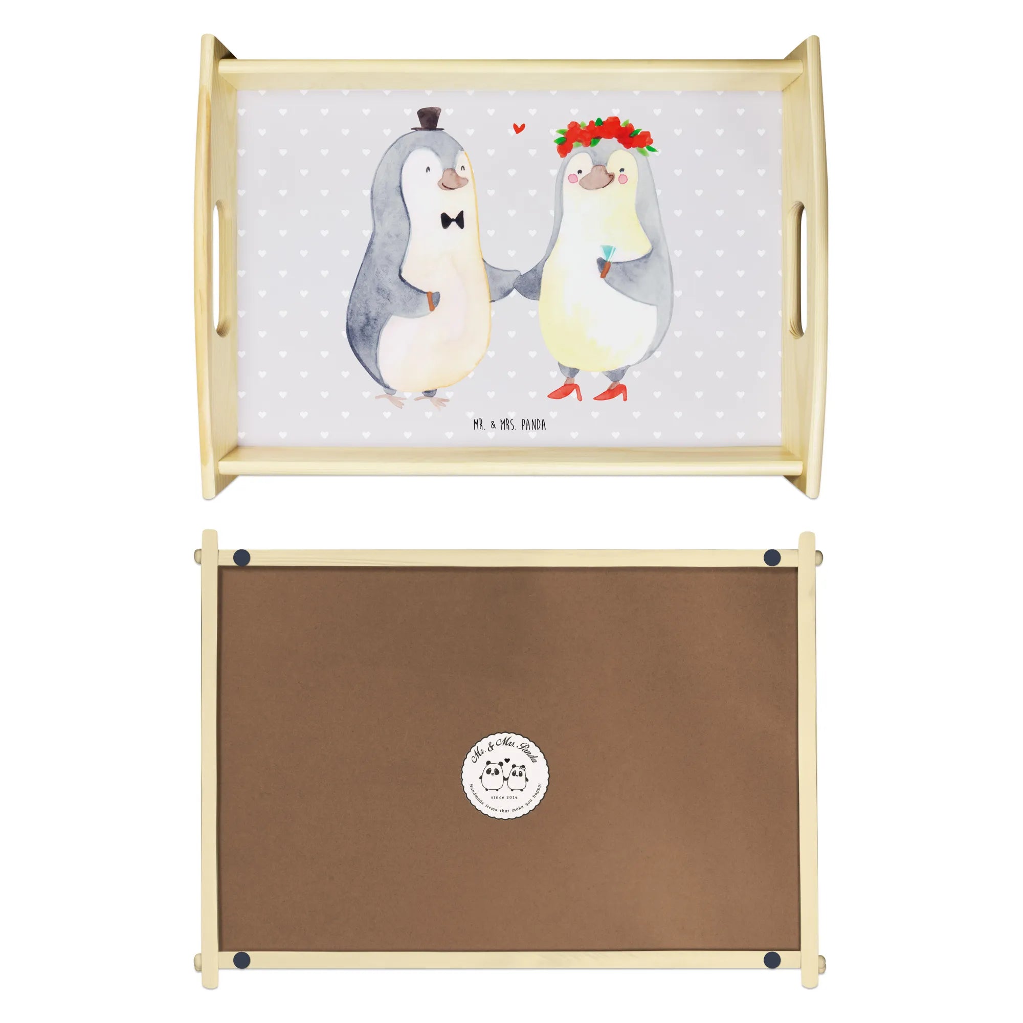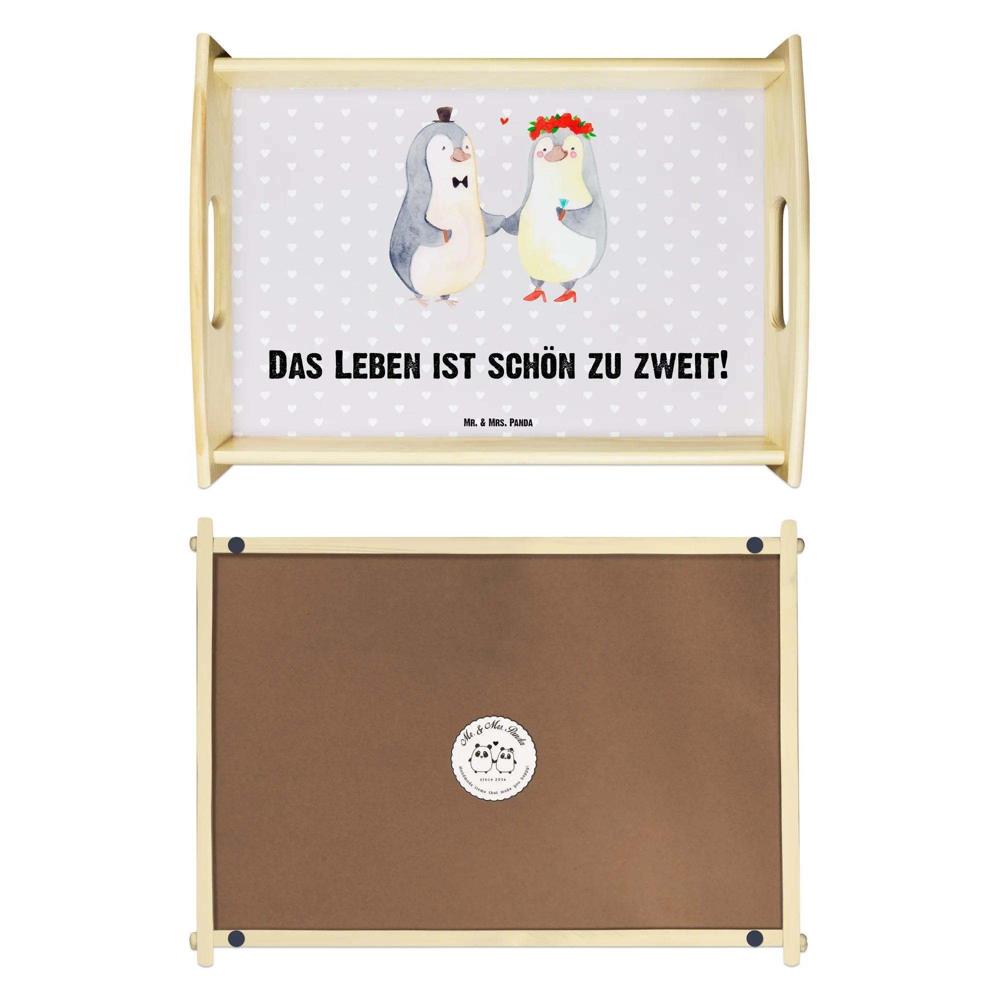 Verwöhne Deine Liebsten mit unserem bezaubernden Serviertablett von Mr. & Mrs. Panda! Mit den Maßen von 480 mm x 480 mm x 65 mm und einem gewicht von 925 g ist es nicht nur hübsch, sondern auch praktisch. Aus lasiertem Echtholz gefertigt, begeistert es mit einem lebendigen Druck, der gute Stimmung verbreitet. Egal ob beim Frühstück im Bett oder beim gemütlichen Abendessen auf dem Sofa – die seitlichen Griffmulden ermöglichen ein einfaches Tragen. Die Anti-Rutsch Pads auf der Unterseite sorgen dafür, dass alles sicher an seinem Platz bleibt. Dank der kratzfesten Oberfläche bleibt dein Tablett nach jeder Benutzung in bestem Zustand – einfach mit einem feuchten Tuch und Spülmittel abwischen, aber nicht einweichen! Beachte bitte die längere Anfertigungszeit aufgrund der besonderen Verarbeitung.