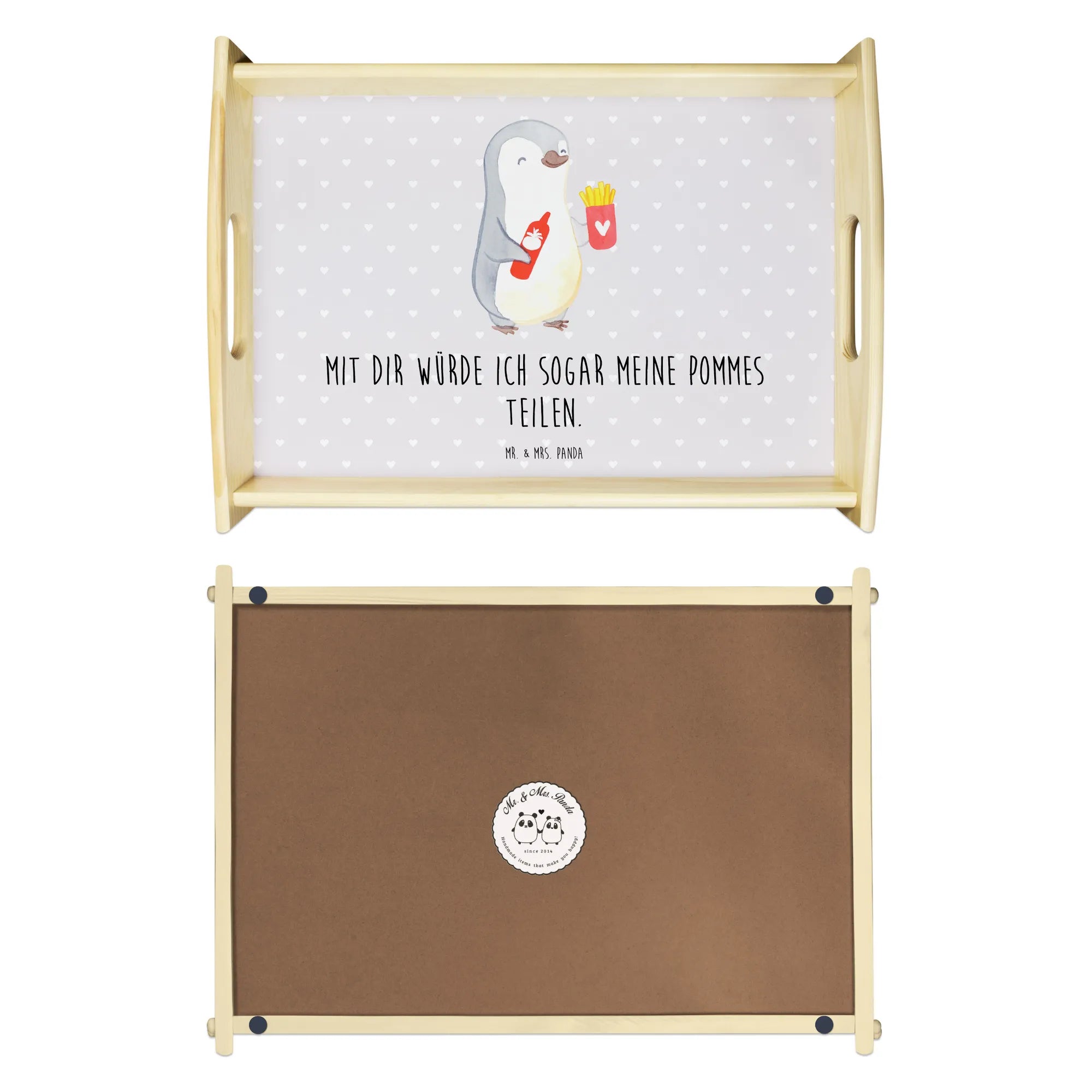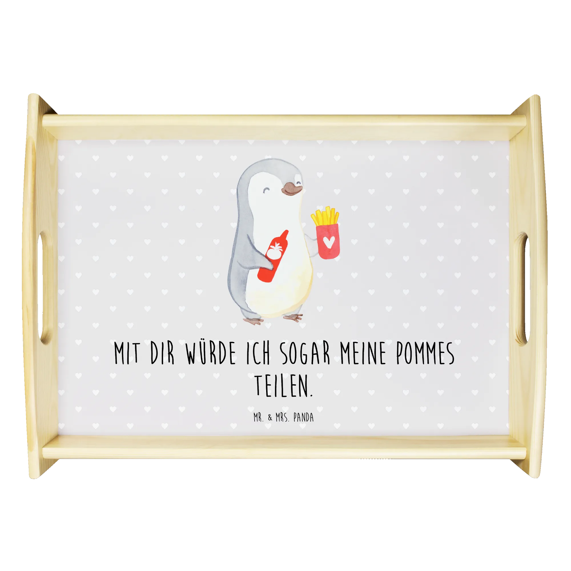 Du suchst nach dem perfekten Geschenk für deine Liebsten? Dann ist das wunderschöne Serviertablett Pinguin Pommes aus der Liebe Kollektion von Mr. & Mrs. Panda genau das Richtige für dich!