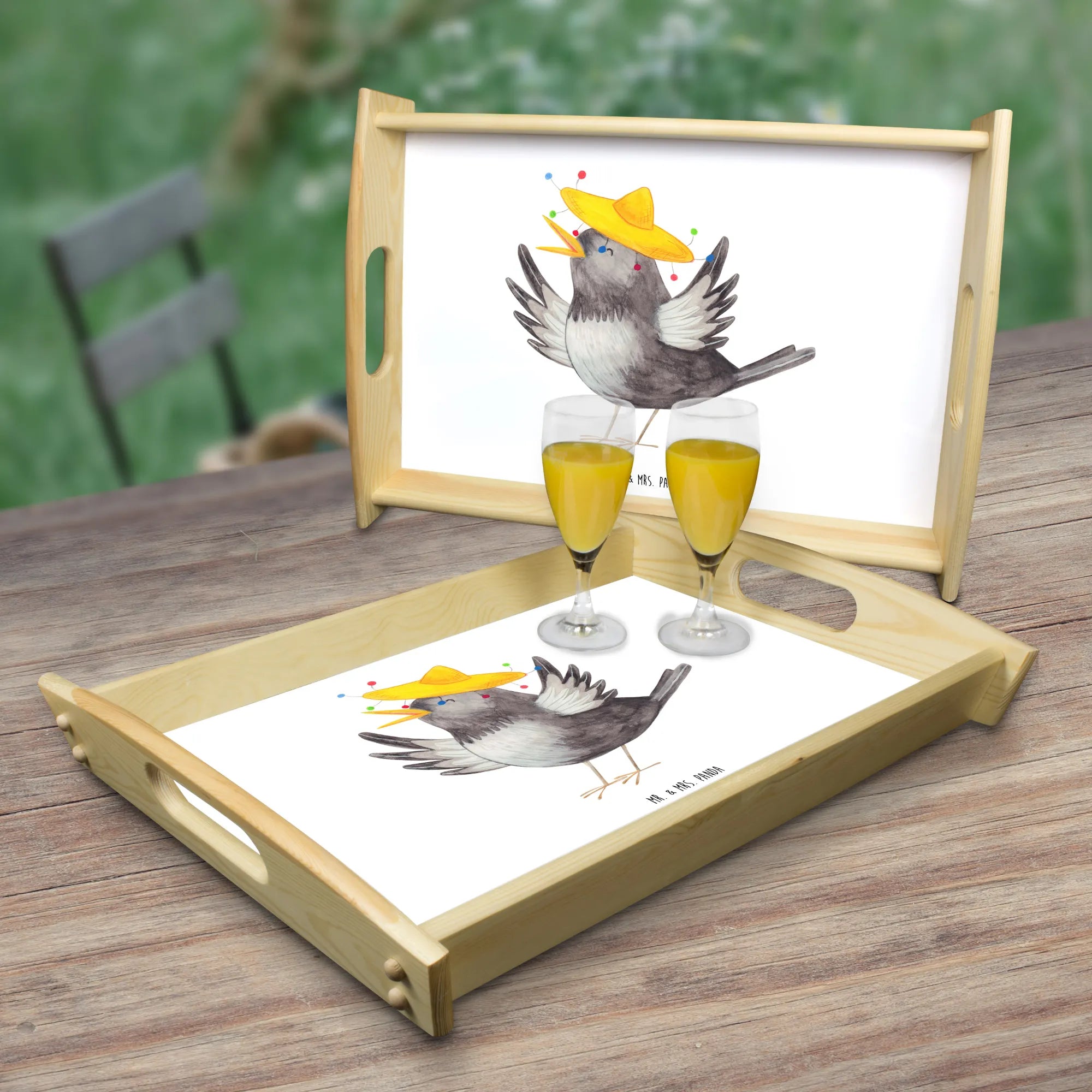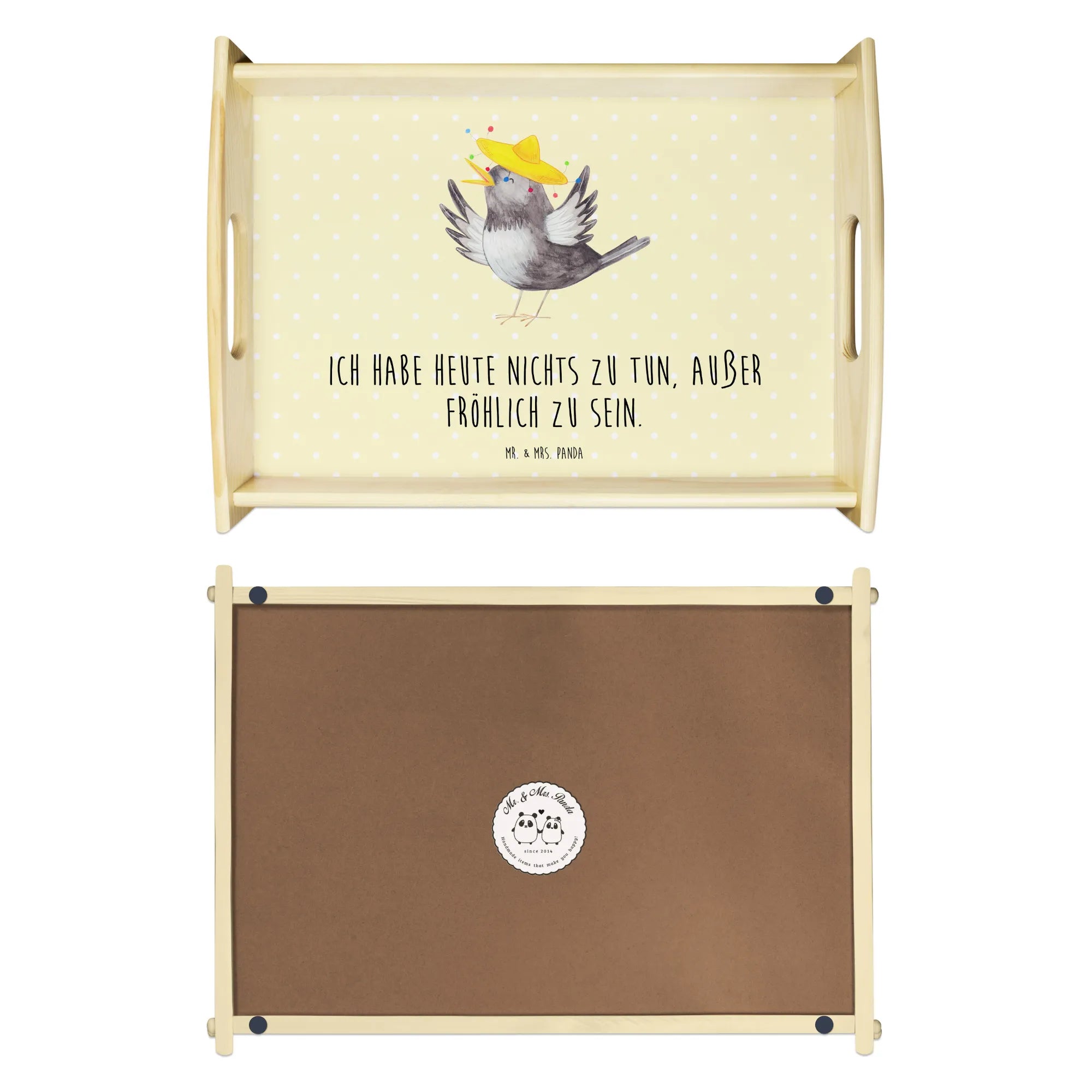 Das einzigartige Serviertablett von Mr. & Mrs. Panda wird dein Frühstücksbuffet zum Erlebnis machen! Mit seinen großzügigen Maßen von 480 mm x 480 mm x 65 mm und einem Gewicht von 925 g ist es die perfekte Kombination aus Funktionalität und Stil. Aus hochwertigem, lasiertem Echtholz gefertigt, verzückt das Tablett mit einem strahlenden Druck, der für gute Laune sorgt. Ob im Bett oder auf dem Sofa, die seitlichen Griffmulden garantieren ein angenehmes Handling. Die spezielle Anti-Rutsch Beschichtung sorgt dafür, dass alles sicher an seinem Platz bleibt. Dank der kratzfesten Oberfläche ist das Tablett sehr pflegeleicht – einfach mit einem feuchten Tuch und etwas Spülmittel abwischen. Bitte nicht einweichen! Denke daran, dass die Anfertigung wegen der hohen Qualität etwas Zeit in Anspruch nimmt.