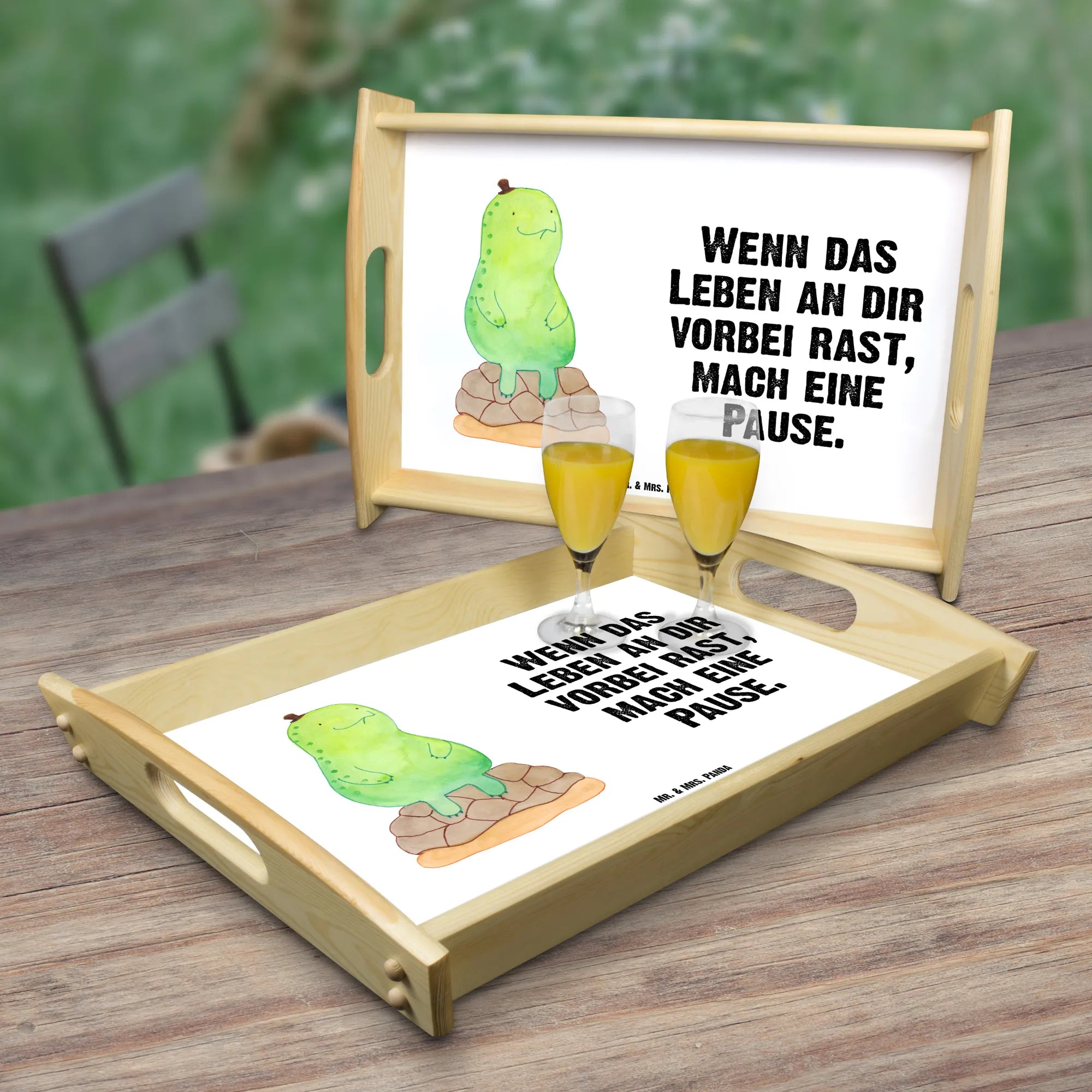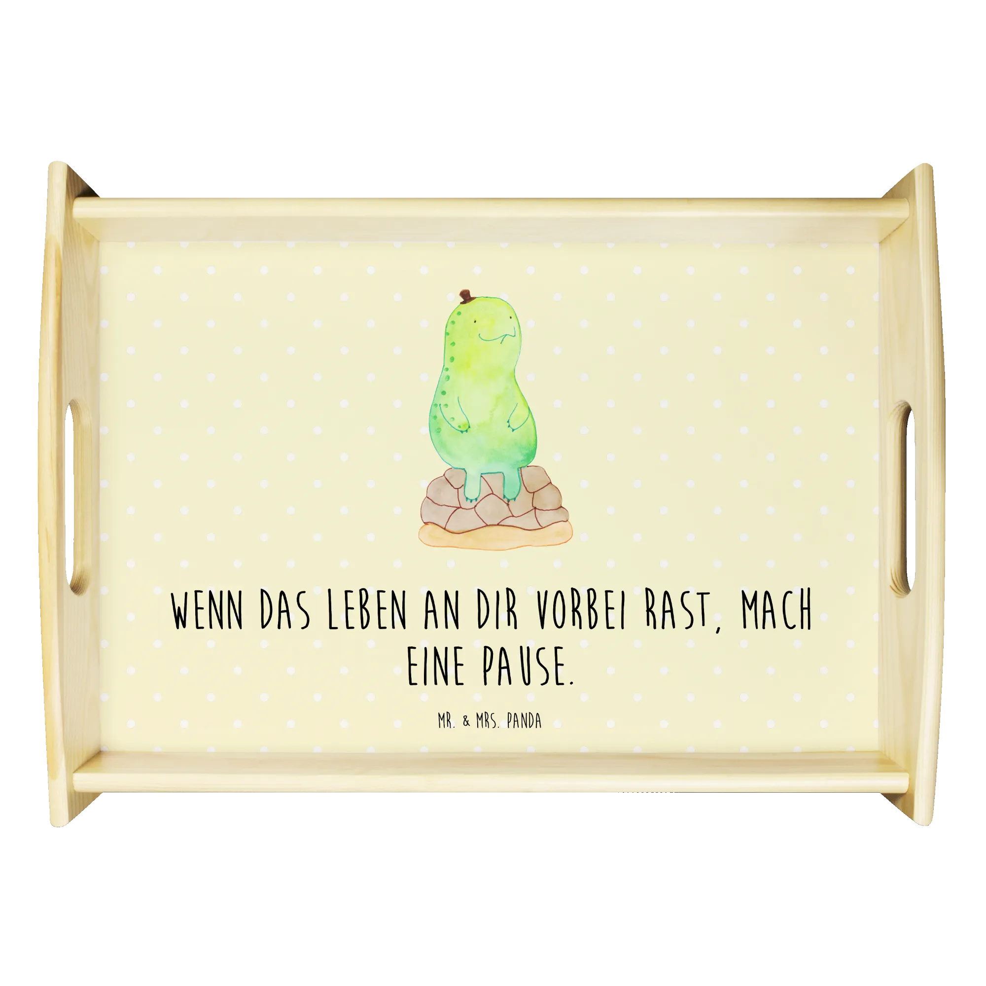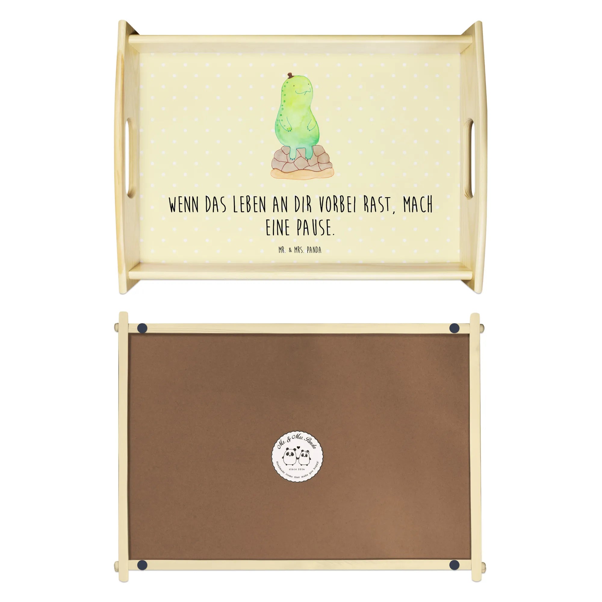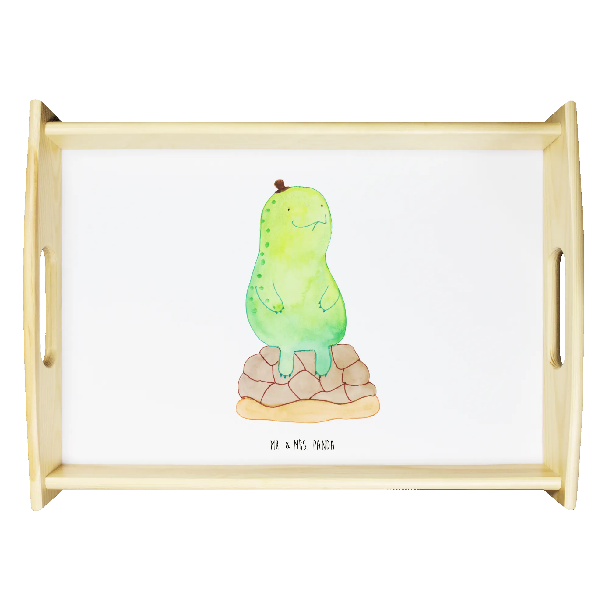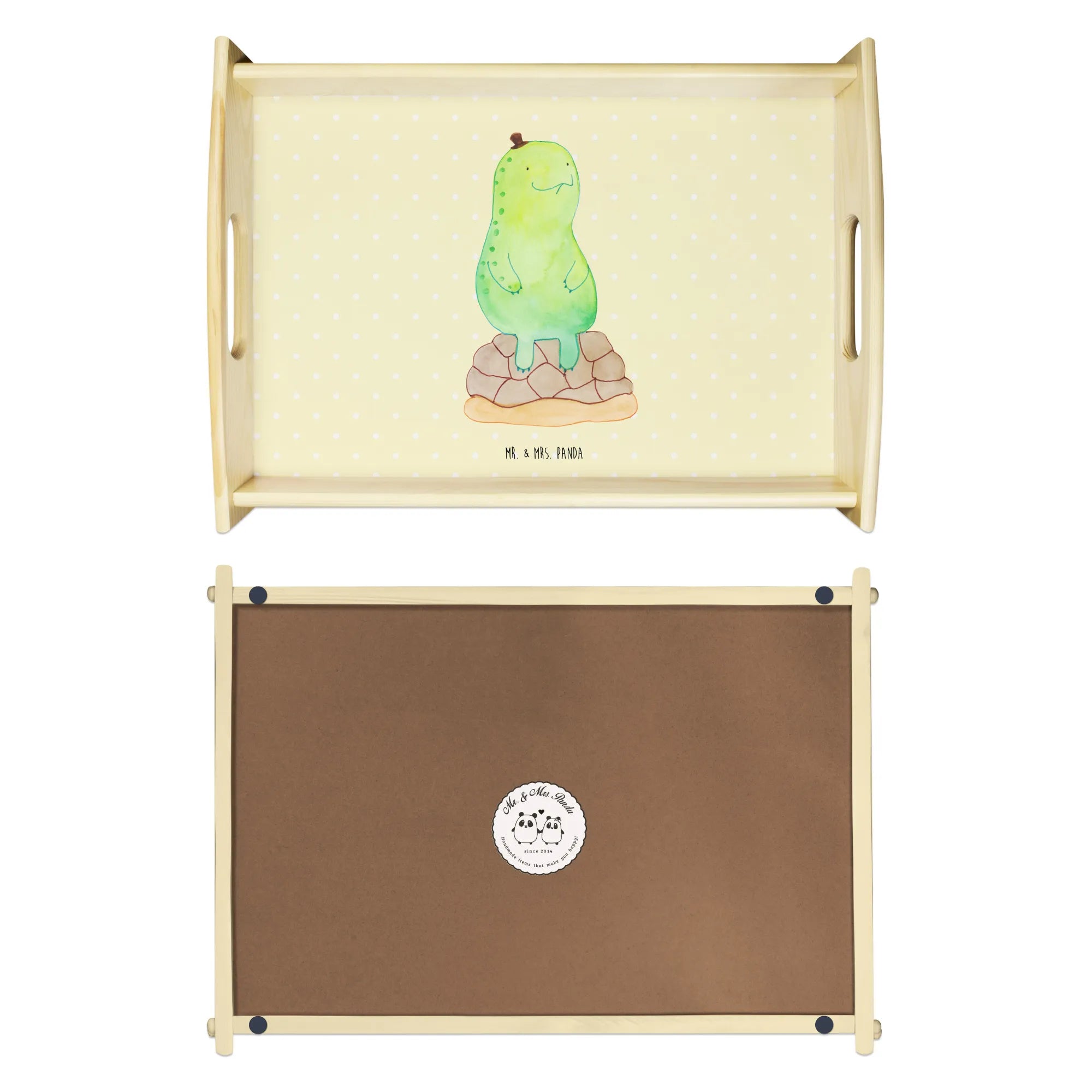 Verwöhne Deine Liebsten mit unserem bezaubernden Serviertablett von Mr. & Mrs. Panda! Mit den Maßen von 480 mm x 480 mm x 65 mm und einem gewicht von 925 g ist es nicht nur hübsch, sondern auch praktisch. Aus lasiertem Echtholz gefertigt, begeistert es mit einem lebendigen Druck, der gute Stimmung verbreitet. Egal ob beim Frühstück im Bett oder beim gemütlichen Abendessen auf dem Sofa – die seitlichen Griffmulden ermöglichen ein einfaches Tragen. Die Anti-Rutsch Pads auf der Unterseite sorgen dafür, dass alles sicher an seinem Platz bleibt. Dank der kratzfesten Oberfläche bleibt dein Tablett nach jeder Benutzung in bestem Zustand – einfach mit einem feuchten Tuch und Spülmittel abwischen, aber nicht einweichen! Beachte bitte die längere Anfertigungszeit aufgrund der besonderen Verarbeitung.