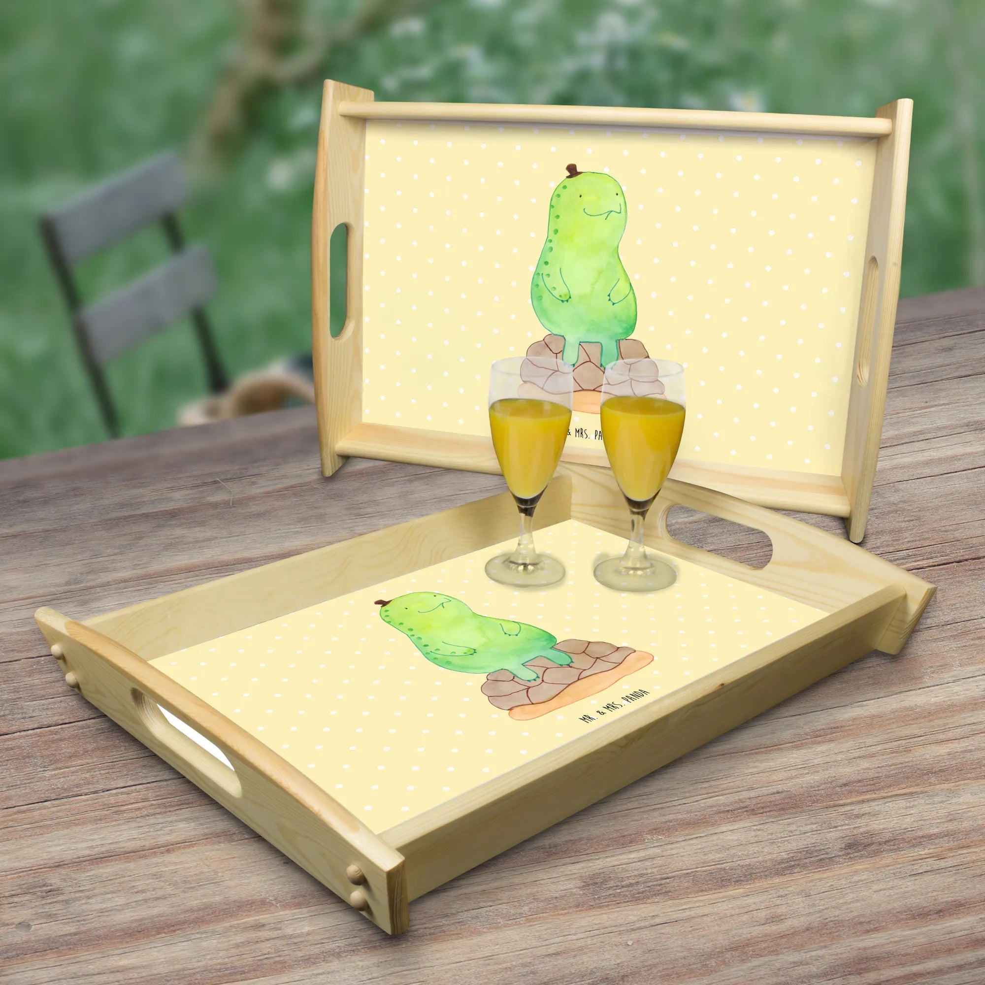 Das atemberaubende Serviertablett von Mr. & Mrs. Panda ist das ideale Geschenk für jeden Frühstücksliebhaber! Mit den Maßen von 480 mm x 480 mm x 65 mm und einem Gewicht von 925 g ist es ein perfekter Begleiter für den Tag. Hergestellt aus hochwertigem, lasiertem Echtholz, setzt es sich durch einen strahlenden Druck in Szene. Ob für Frühstück im Bett oder beim Picknick auf der Terrasse, die seitlichen Griffmulden sorgen für eine angenehme Handhabung. Gleichermaßen punktet das Tablett mit seinen Anti-Rutsch Pads, die für einen sicheren Stand sorgen. Es ist zudem kratzfest und einfach zu reinigen – wisch einfach mit einem feuchten Tuch darüber. Bitte nicht einweichen!Achtung: Die Anfertigung dauert etwas länger, da wir viel Liebe ins Detail stecken.