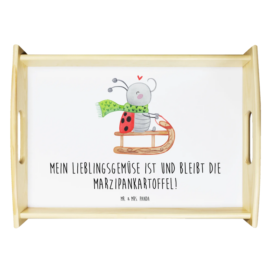 Entdecke unser einzigartiges Serviertablett von Mr. & Mrs. Panda – ein wahres Highlight für jedes Frühstück! Mit den Maßen von 480 mm x 480 mm x 65 mm und einem Gewicht von 925 g ist dieses Holztablett nicht nur praktisch, sondern auch wunderschön. Hergestellt aus lasiertem Echtholz mit einem brillanten Druck, bringt es Farbe in dein Zuhause. Ob für ein gemütliches Frühstück im Bett oder beim Entspannen auf dem Sofa – die seitlichen Griffmulden sorgen für eine einfache Handhabung. Vielen lieben Dank für deine Unterstützung, die Anti-Rutsch Pads auf der Unterseite machen das Servieren noch einfacher. Die kratzfeste und robuste Oberfläche garantiert Langlebigkeit. Pflegeleicht wird es einfach mit einem feuchten Tuch und etwas Spülmittel gereinigt. Bitte nicht einweichen! Hinweis: Aufgrund der aufwändigen Herstellung kann die Anfertigungszeit etwas länger sein.