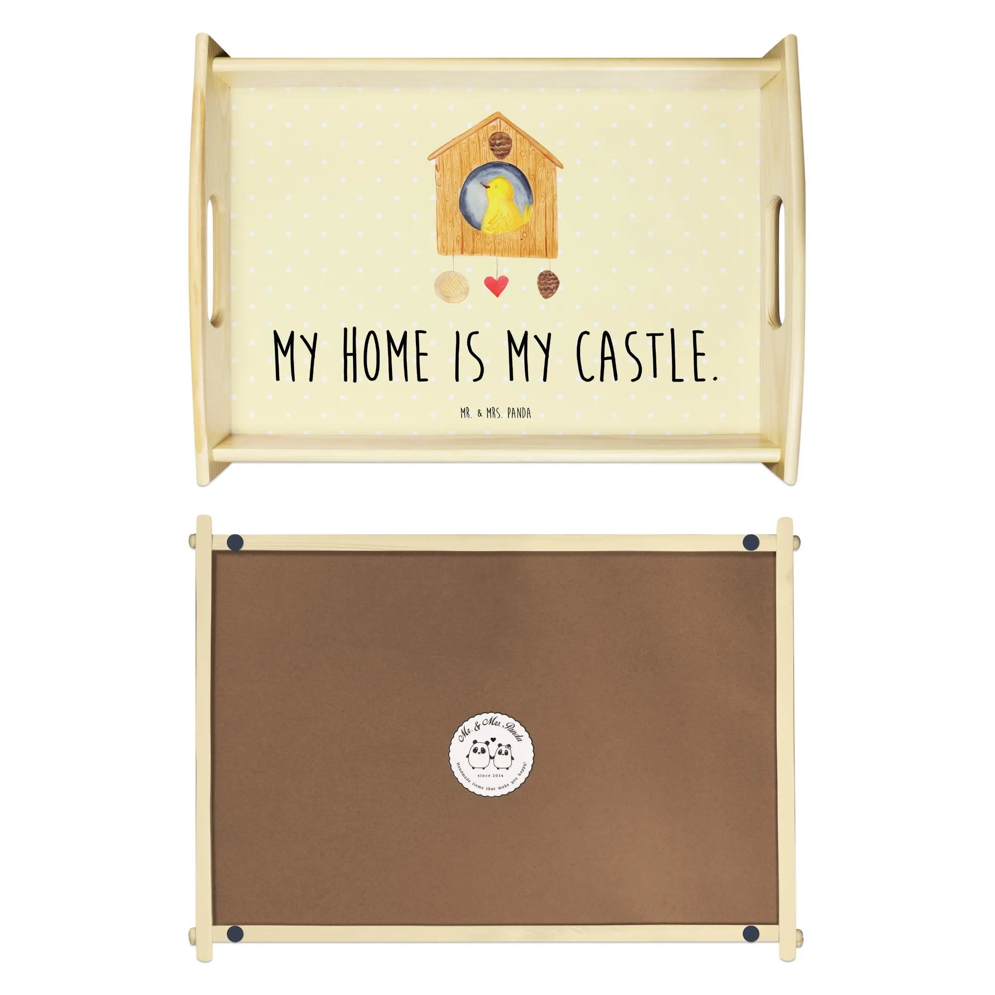 Verwöhne Deine Liebsten mit unserem bezaubernden Serviertablett von Mr. & Mrs. Panda! Mit den Maßen von 480 mm x 480 mm x 65 mm und einem gewicht von 925 g ist es nicht nur hübsch, sondern auch praktisch. Aus lasiertem Echtholz gefertigt, begeistert es mit einem lebendigen Druck, der gute Stimmung verbreitet. Egal ob beim Frühstück im Bett oder beim gemütlichen Abendessen auf dem Sofa – die seitlichen Griffmulden ermöglichen ein einfaches Tragen. Die Anti-Rutsch Pads auf der Unterseite sorgen dafür, dass alles sicher an seinem Platz bleibt. Dank der kratzfesten Oberfläche bleibt dein Tablett nach jeder Benutzung in bestem Zustand – einfach mit einem feuchten Tuch und Spülmittel abwischen, aber nicht einweichen! Beachte bitte die längere Anfertigungszeit aufgrund der besonderen Verarbeitung.