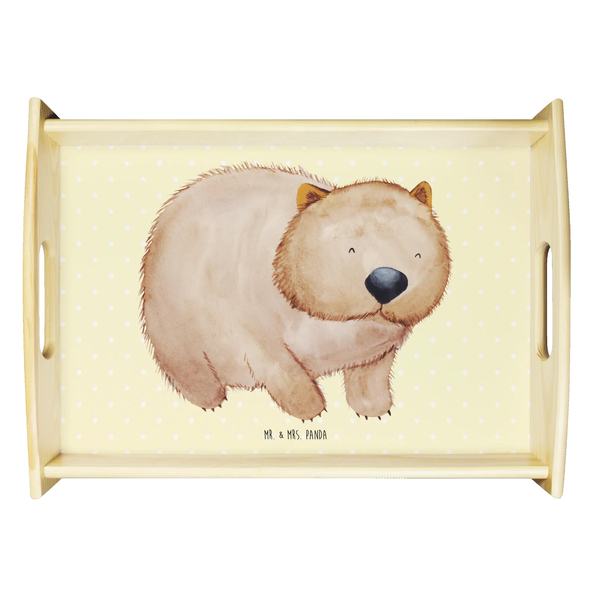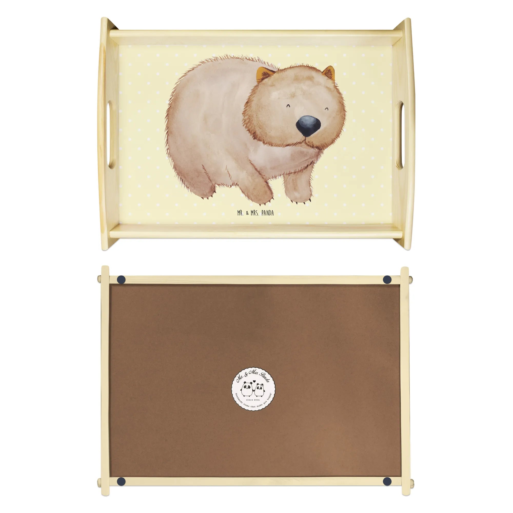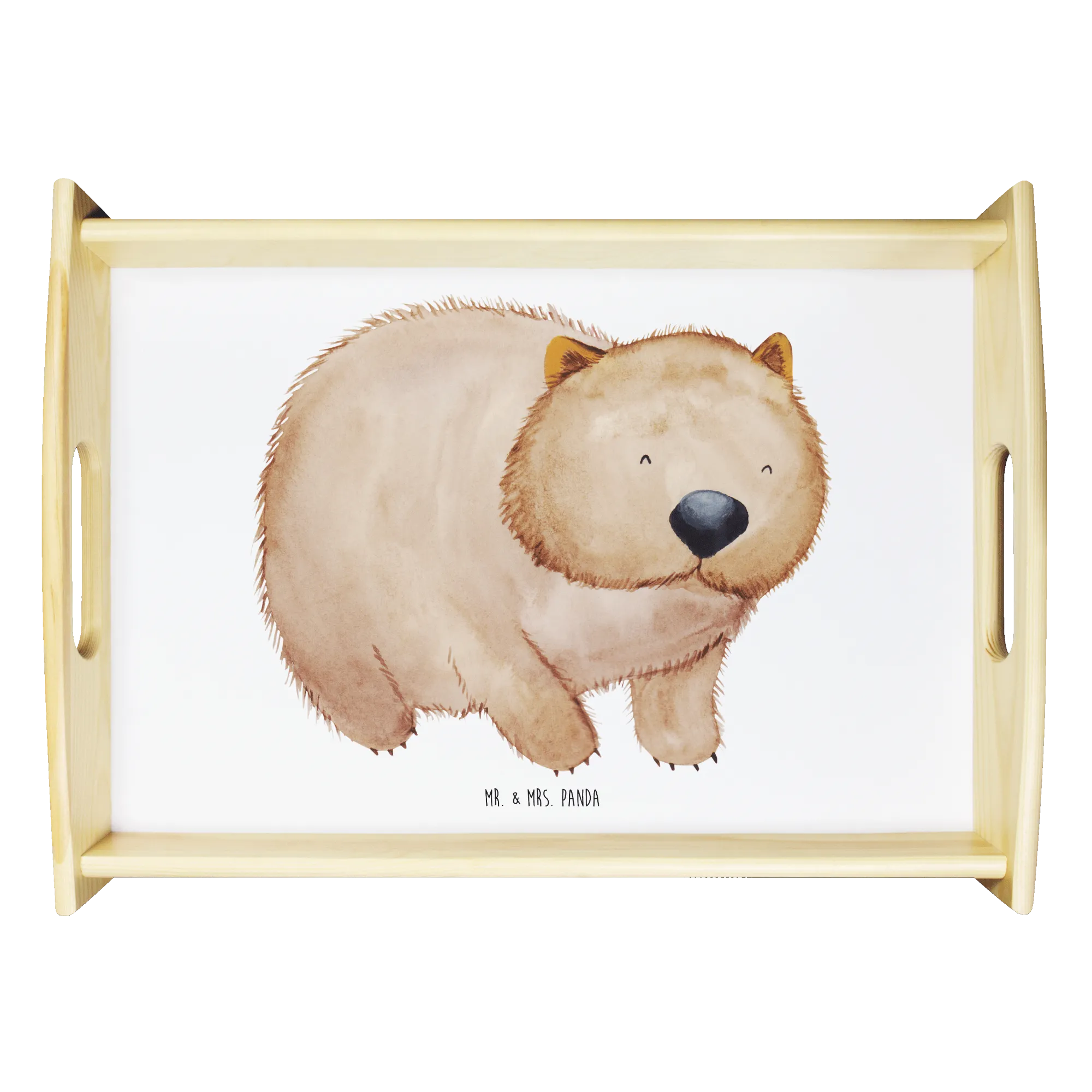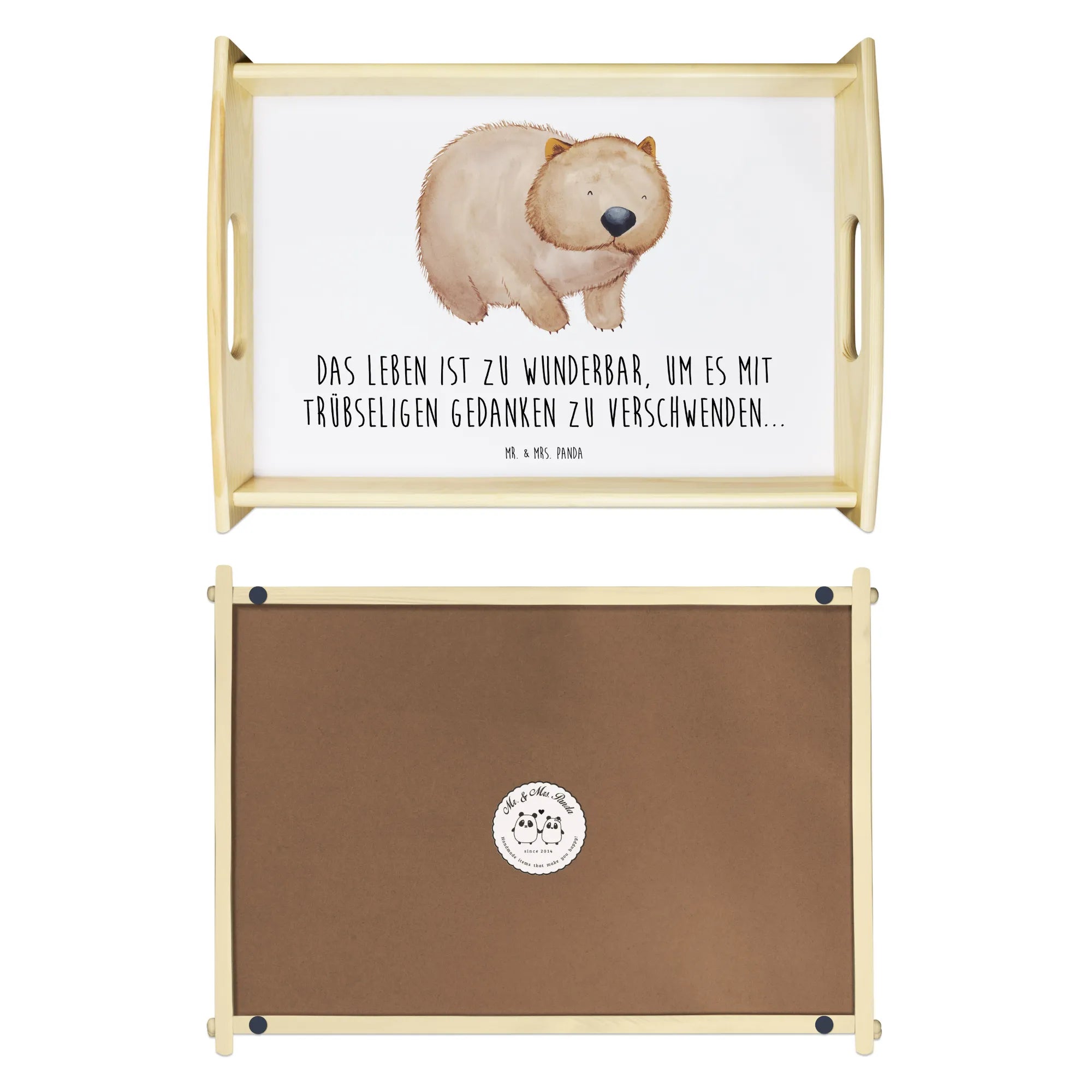 Verwöhne Deine Liebsten mit unserem bezaubernden Serviertablett von Mr. & Mrs. Panda! Mit den Maßen von 480 mm x 480 mm x 65 mm und einem gewicht von 925 g ist es nicht nur hübsch, sondern auch praktisch. Aus lasiertem Echtholz gefertigt, begeistert es mit einem lebendigen Druck, der gute Stimmung verbreitet. Egal ob beim Frühstück im Bett oder beim gemütlichen Abendessen auf dem Sofa – die seitlichen Griffmulden ermöglichen ein einfaches Tragen. Die Anti-Rutsch Pads auf der Unterseite sorgen dafür, dass alles sicher an seinem Platz bleibt. Dank der kratzfesten Oberfläche bleibt dein Tablett nach jeder Benutzung in bestem Zustand – einfach mit einem feuchten Tuch und Spülmittel abwischen, aber nicht einweichen! Beachte bitte die längere Anfertigungszeit aufgrund der besonderen Verarbeitung.