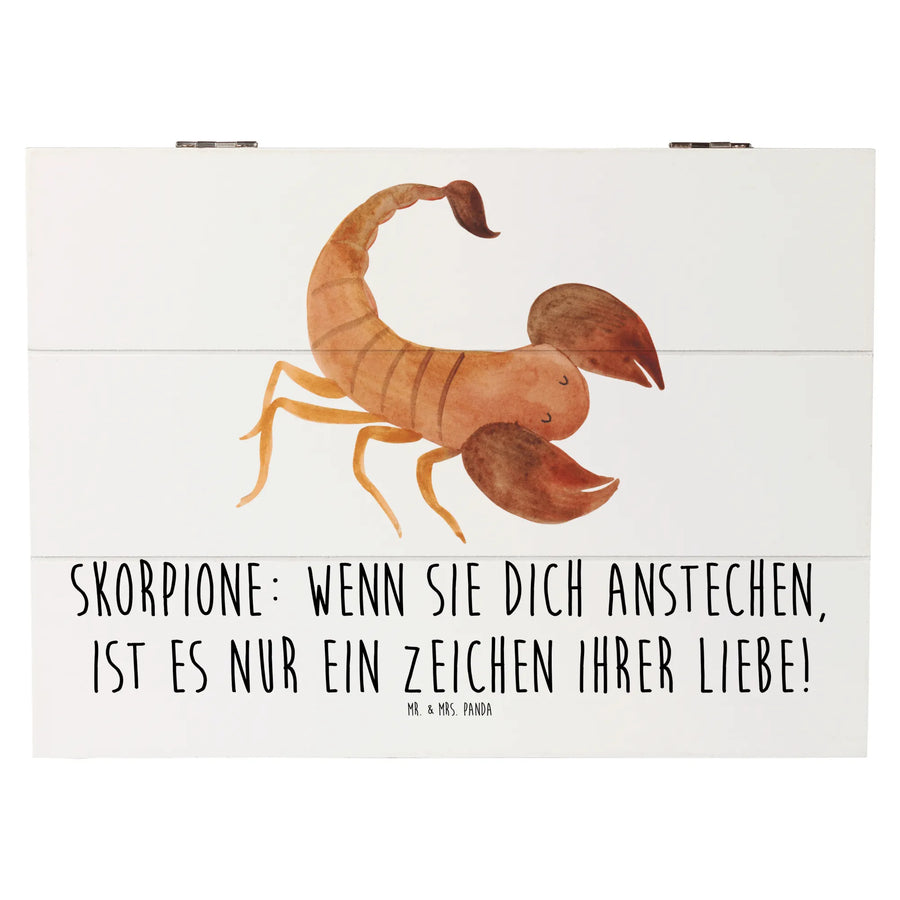 Mit den Maßen 25 x 18 cm bietet diese solide Kiste ausreichend Platz für ganz besondere Erinnerungen, Schätze oder einfach nur für Dinge, die dir am Herzen liegen. Das wunderschöne Design mit dem Spruch "Skorpione: Wenn sie dich anstechen, ist es nur ein Zeichen ihrer Liebe!" ist liebevoll von Mrs. Panda handgezeichnet und verleiht der Kiste eine ganz persönliche Note.