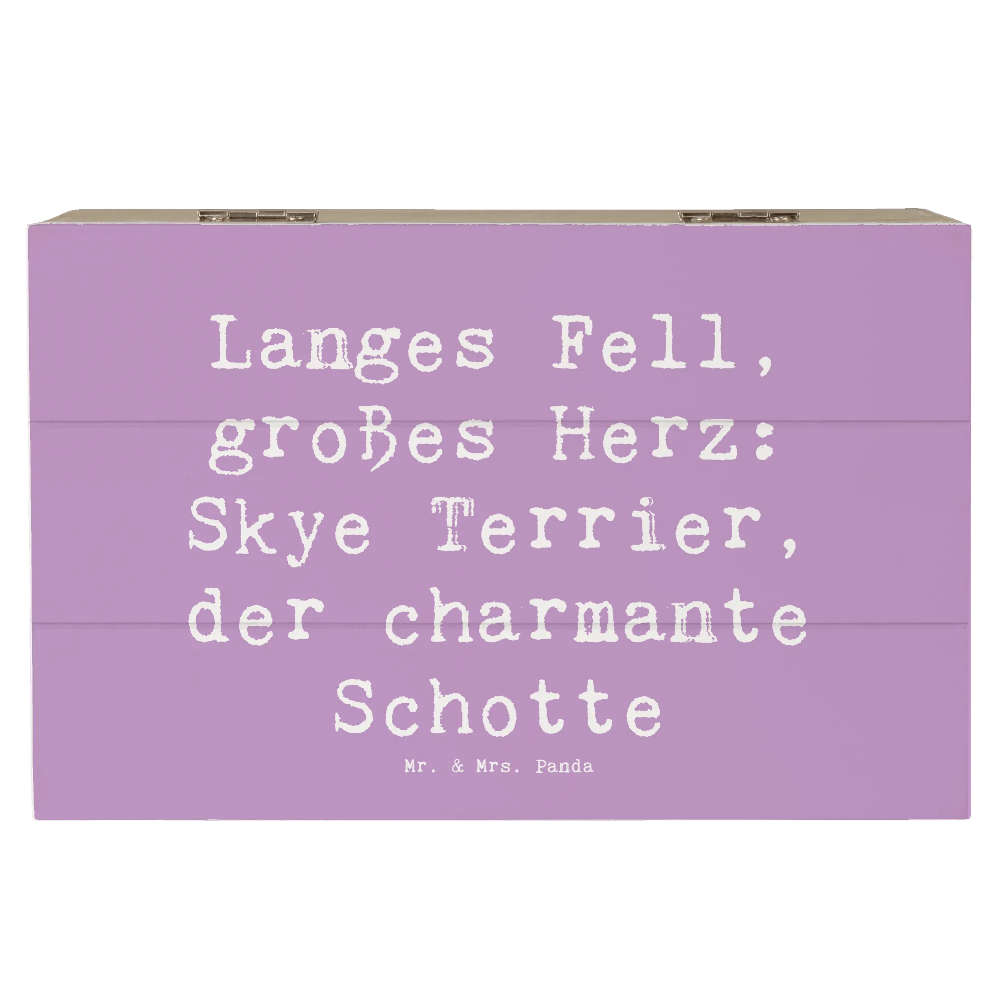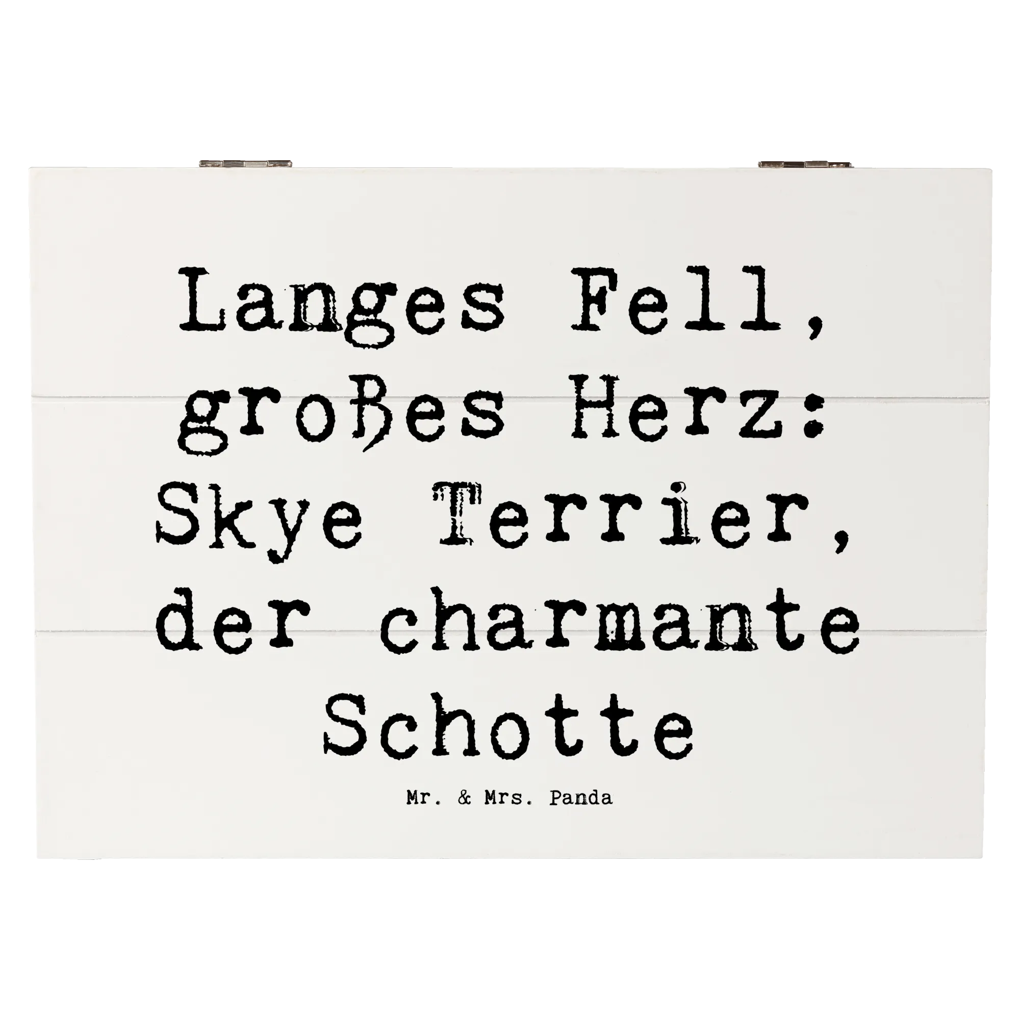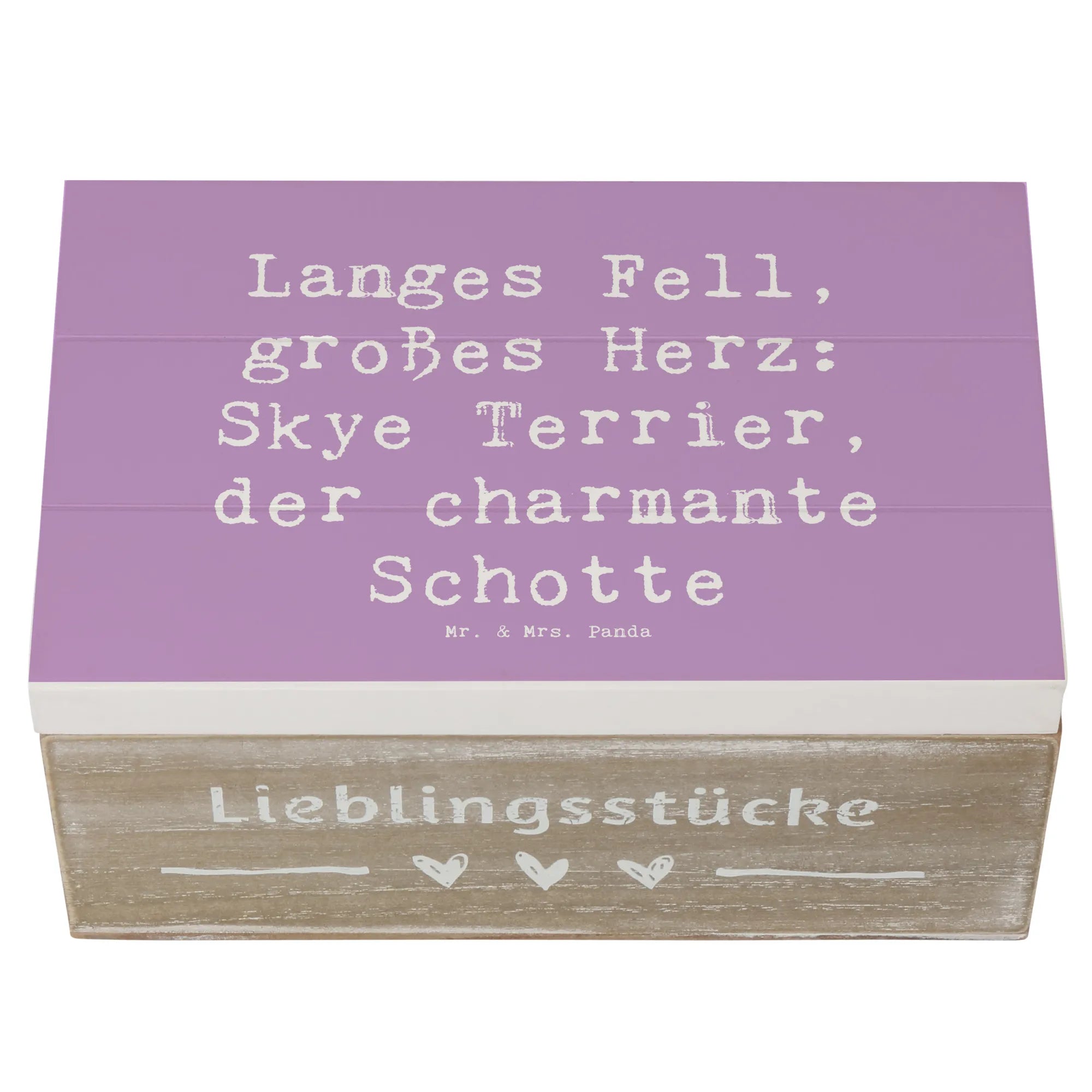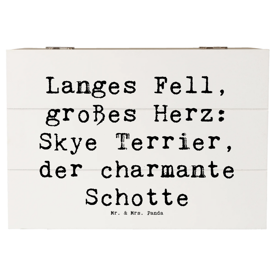 Diese wundervolle Holzkiste von Mr. & Mrs. Panda ist das perfekte Geschenk für jeden Hundefan! Mit ihrem niedlichen Motiv des Skye Terriers und dem spritzigen Spruch 'Langes Fell, großes Herz: Skye Terrier, der charmante Schotte' zieht sie alle Blicke auf sich.