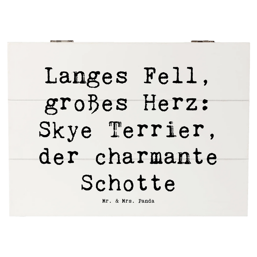 Diese wundervolle Holzkiste von Mr. & Mrs. Panda ist das perfekte Geschenk für jeden Hundefan! Mit ihrem niedlichen Motiv des Skye Terriers und dem spritzigen Spruch 'Langes Fell, großes Herz: Skye Terrier, der charmante Schotte' zieht sie alle Blicke auf sich.