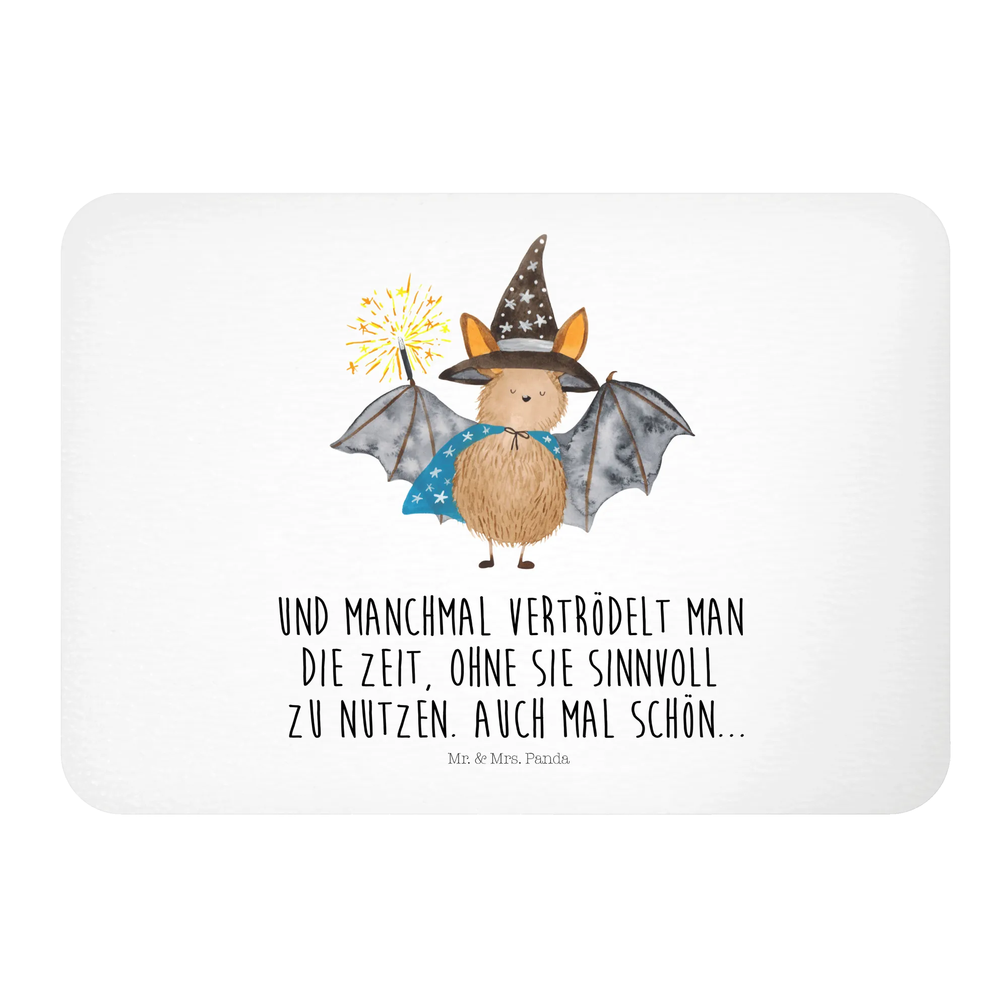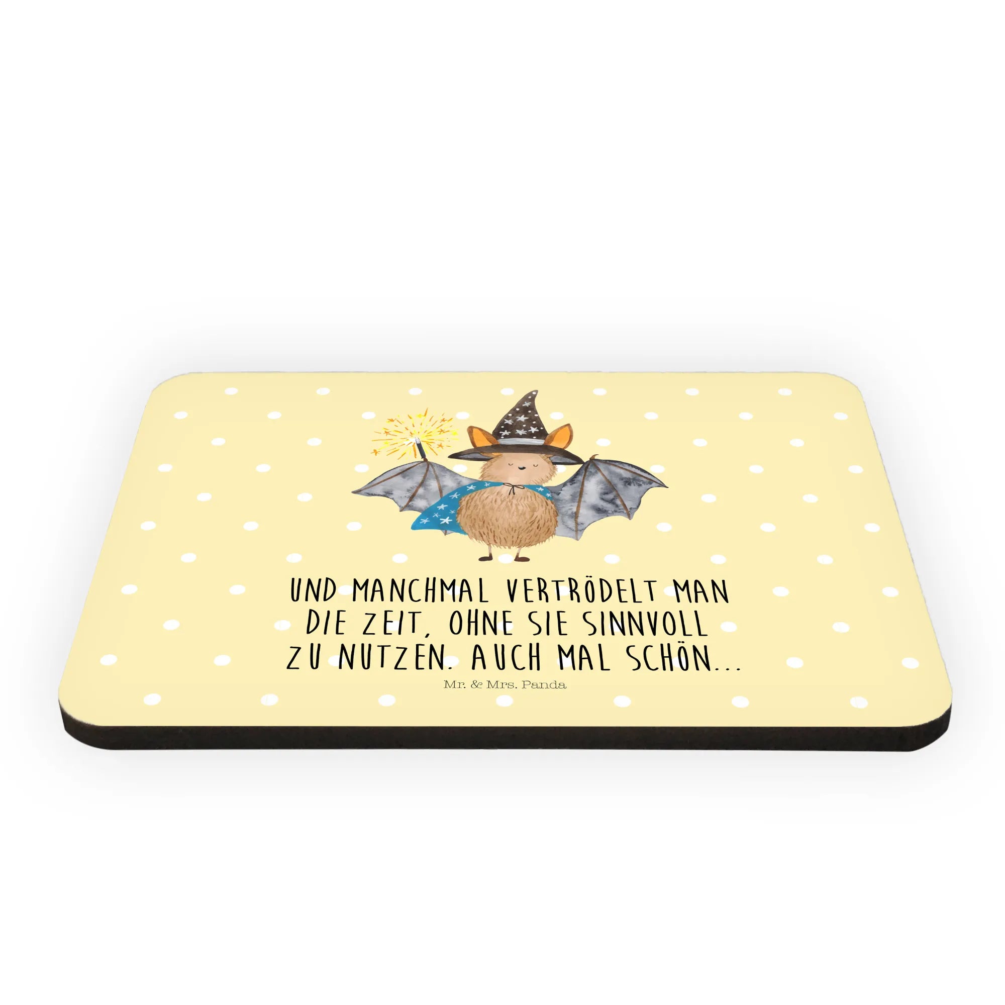 Jeder Magnet ist mit dem Slogan "Und manchmal vertrödelt man die Zeit, ohne sie sinnvoll zu nutzen. Auch mal schön..." versehen, der perfekt zur magischen Atmosphäre passt, die die Fledermaus verbreitet. Die Komposition von niedlichen Tiermotiven und humorvollen Sprüchen ist das Markenzeichen von Mr. & Mrs. Panda und macht dieses Produkt zu einer außergewöhnlichen Bereicherung für jede Deko-Idee.