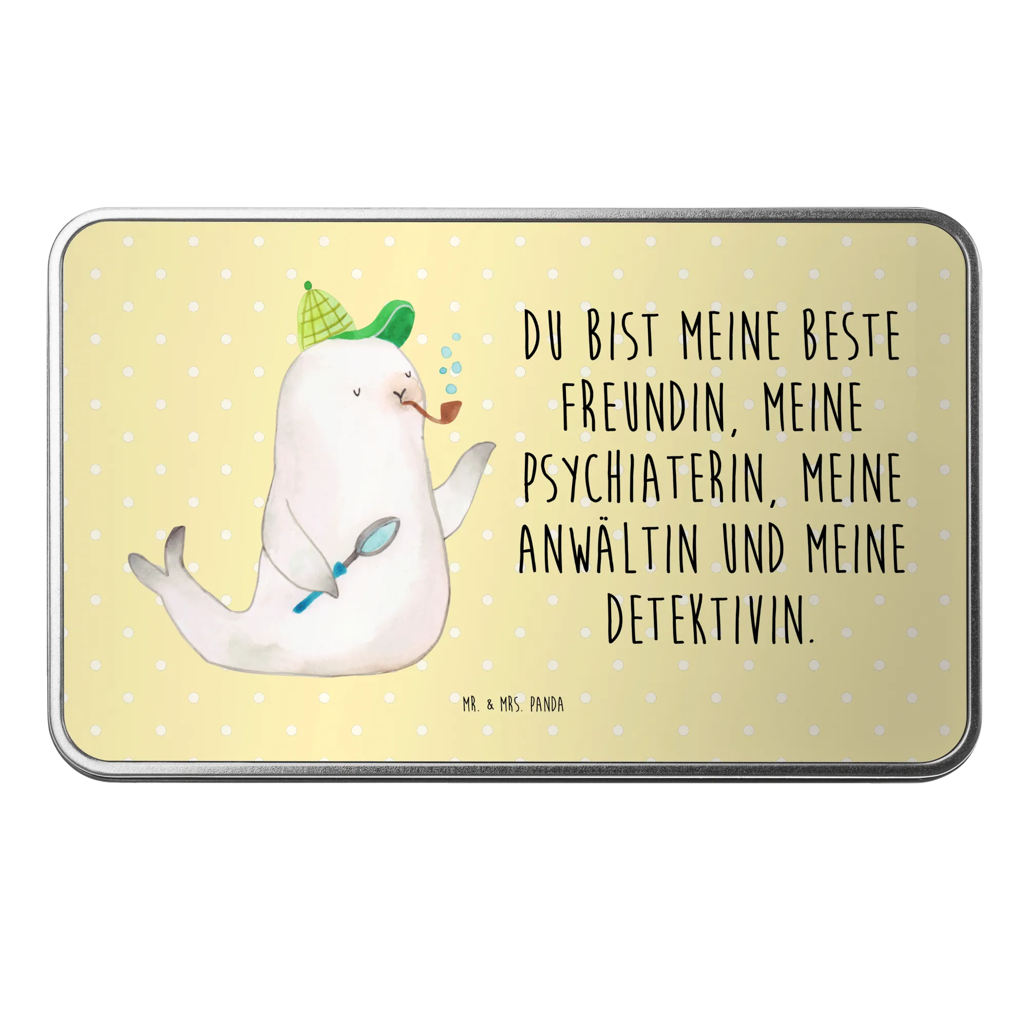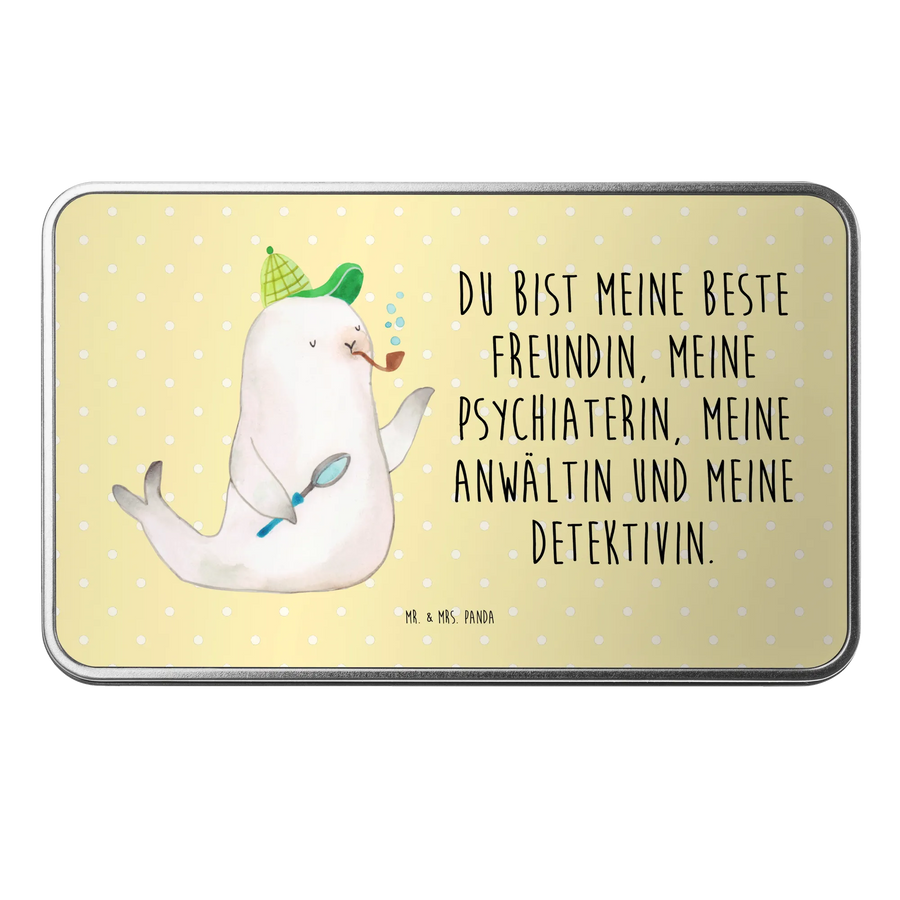 Entdecke die zauberhafte Metalldose rechteckig "Robbe Sherlock" aus der beliebten Small World Kollektion von Mr. & Mrs. Panda! Mit ihrem bunten, lustigen Design sorgt diese Dose nicht nur für gute Laune, sondern bietet auch eine nachhaltige Möglichkeit, deine Kekse oder kleine Erinnerungen aufzubewahren.