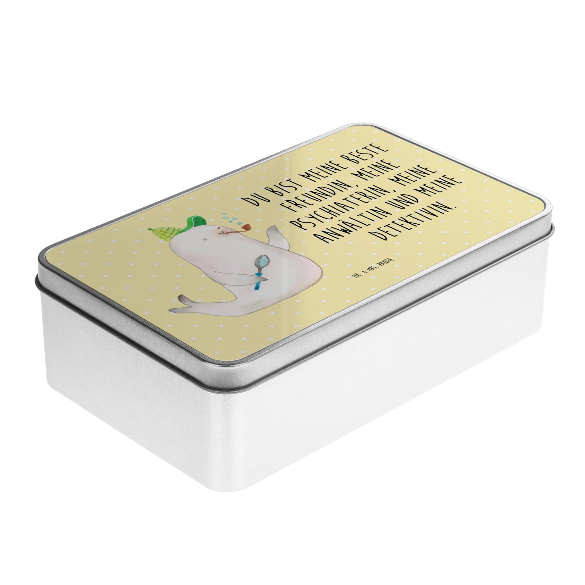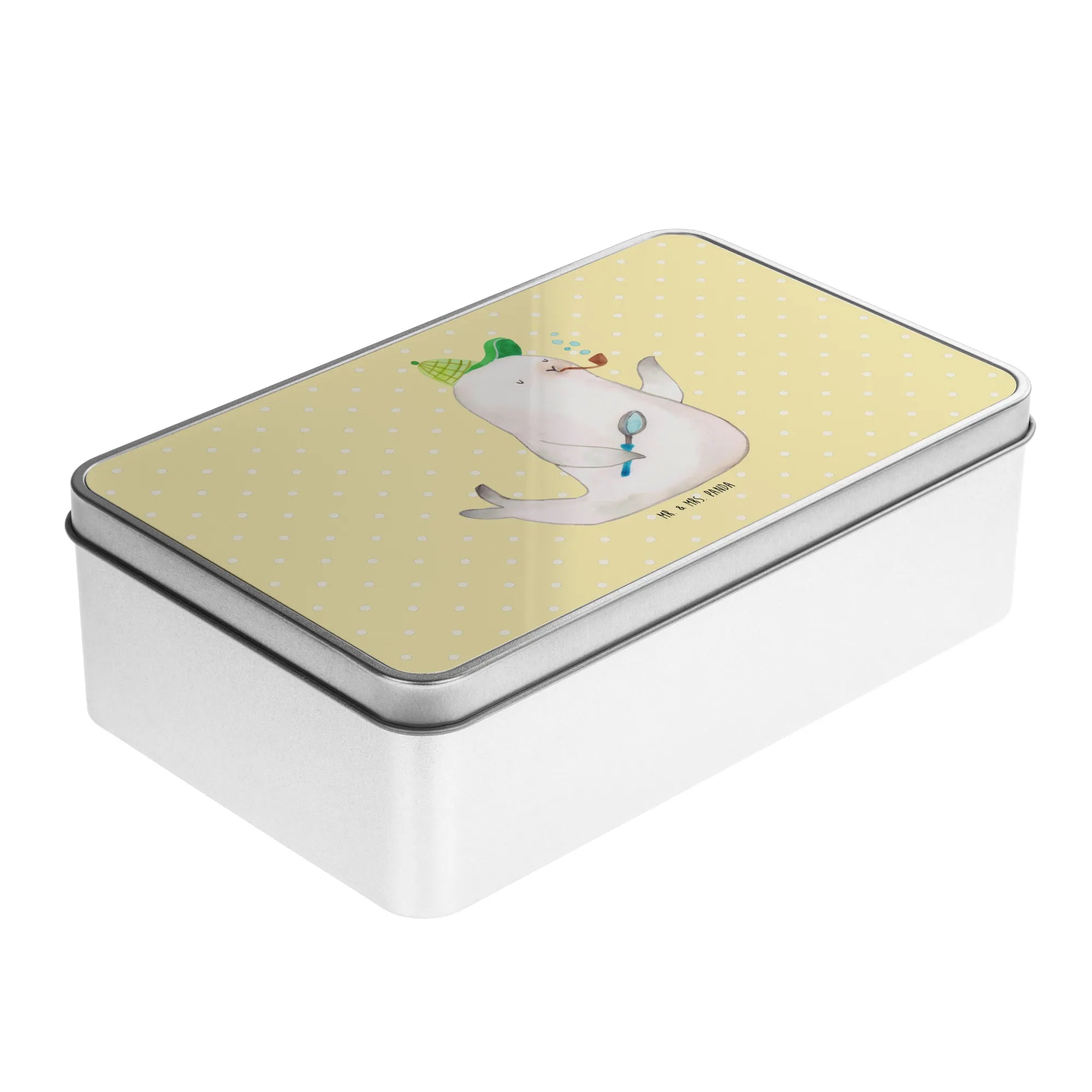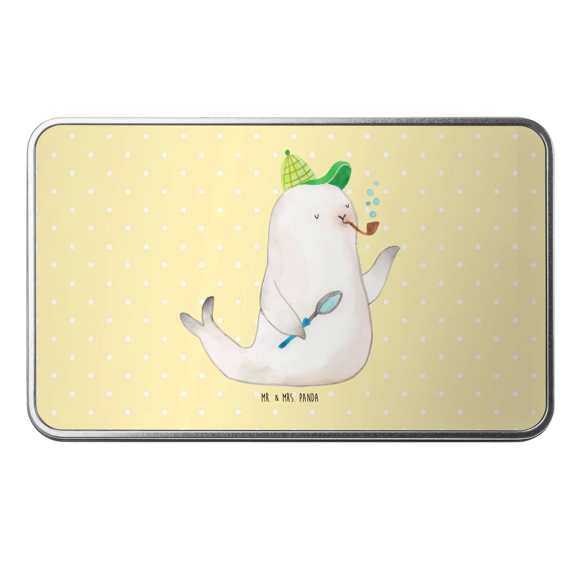 Die wunderschöne Metall Dose im rechteckigen Format von Mr. & Mrs. Panda ist nicht nur ein praktischer Aufbewahrungscontainer, sondern auch ein echter Blickfang! Die Keksdose ist mit dem zauberhaften Motiv 'Robbe Sherlock' aus der beliebten Small World Kollektion verziert.