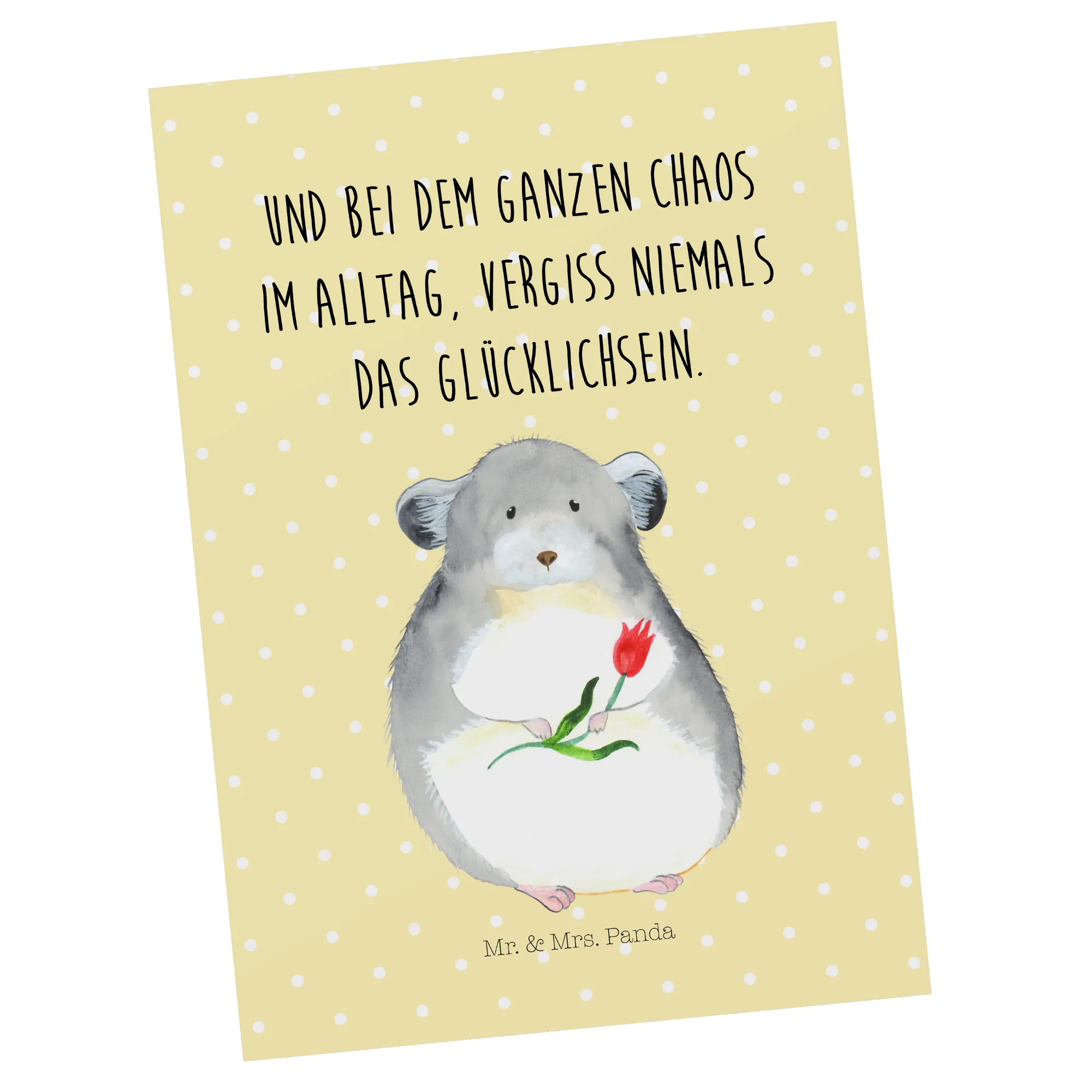 Diese liebevoll illustrierte Grußkarte zeigt ein entzückendes Chinchilla mit einer Blume in den Pfötchen und dem herzerwärmenden Spruch: „Und bei dem ganzen Chaos im Alltag, vergiss niemals das Glücklichsein.“ Der pastellige Gelbton im Hintergrund macht die Karte zu einem strahlenden Hingucker, der sofort gute Laune verbreitet.