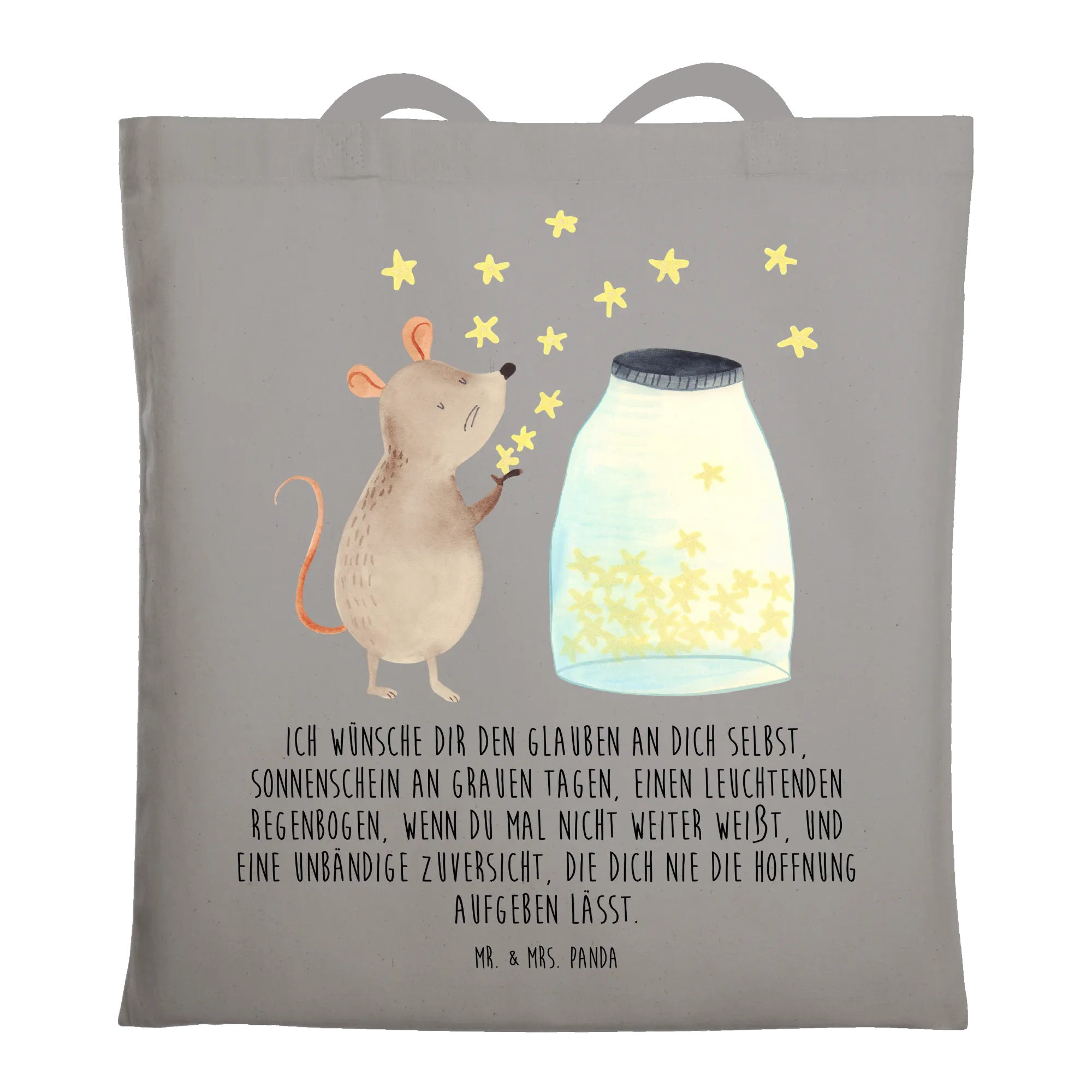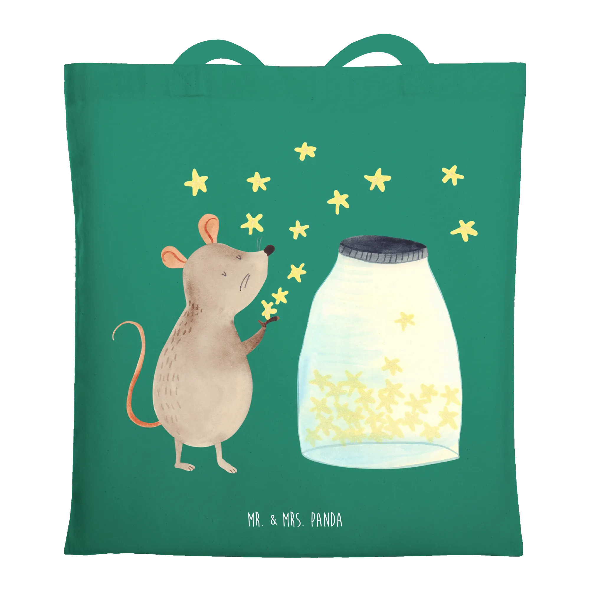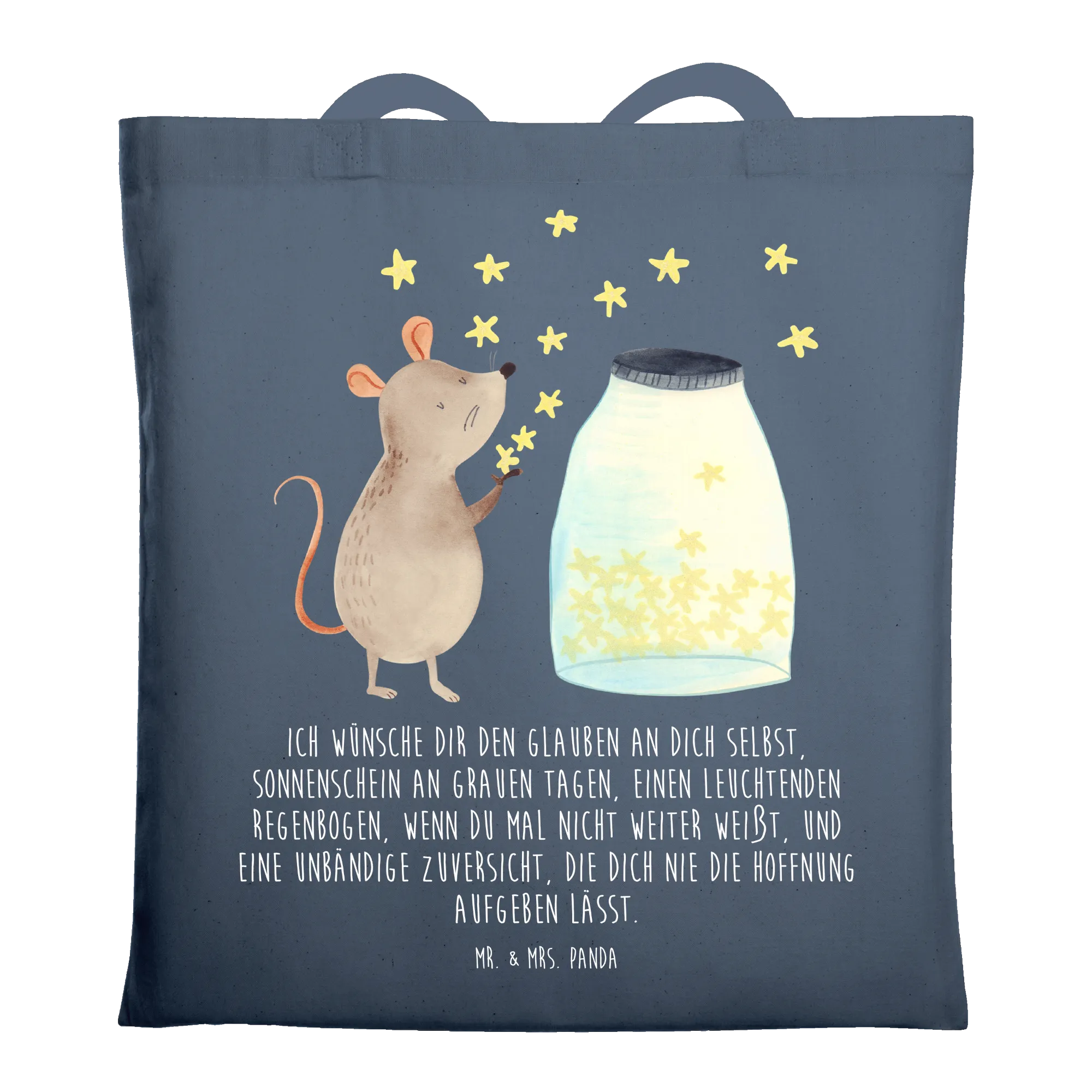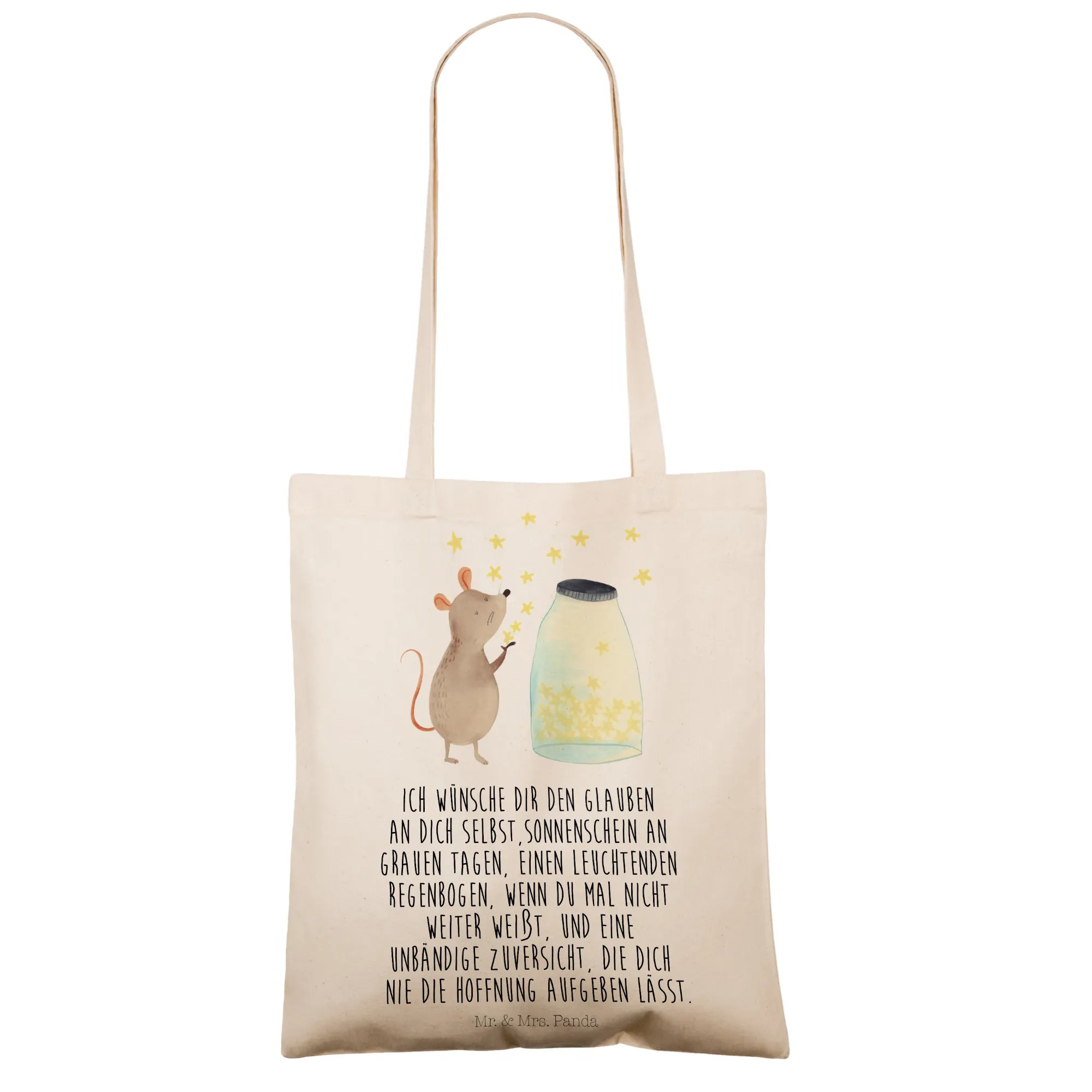 Die Tragetasche Maus Sterne von Mr. & Mrs. Panda ist das perfekte Geschenk für alle, die eine Portion Freude und Stil in ihren Alltag bringen möchten. Die süße Maus, die vor einem funkelnden Glas voller Sterne sitzt, wird jeden in ihren Bann ziehen und zu einem kleinen Traumfänger für große und kleine Abenteuer.