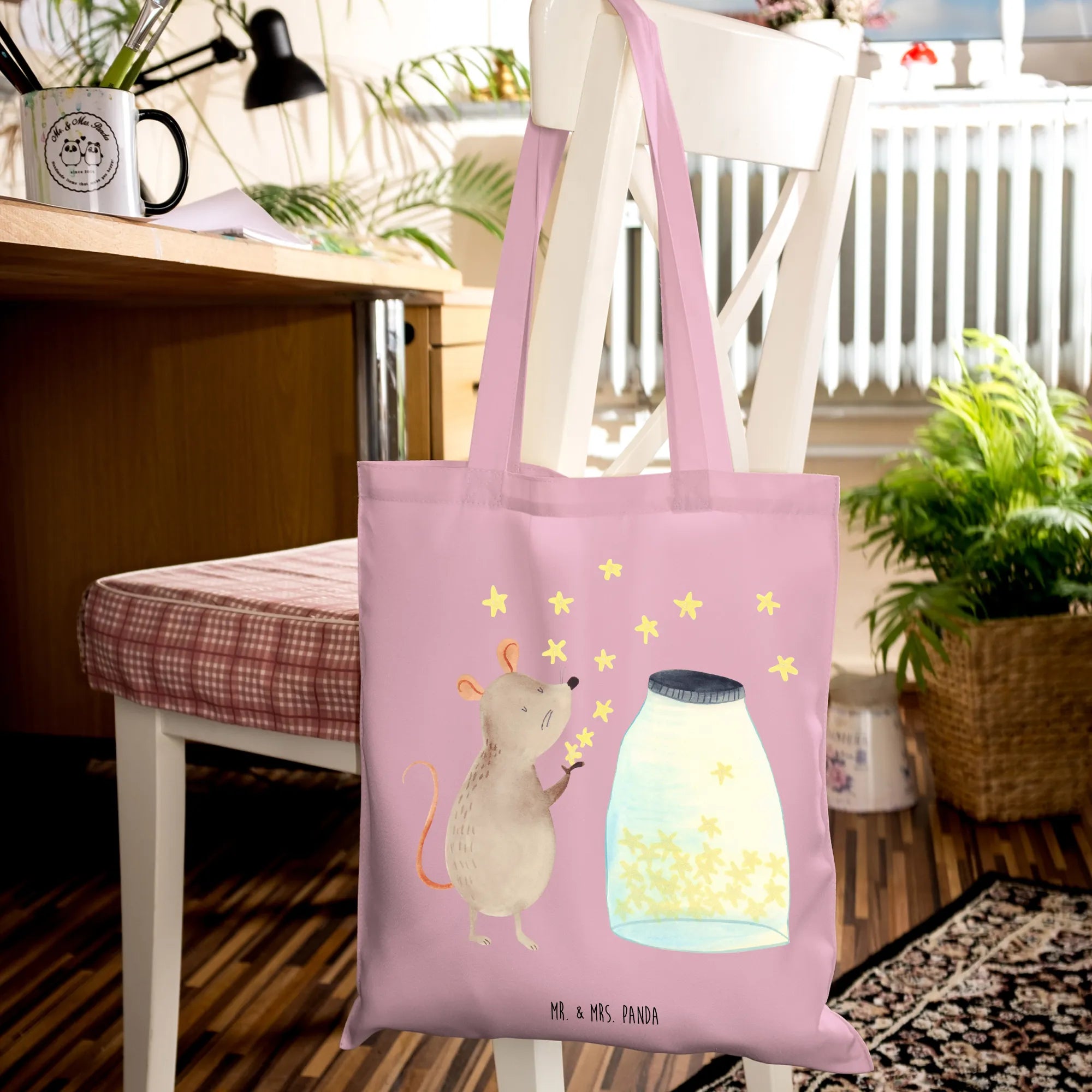 Die Tragetasche Maus Sterne von Mr. & Mrs. Panda ist der perfekte Begleiter für kleine Abenteurer und große Träumer! Lass dich von der charmanten Maus verzaubern, die vor einem funkelnden Glas voller Sterne sitzt. Ihre kleinen Abenteuer und die Hoffnung auf eine leuchtende Zukunft machen diese Tasche nicht nur zu einem praktischen Accessoire, sondern auch zu einem herzlichen Geschenk für jede Gelegenheit.