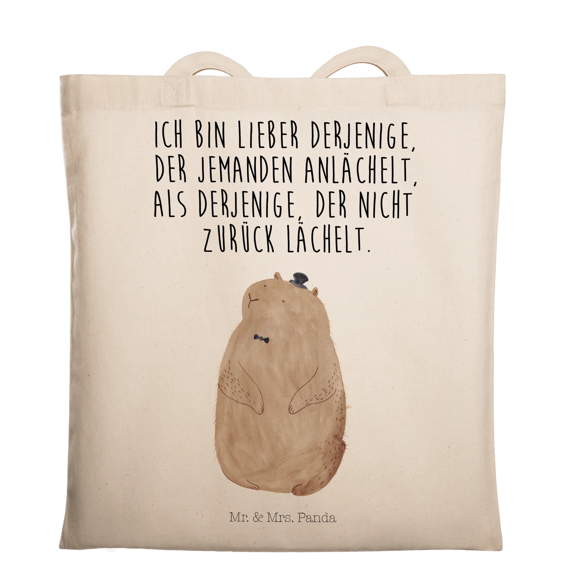Diese süße Stofftasche ist mehr als nur ein Beutel – sie ist ein kleines Statement für Freundlichkeit, Respekt und gute Laune. Das handgezeichnete Murmeltier mit Zylinder und der herzliche Spruch „Ich bin lieber derjenige, der jemanden anlächelt, als derjenige, der nicht zurück lächelt.“ machen die Tasche zu einem echten Hingucker im Alltag.