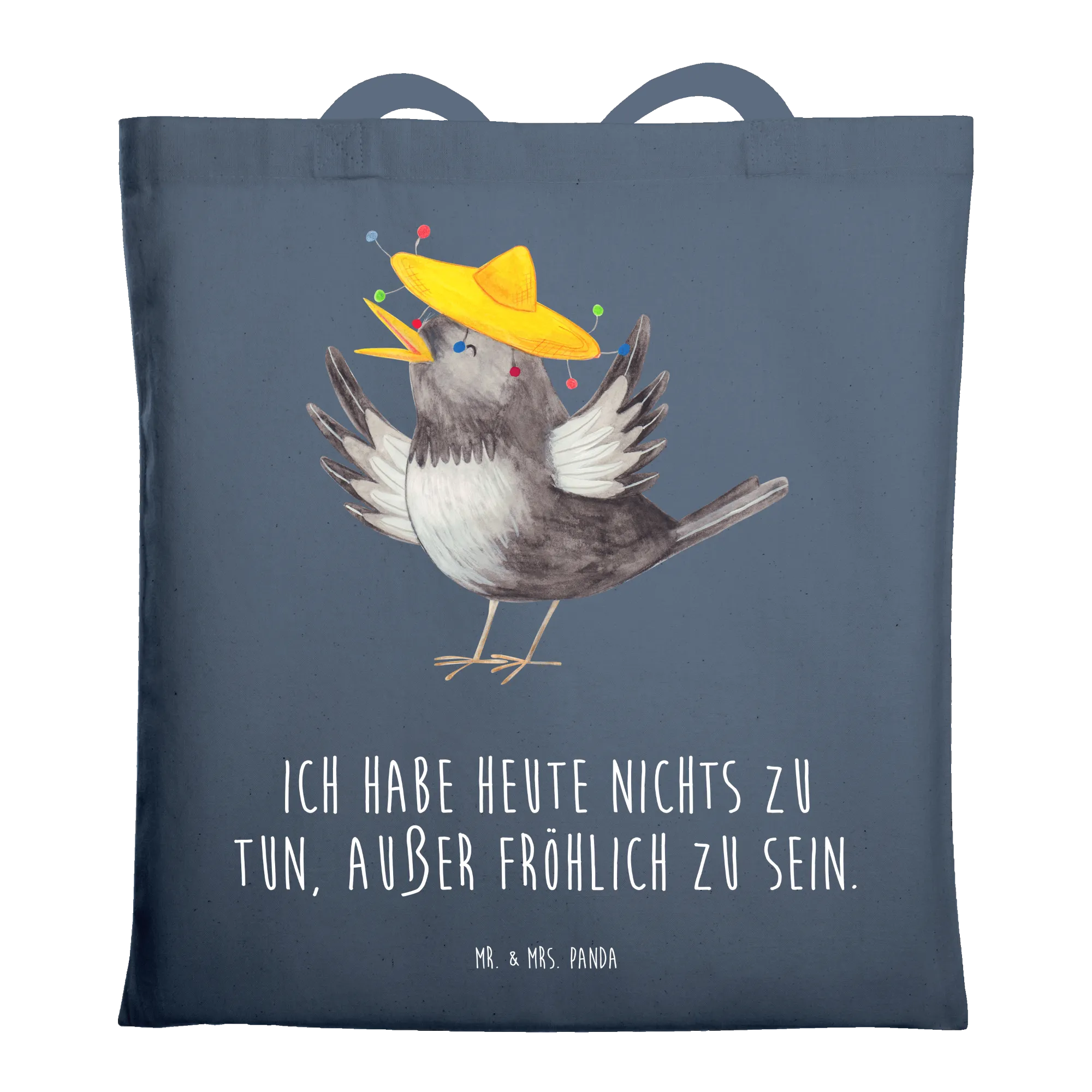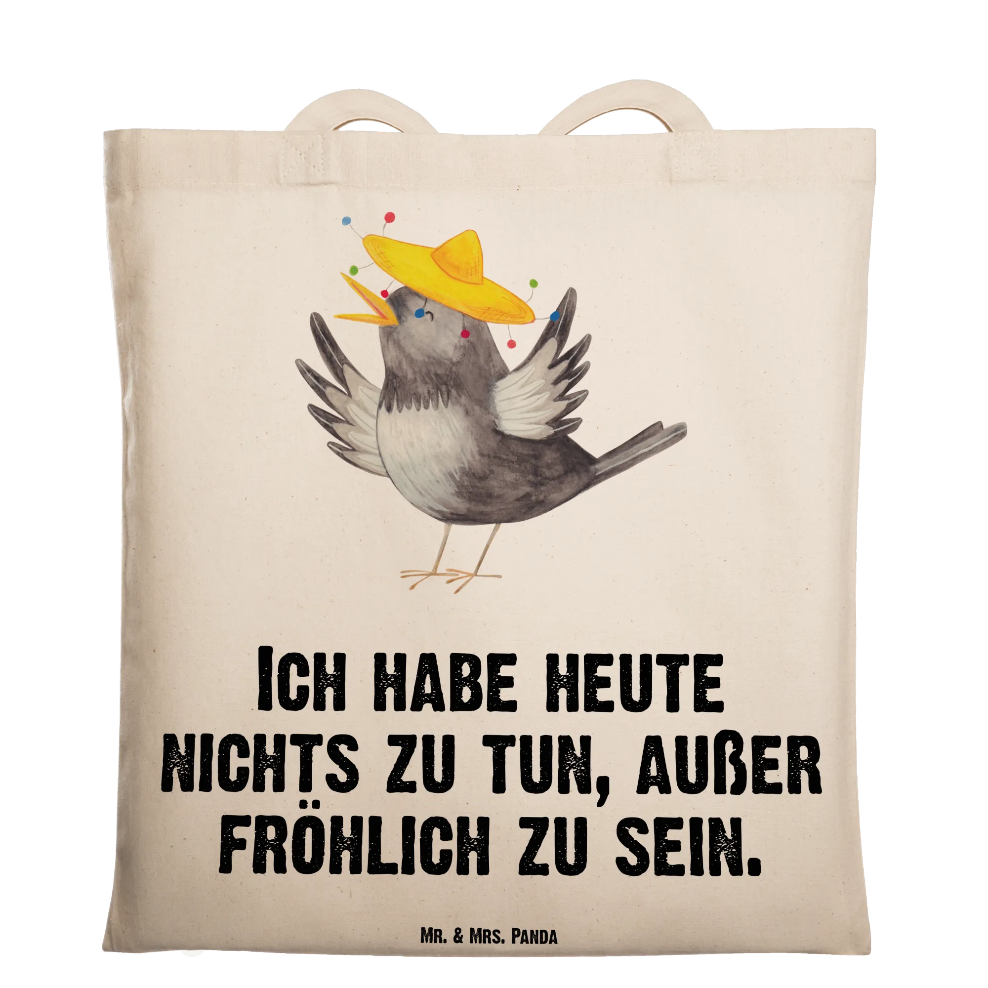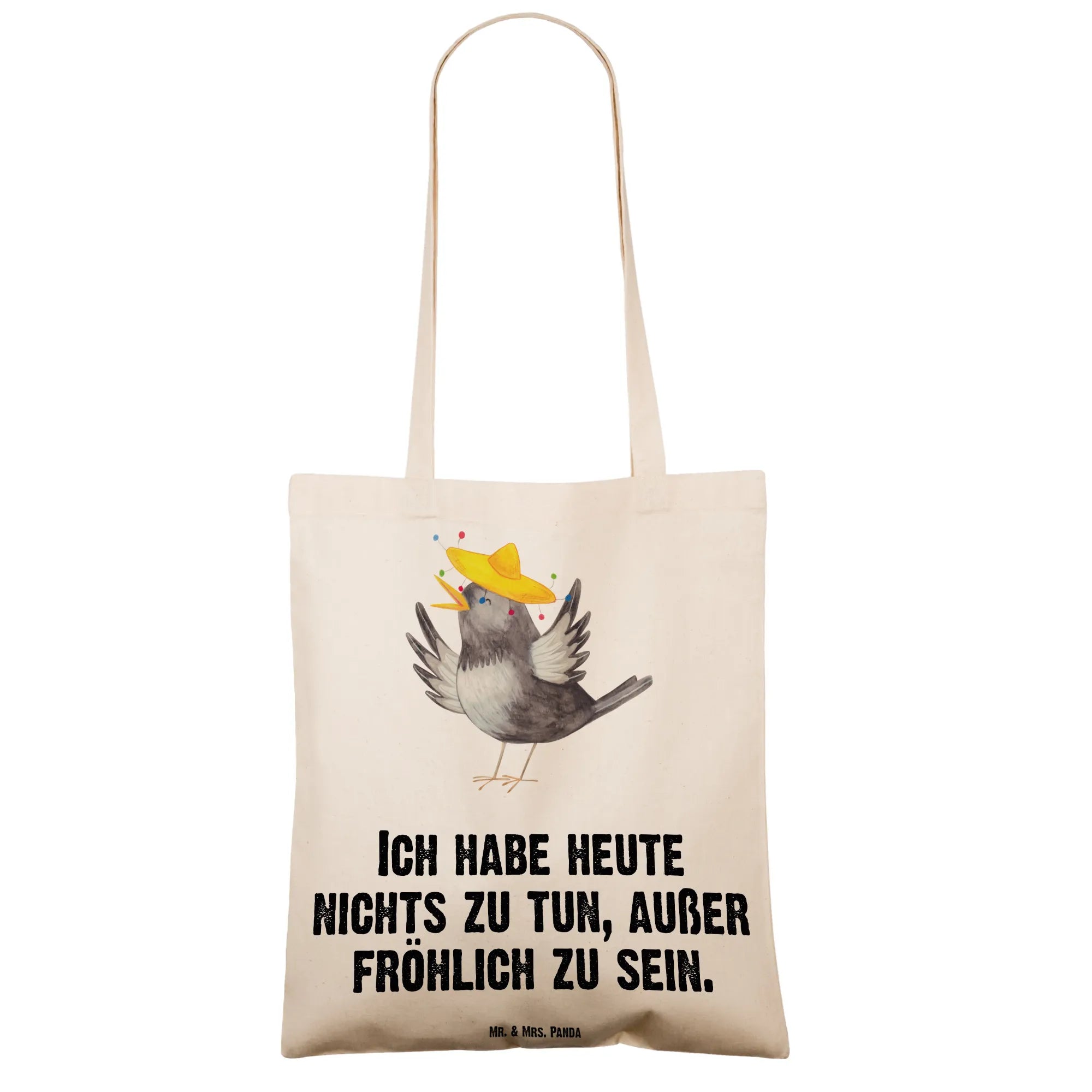 Eine wunderschöne Tragetasche von Mr. & Mrs. Panda – der fröhliche Rabe mit Sombrero aus der Small World-Kollektion bringt gute Laune in deinen Alltag. Mit dem liebevollen Spruch „Ich habe heute nichts zu tun, außer fröhlich zu sein.“ wird diese Tragetasche zum charismatischen Begleiter beim Einkauf, auf dem Campus oder beim Festival.