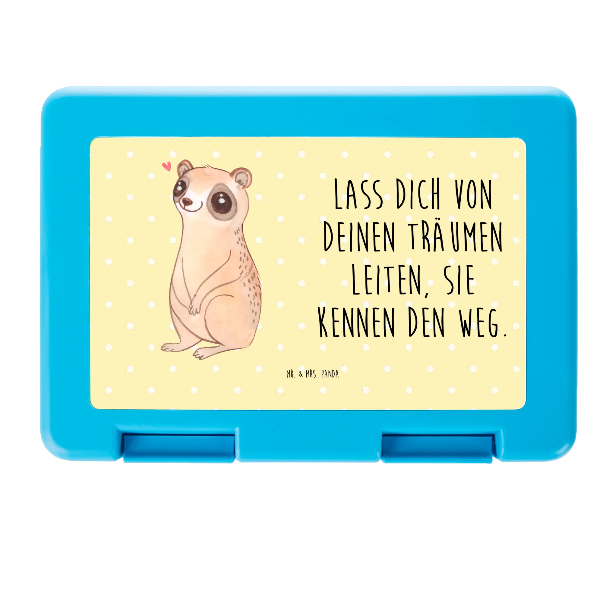 Diese liebevoll gestaltete Brotdose bringt gute Laune in jede Pause. Der bezaubernde Plumplori schaut mit großen, glücklichen Augen in die Welt und der eingearbeitete Spruch „Lass dich von deinen Träumen leiten, sie kennen den Weg.“ erinnert dich jeden Tag daran, mutig und neugierig zu bleiben. Das pastellgelbe Design ist freundlich und frisch – ein echter Blickfang in Rucksack oder Tasche.