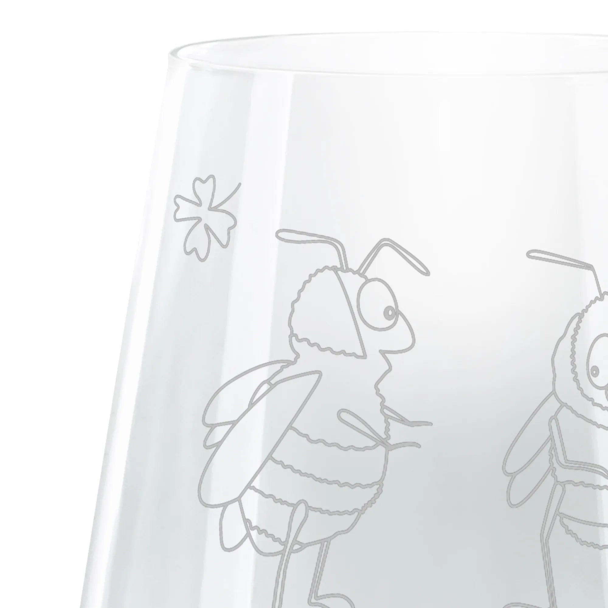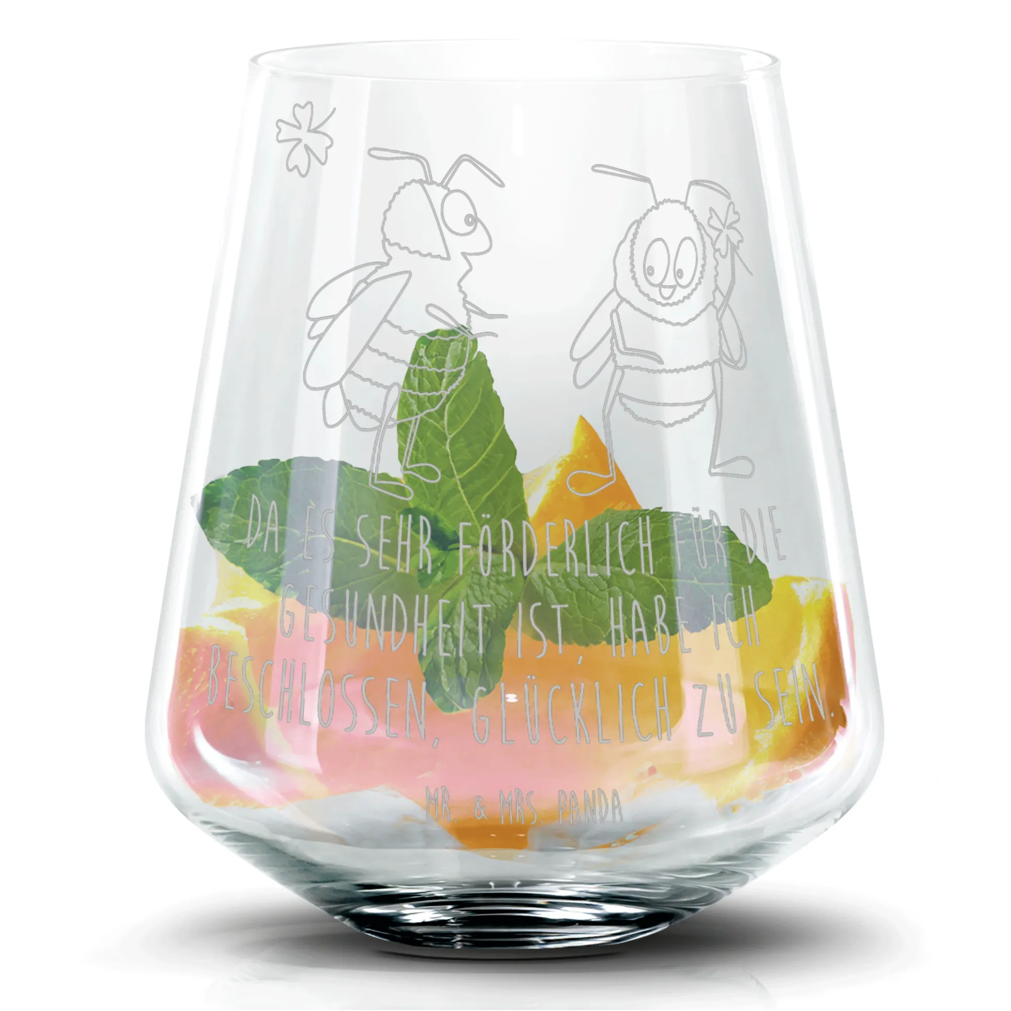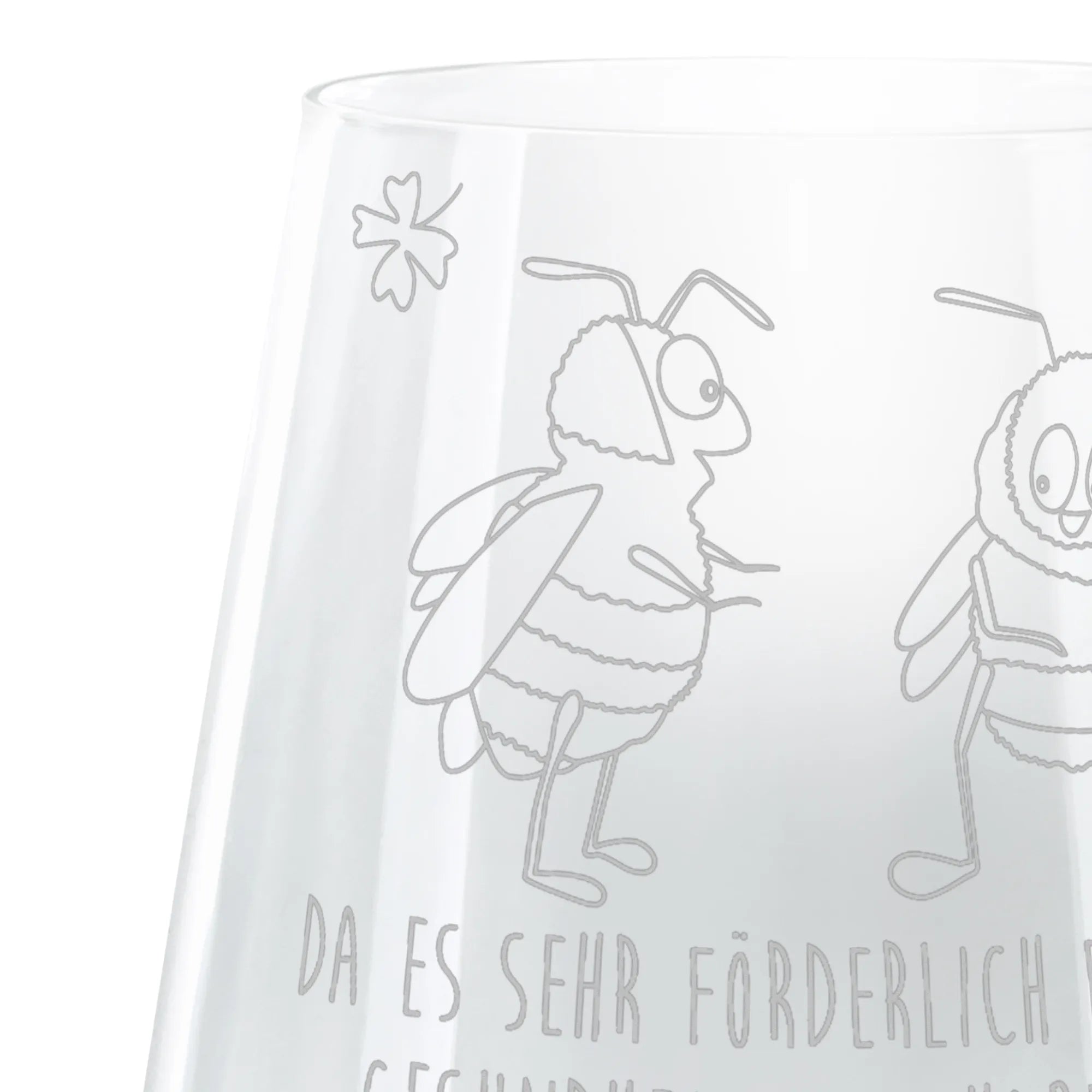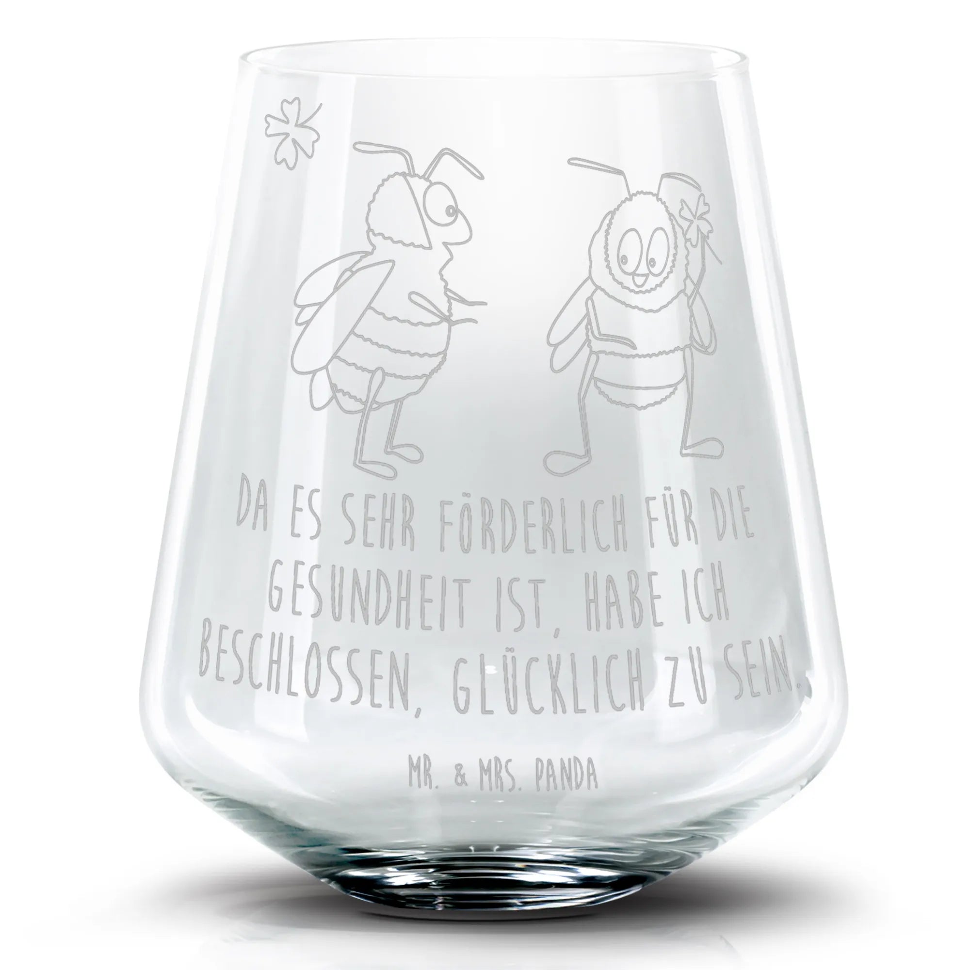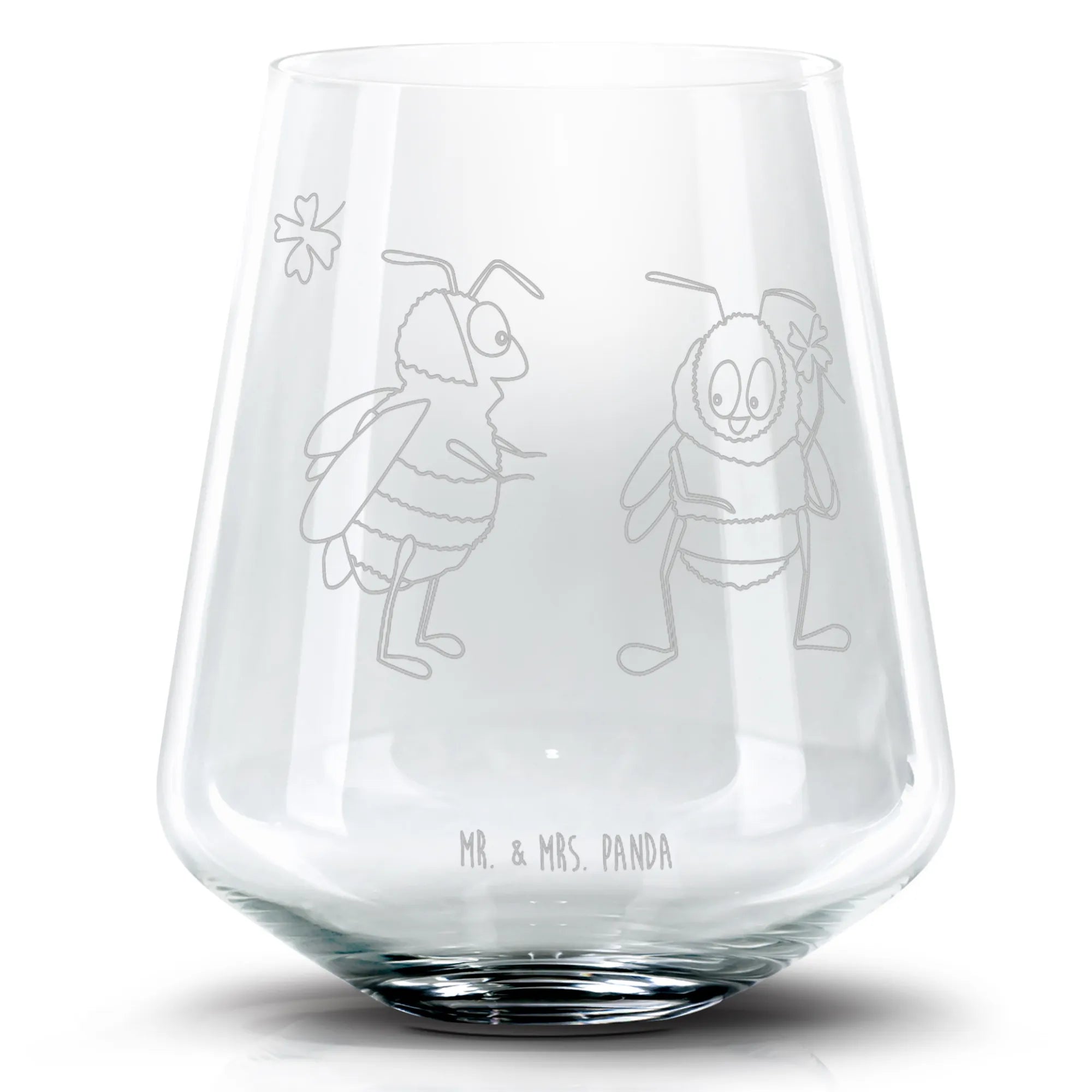 Die zwei niedlichen Hummeln stehen sich gegenüber und halten gemeinsam ein Kleeblatt in der Hand – ein Zeichen von Freundschaft, Liebe und Verbundenheit. Ob für die nächste Gartenparty, den Junggesellenabschied oder einfach zum gemütlichen Cocktailabend mit Freunden – dieses elegante Glas ist die ideale Wahl.