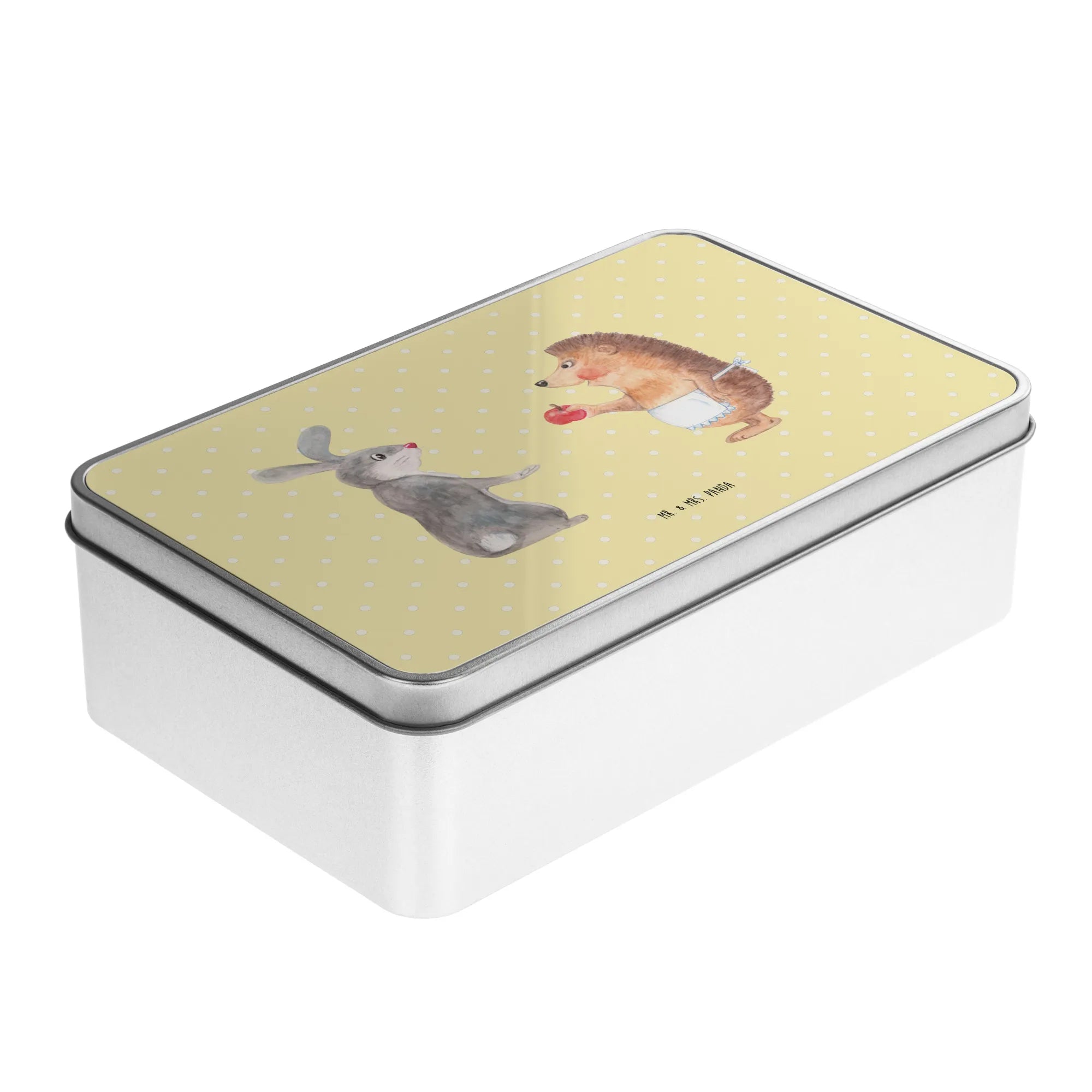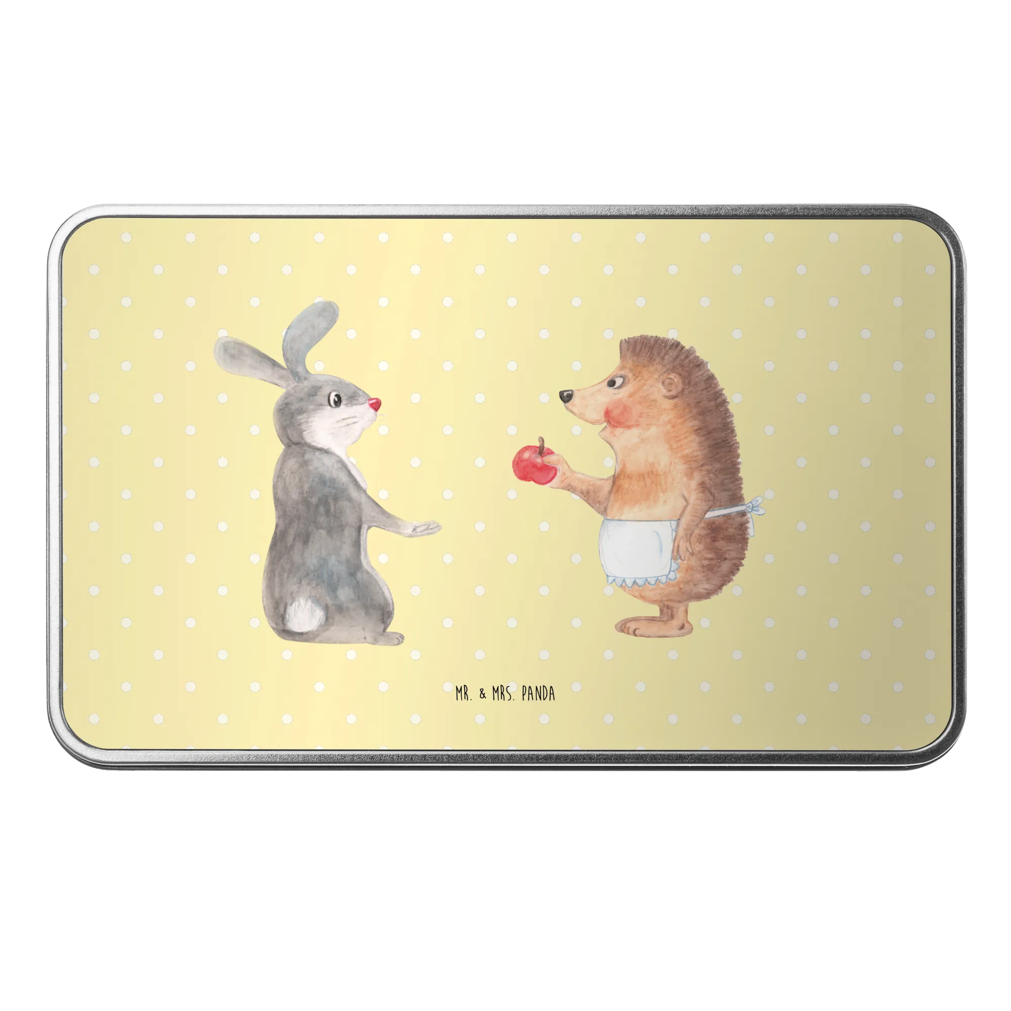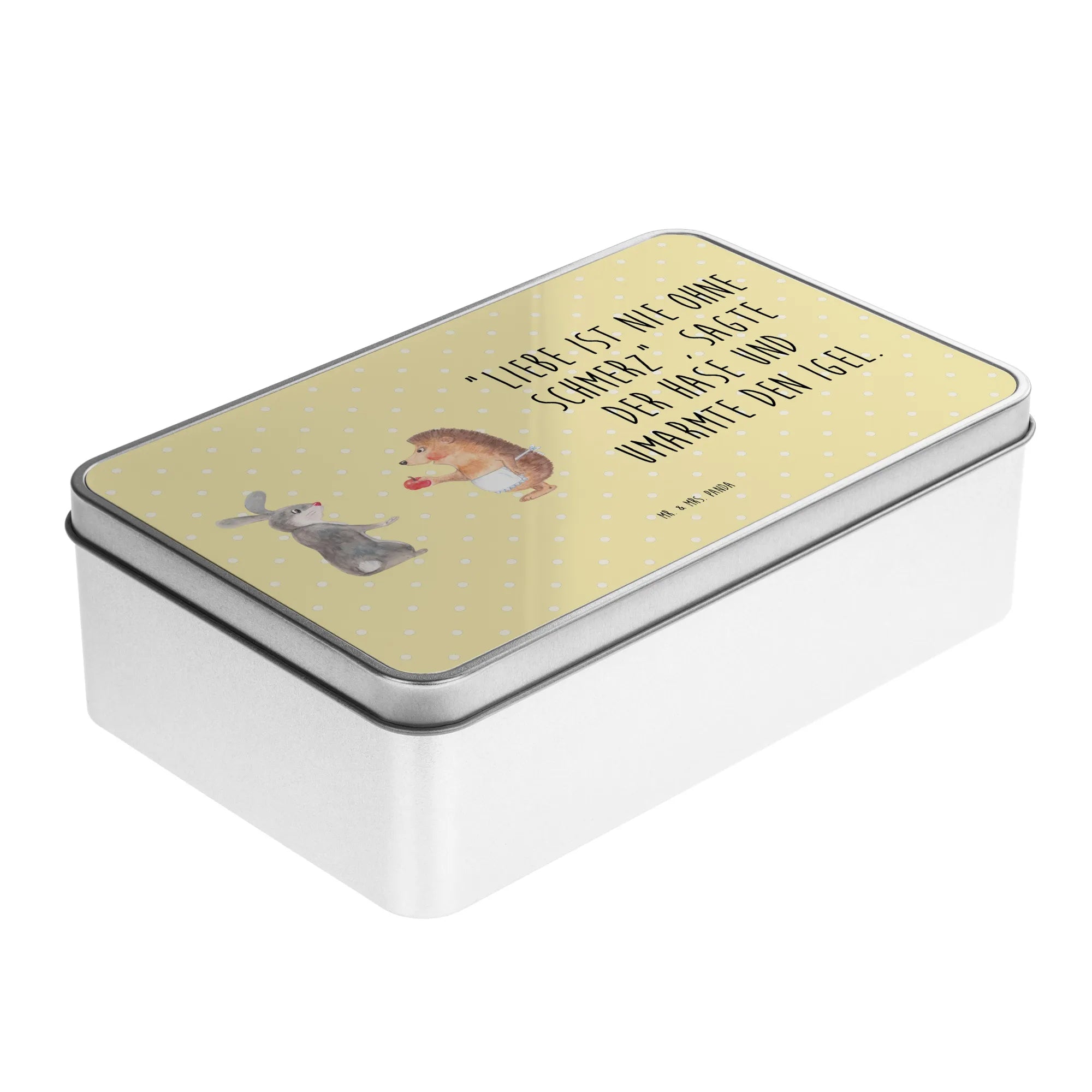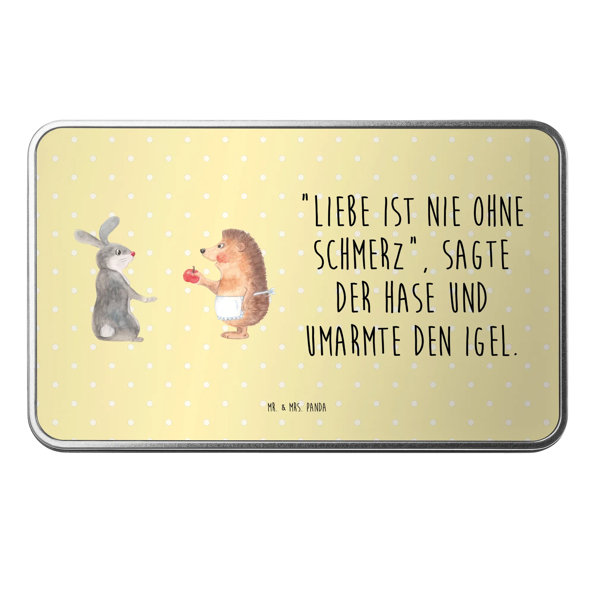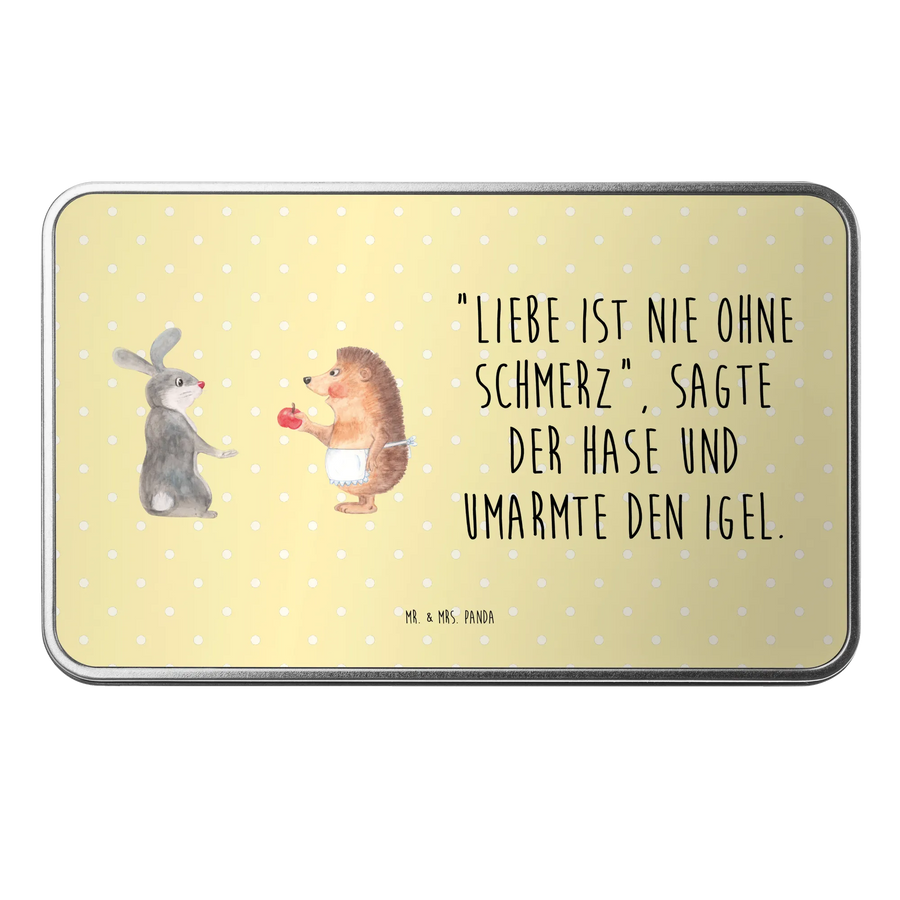 Das hochwertige Metall sorgt dafür, dass die Dose besonders stabil ist und über die Jahre hinweg in schönem Glanz erstrahlt. Die Aquarellzeichnung des niedlichen Hasen und des bezaubernden Igel zeigt, wie liebevoll die beiden miteinander verbunden sind. Mit dem Spruch ‘Liebe ist nie ohne Schmerz, sagte der Hase und umarmte den Igel’ wird die emotionale Tiefe der Beziehungen gewürdigt. Diese Metalldose aus der Small World Kollektion von Mr. & Mrs. Panda ist damit das ideale Geschenk für die, die in einer Beziehung stecken oder eine Trennung hinter sich haben.