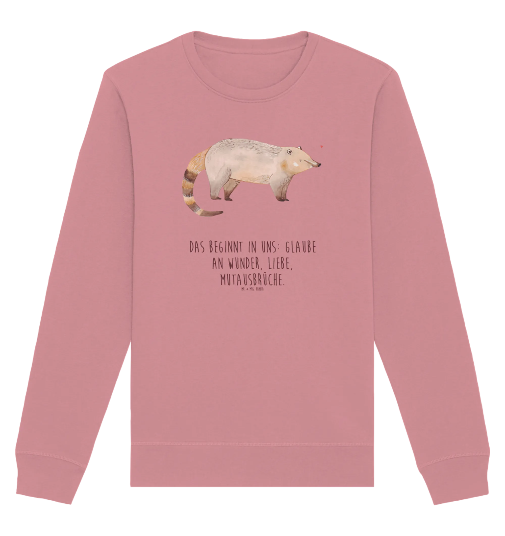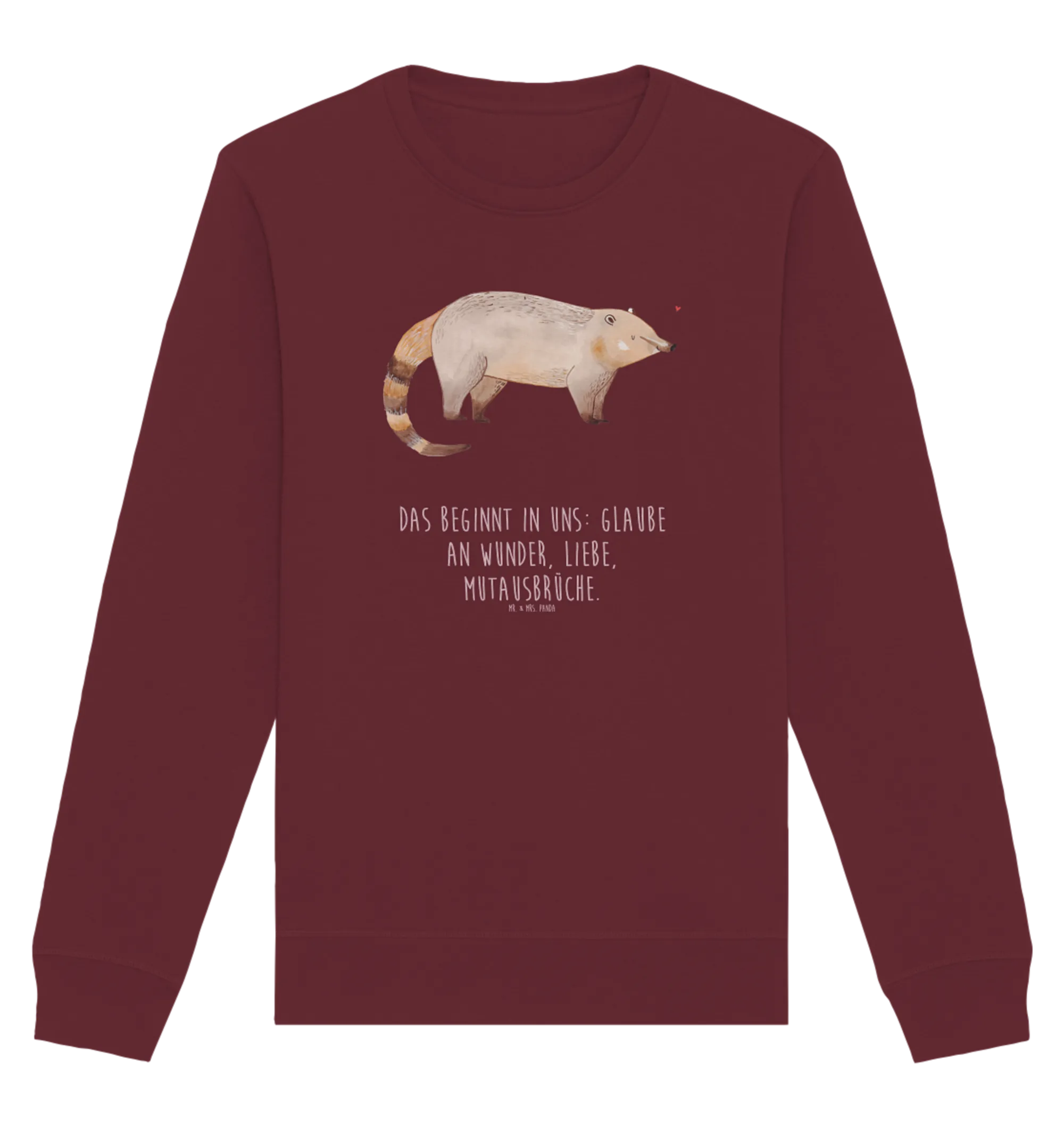 Dieses Motiv von einem Nasenbären, auch liebevoll Rüsselbär genannt, wird Ihrem Tag einen Hauch von Zauber verleihen. Mit seinem verspielten Blick und dem sanft geschwungenen Schwanz offenbart er eine Welt voller Wärme und Fantasie. Mr. & Mrs. Panda haben mit 'Das beginnt in uns: Glaube an Wunder, Liebe, Mutausbrüche' einen Spruch geschaffen, der wie eine sanfte Umarmung für die Seele wirkt. Dieser kleine Nasenbär erinnert uns daran, das Leben mit einer Prise Optimismus und einem Herz voller Liebe zu betrachten. Lassen Sie sich von ihm inspirieren, jeden Tag als eine Chance zu begreifen, Ihr eigenes Wunder zu gestalten.