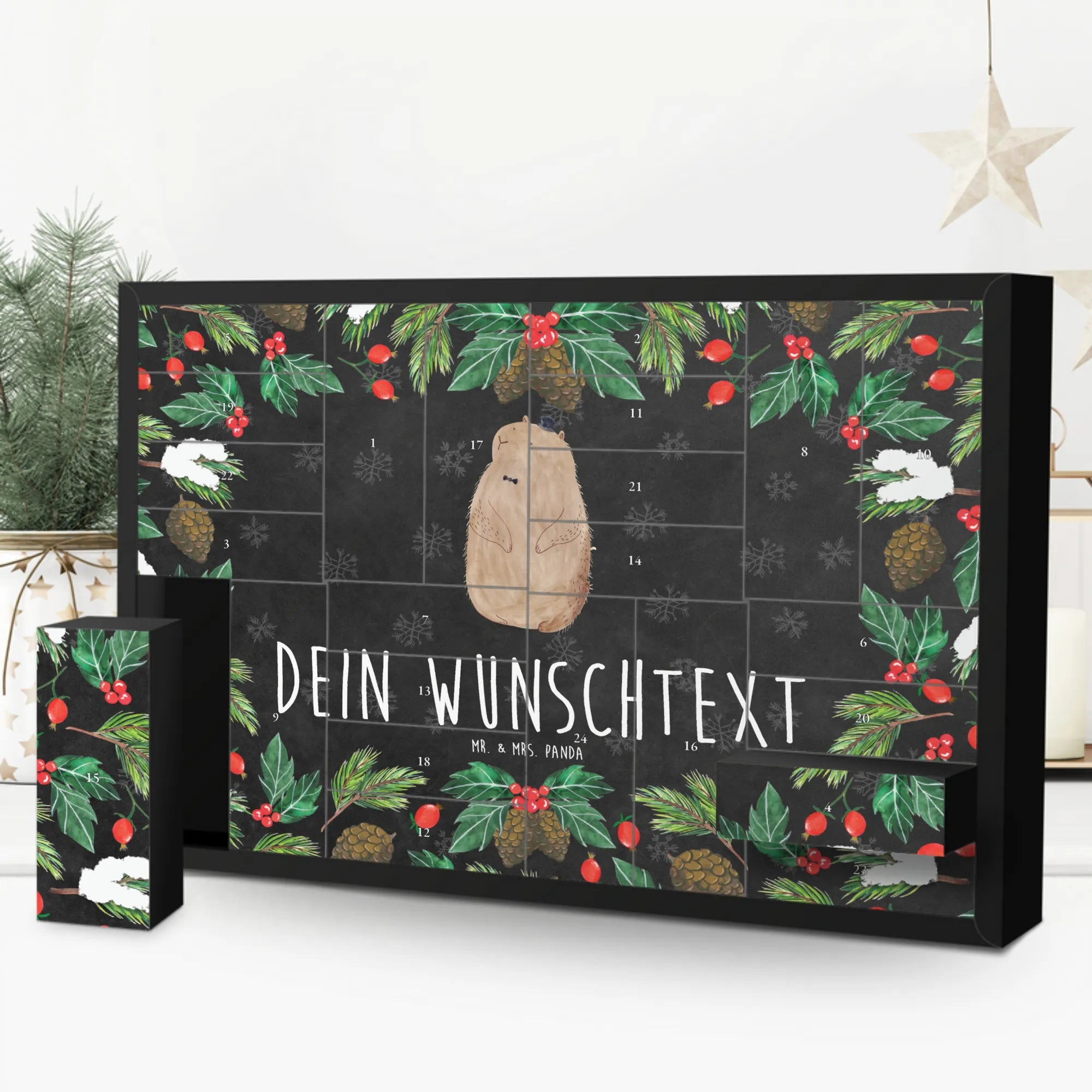 Personalisierter Befüllbarer Adventskalender von Mr. & Mrs. Panda – dein perfekter Begleiter durch die Vorweihnachtszeit! Dieser liebevoll gestaltete Adventskalender ist bedruckt mit wunderschönen Sprüchen und Motiven von Mr. & Mrs. Panda und lässt sich ganz nach deinem Geschmack personalisieren: Trage deinen Wunschnamen oder Wunschtext ein, und wir drucken ihn auf die Vorderseite. Auf der Frontseite findest du eine zauberhafte Zeichnung von Mrs. Panda, die dem Kalender einen warmen, persönlichen Touch verleiht. Der Kalender verfügt über 24 praktische Schachteln zum Selbstbefüllen, ideal für kleine Überraschungen, Süßigkeiten oder liebe Botschaften. Material: stabiler Adventskalender Karton mit brillanter Druckqualität und seidenmatter Oberfläche für eine hochwertige Optik. Besonderheit: inklusive Aufstellvorrichtung, sodass du den Kalender überall dekorativ platzieren kannst. Besonderer Hinweis: wird ohne Füllung geliefert – so kannst du ihn individuell bestücken. Maße: Breite: 619 mm, Höhe: 405 mm, Tiefe: 50 mm. Ein tolles Geschenk für Familie, Freunde oder als persönliche Deko für dein Zuhause. Bestelle jetzt deinen personalisierten Adventskalender und erfreue deine Liebsten jeden Tag im Dezember mit kleinen Überraschungen!