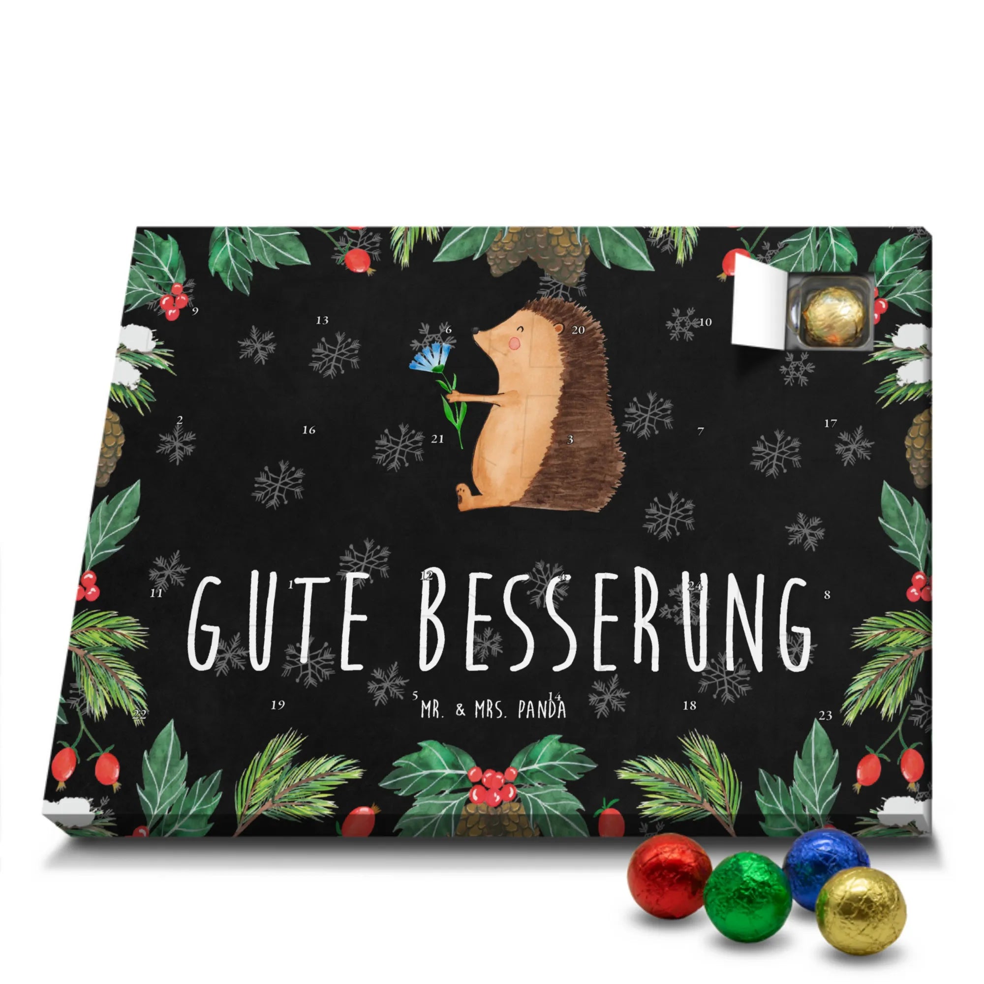 Wunderschöner Adventskalender mit Schokolade von Mr. & Mrs. Panda – für alle, die Advent und Design lieben. Dieser Adventskalender mit Schokolade ist liebevoll bedruckt mit wunderschönen Motiven & Sprüchen von Mr. & Mrs. Panda und ist nicht personalisierbar, aber mit viel Liebe zum Detail gefertigt. Brillante Druckqualität mit seidenmatter Oberflächenveredelung sorgt für einen edlen Look, und die bedruckten Seitenflächen geben dem Kalender eine besondere Optik. Maße: 233 mm x 178 mm x 24 mm. Dank seiner stabilen Verarbeitung kannst du ihn aufstellen oder ganz einfach aufhängen – Besonderheit: kann aufgehängt oder aufgestellt werden. Gefüllt mit MARKENNAMEN Schokolade und leckeren Schokoladenkugeln, bringt er jeden Tag ein kleines Glückserlebnis. Wichtige Hinweise: (Kann Spuren von Haselnüssen, Mandeln, Gluten und Soja enthalten!), bitte kühl und trocken lagern. Ob als Geschenk, Mitbringsel oder Adventsdeko – dieser Kalender zaubert ein Lächeln und sorgt für gemütliche Vorfreude. Viel Freude beim Entdecken der süßen Überraschungen wünscht dir Mr. & Mrs. Panda!