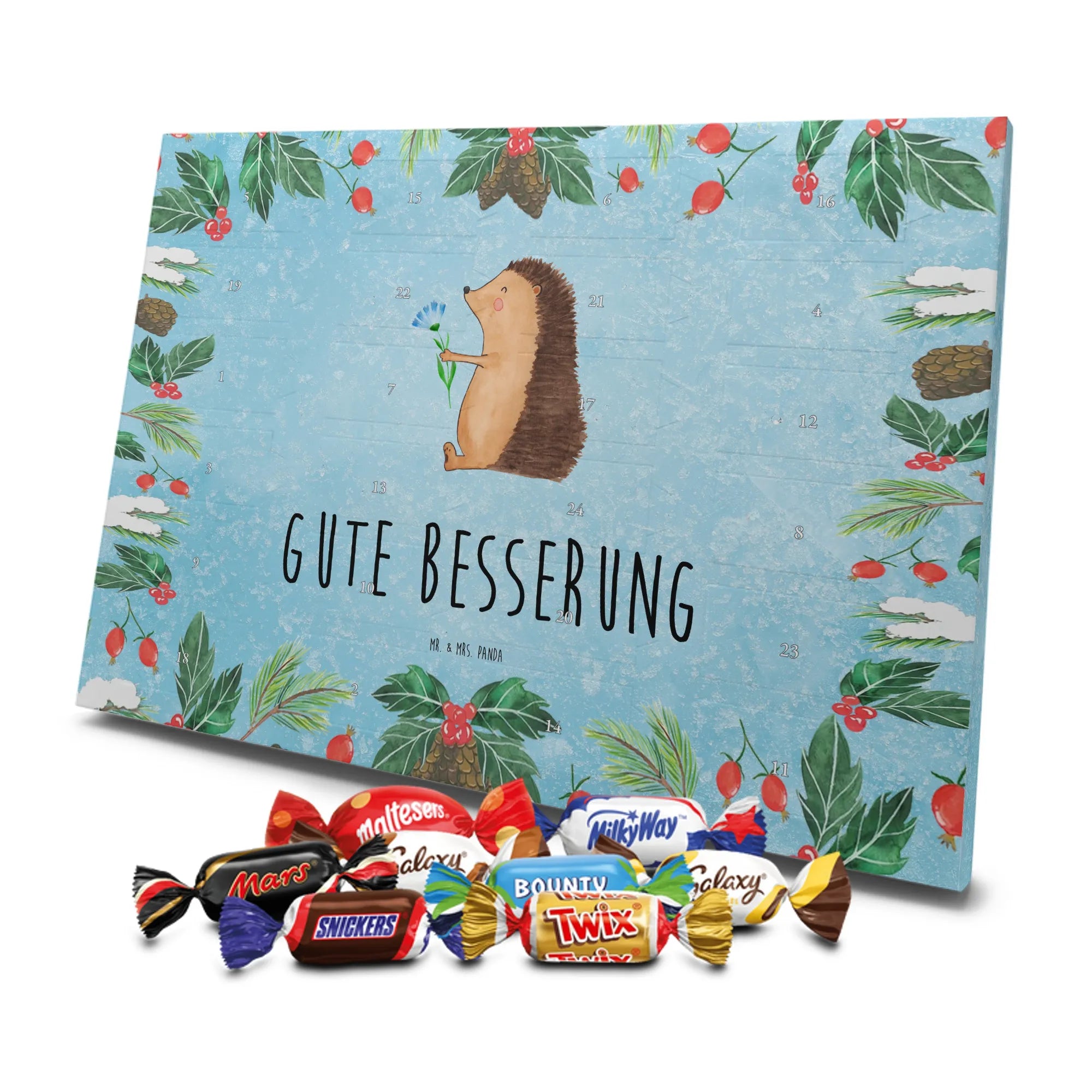 Unser Schoko Adventskalender von Mr. & Mrs. Panda bringt dir und deinen Lieben jede Menge Vorfreude und zauberhafte Momente in die Adventszeit. Der Kalender ist liebevoll bedruckt mit wunderschönen Motiven und frechen Sprüchen im typischen Mr. & Mrs. Panda Stil – ein echter Blickfang auf dem Tisch oder an der Wand. Die brillante Druckqualität kombiniert mit einer seidenmatten Oberflächenveredelung sorgt für edle Farben und ein angenehmes Gefühl beim Anfassen. Auch die Seitenflächen sind bedruckt, sodass der Kalender von allen Seiten hübsch aussieht. Er ist nicht personalisierbar, dafür aber in seiner Gestaltung rundum stimmig. Gefüllt ist der Adventskalender mit 24 hochwertigen Celebrations-Füllungen in acht verschiedenen Sorten: Maltesers, Mars, Snickers, Twix, Milky Way, Bounty, Galaxy und Galaxy Caramel — so ist für jede Naschkatze etwas dabei. Die Besonderheit: Du kannst den Kalender entweder aufstellen oder dank rückseitiger Aufhängung an die Wand hängen. Maße: 325 mm x 225 mm x 27 mm. Ein liebevolles Geschenk für Familie, Freunde oder einfach für dich selbst, das kleine tägliche Glücksmomente schenkt und die Adventszeit versüßt.
