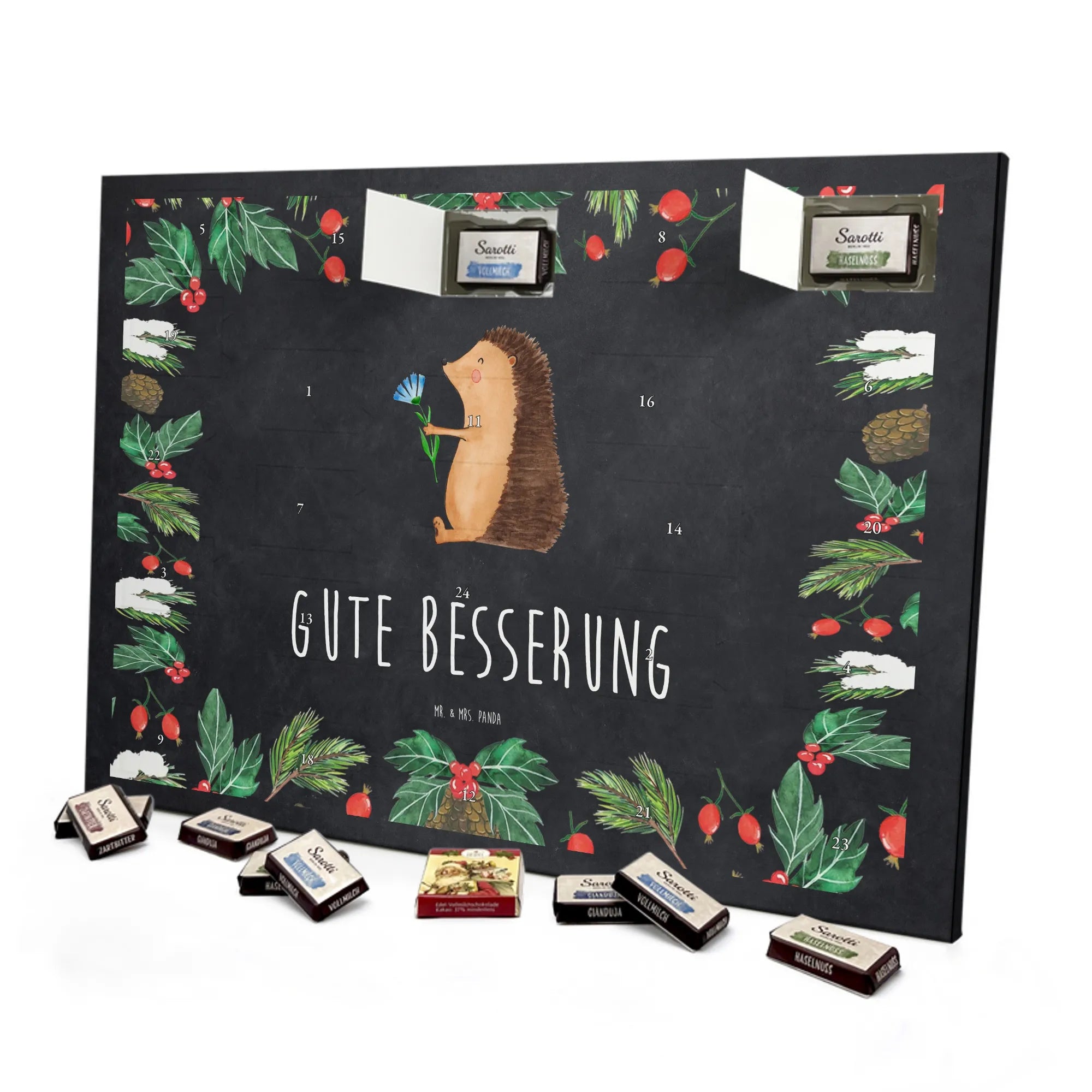 Unser Schokolade Adventskalender von Mr. & Mrs. Panda bringt dir jeden Tag im Dezember ein kleines Glücksgefühl. Die Außenseite ist liebevoll bedruckt mit niedlichen Illustrationen und herzlichen Sprüchen – in brillanter Druckqualität und mit seidenmatter Oberflächenveredelung für einen edlen Look. Die Seitenflächen sind ebenfalls bedruckt, sodass der Kalender von allen Seiten ein echter Hingucker ist. Du kannst ihn hinstellen oder an die Wand hängen, ganz wie es dir gefällt. Der Kalender ist nicht personalisierbar, dafür aber mit feiner Markenschokolade bestückt: 24 einzeln verpackte Schokoladentäfelchen in vier köstlichen Geschmacksrichtungen aus dem Hause Sarotti® und Confiserie Heidel® (Vollmilch, Nougat, Zartbitter, Haselnuss). Insgesamt sind 107 g Markenschokolade enthalten. Maße: 355 mm x 245 mm x 11 mm – ideal für Tisch, Regal oder Fensterbank. Verschenke warme Vorfreude, liebevolle Gestaltung und kleine Schoko-Überraschungen an deine Liebsten – im typischen, gemütlichen Stil von Mr. & Mrs. Panda.