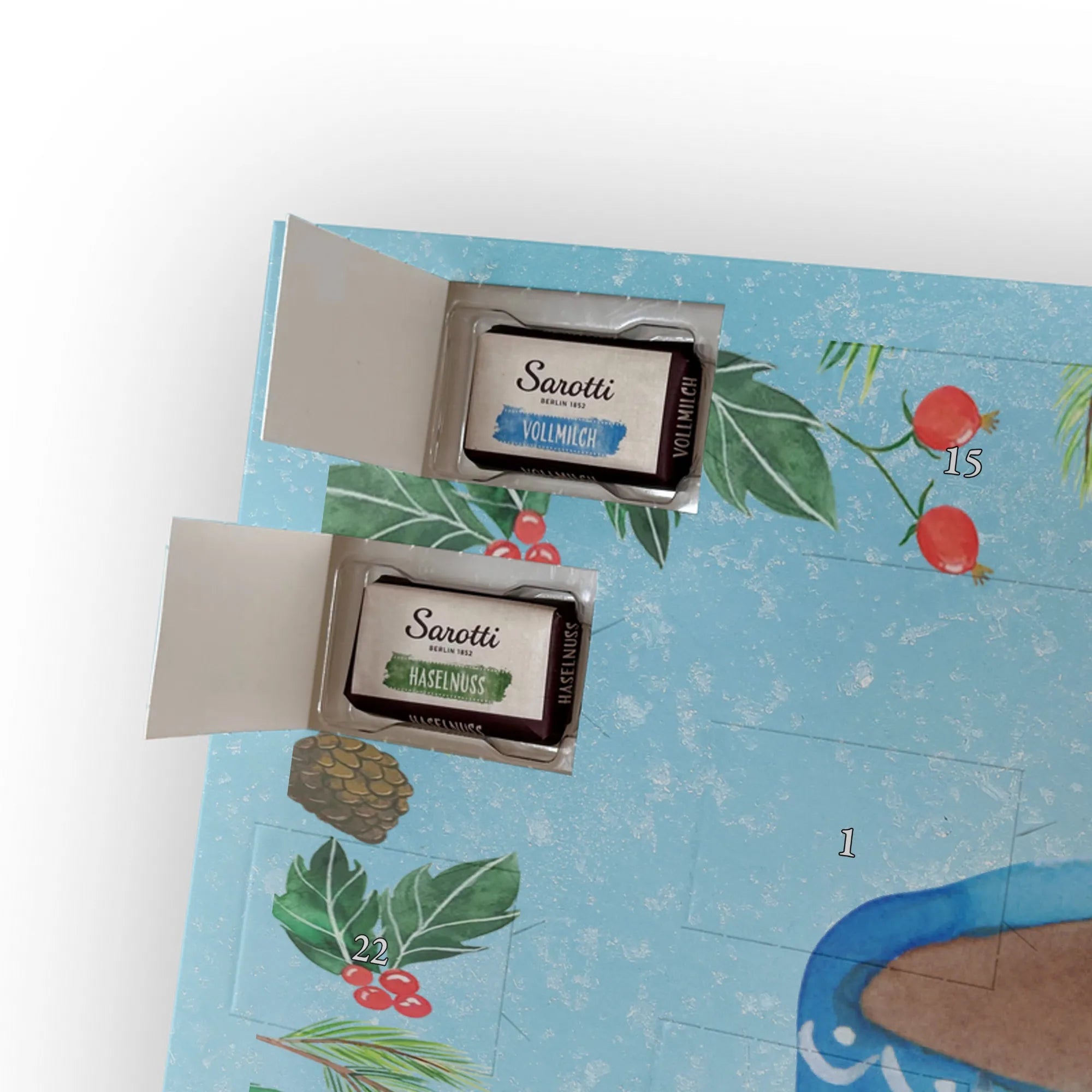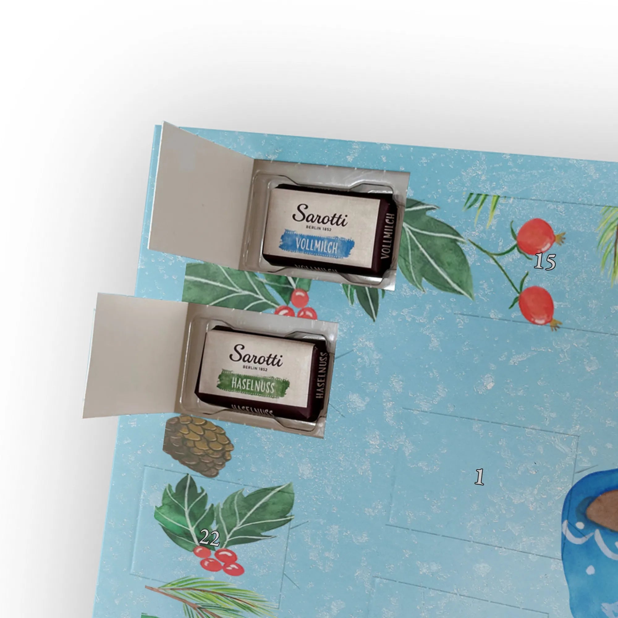 - Gefüllt mit 24 einzeln verpackten Schokoladentäfelchen von Sarotti® und Confiserie Heidel®.