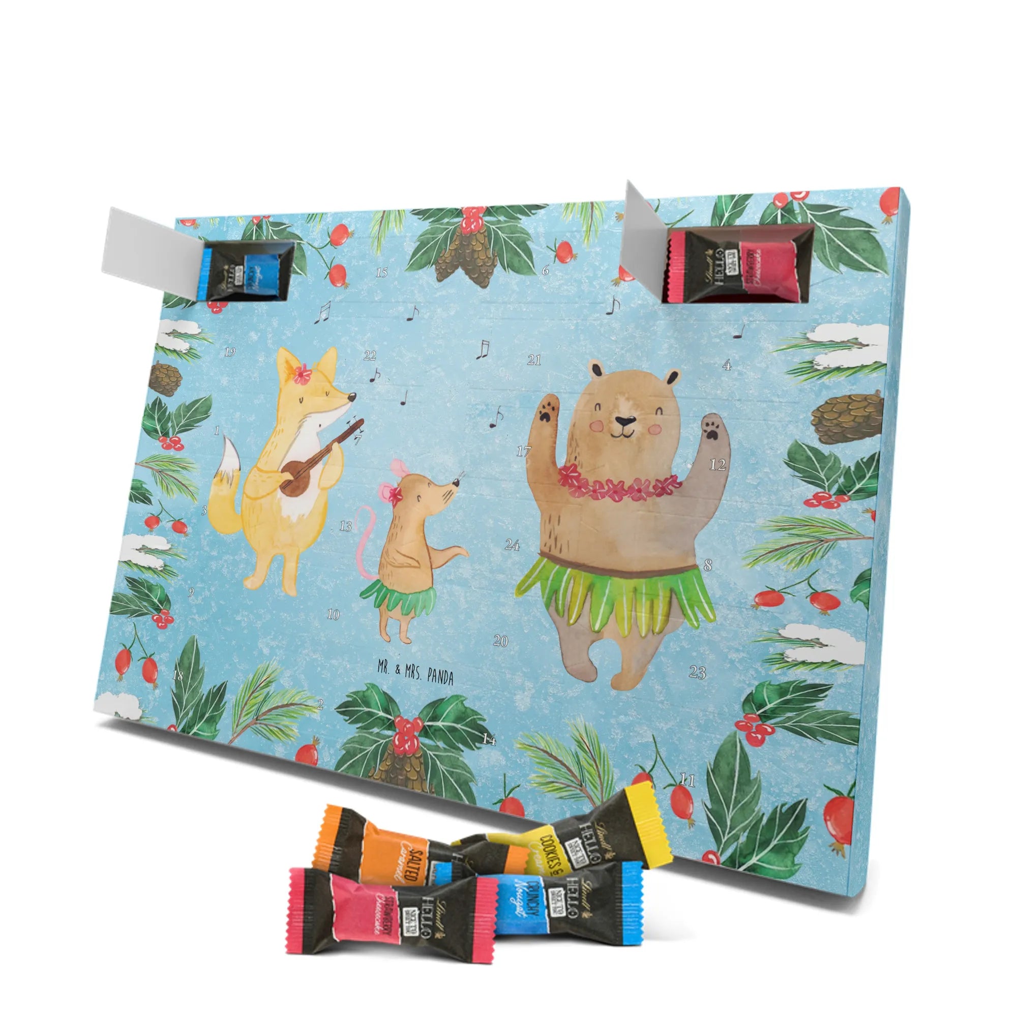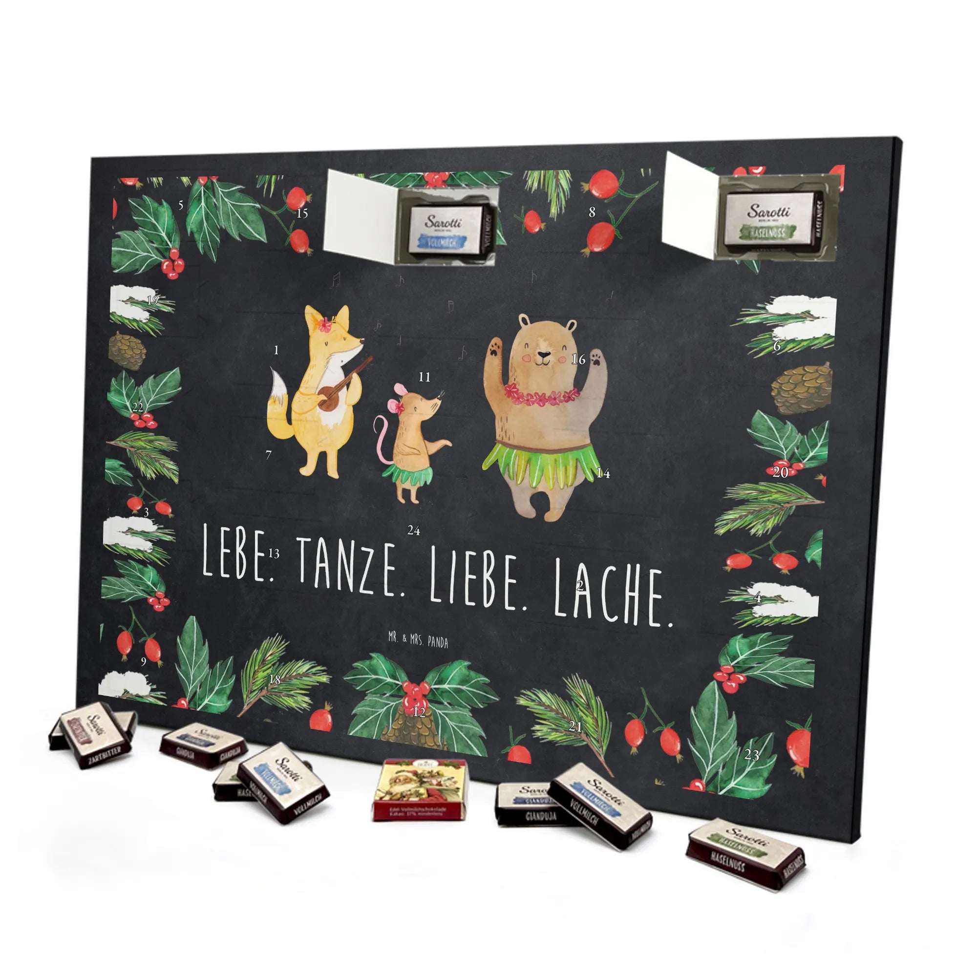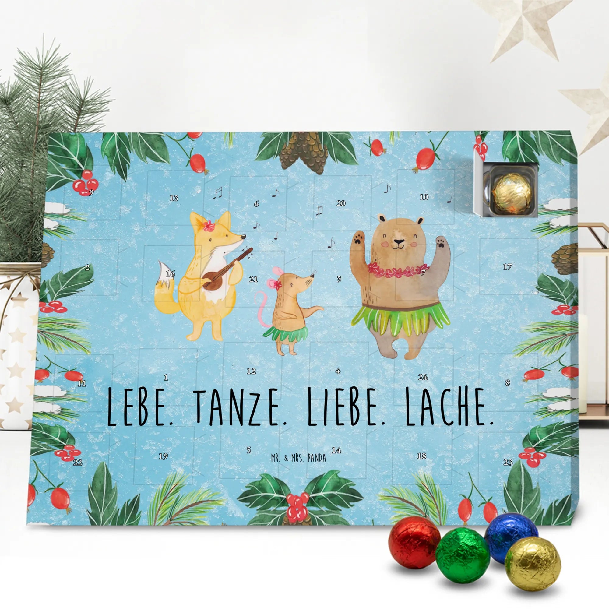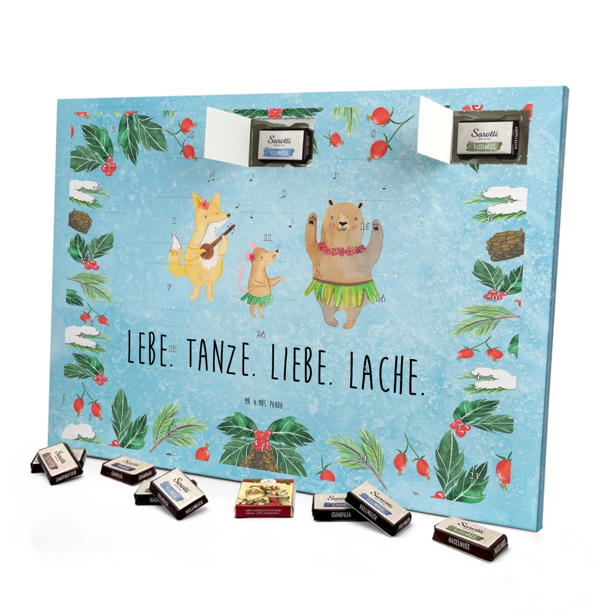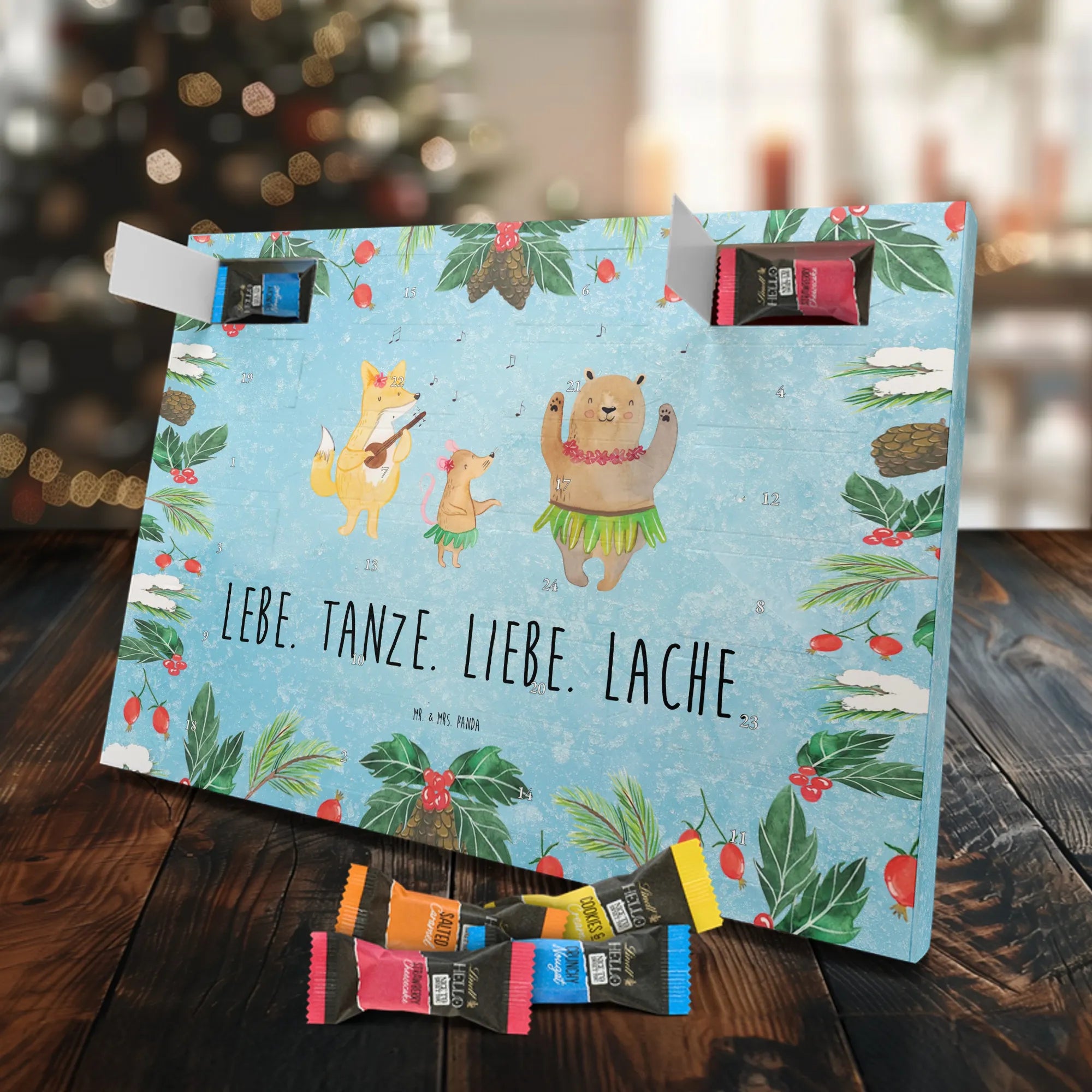 Mit diesem zauberhaften Schokoladen Adventskalender von Mr. & Mrs. Panda wird die Adventszeit bunt und fröhlich. Das Motiv zeigt niedliche Waldbewohner in Hula-Röcken, die zur hawaiianischen Musik tanzen. Der Slogan „Lebe. Tanze. Liebe. Lache.“ bringt genau die richtige Portion Gute Laune in jeden Dezembermorgen.