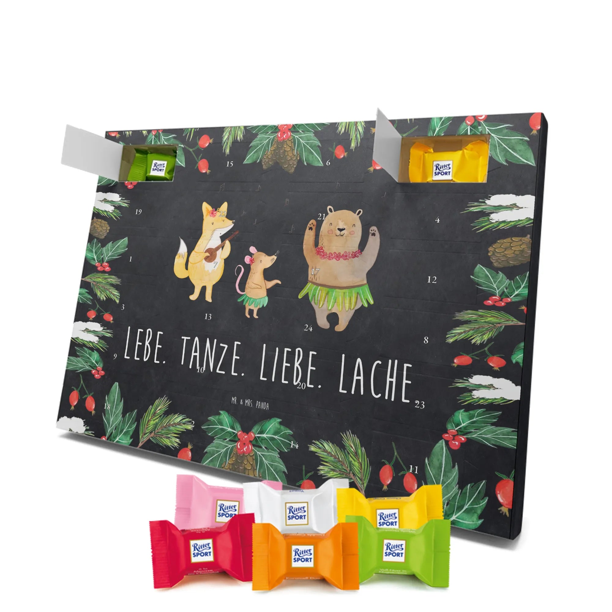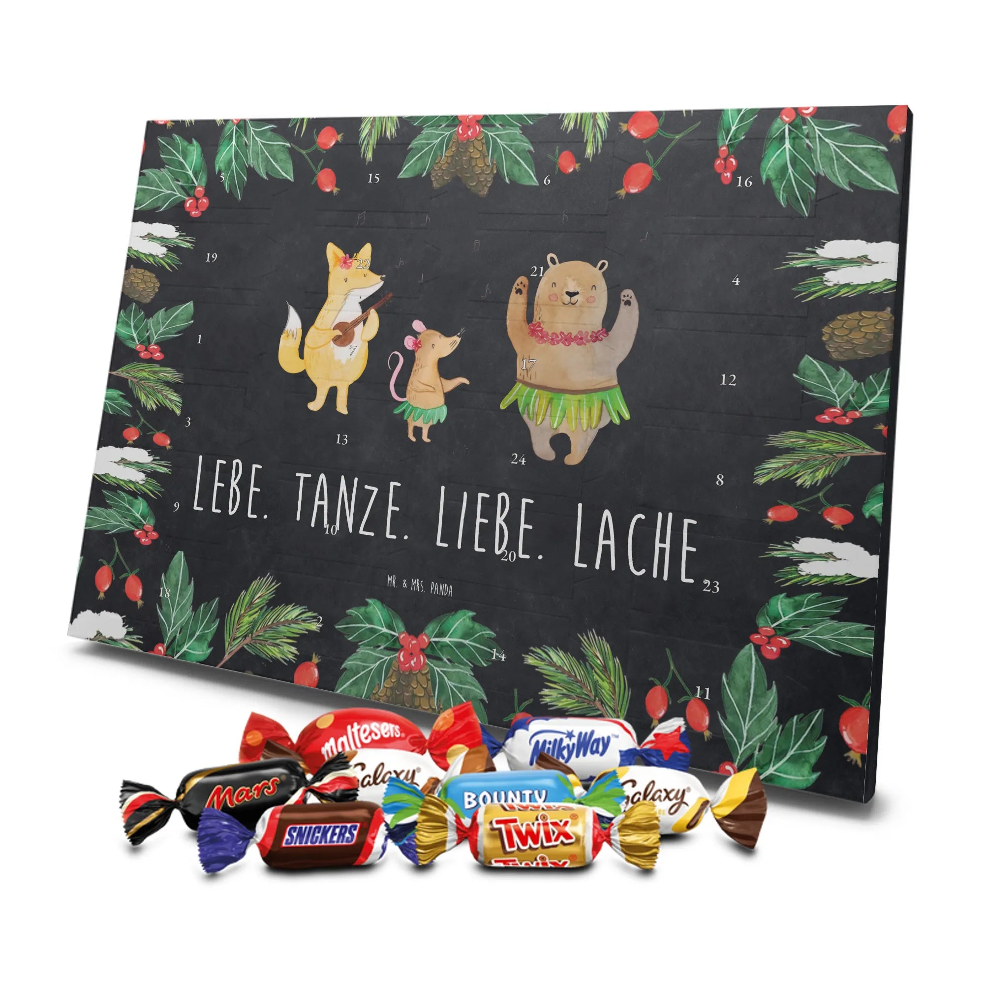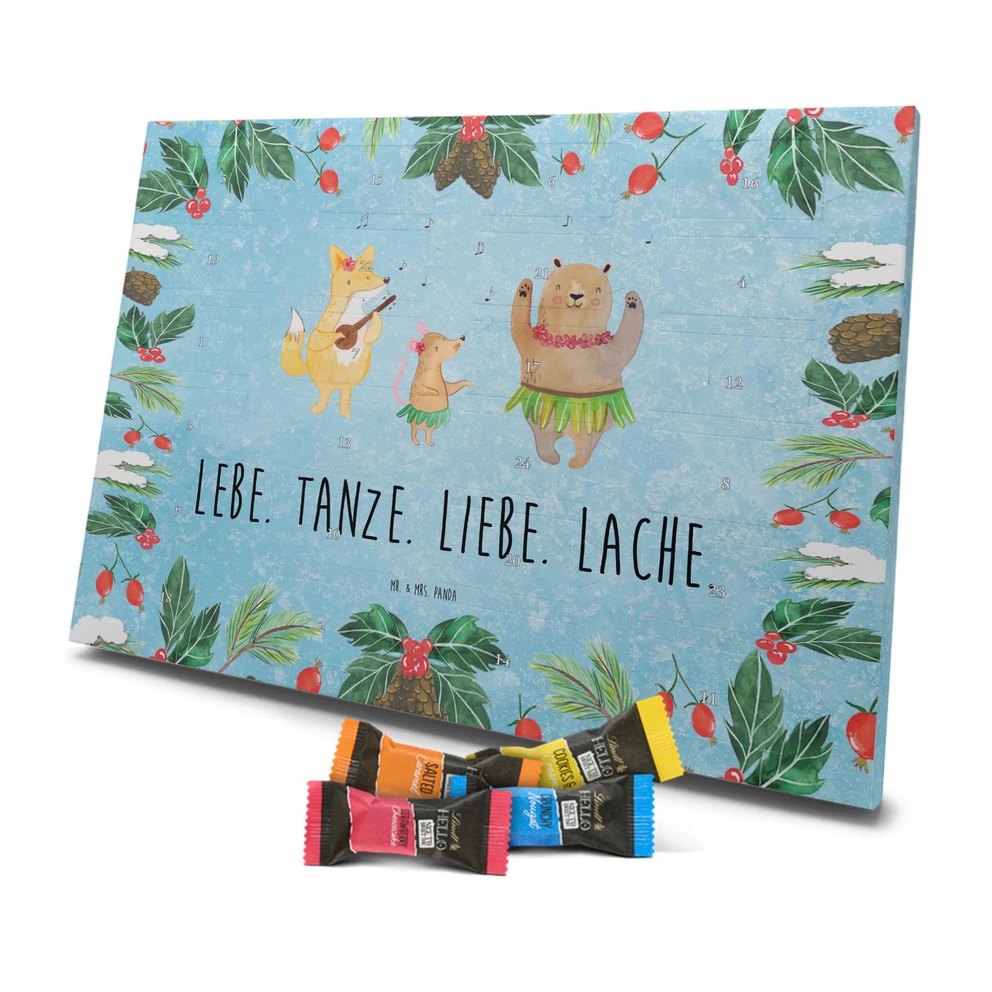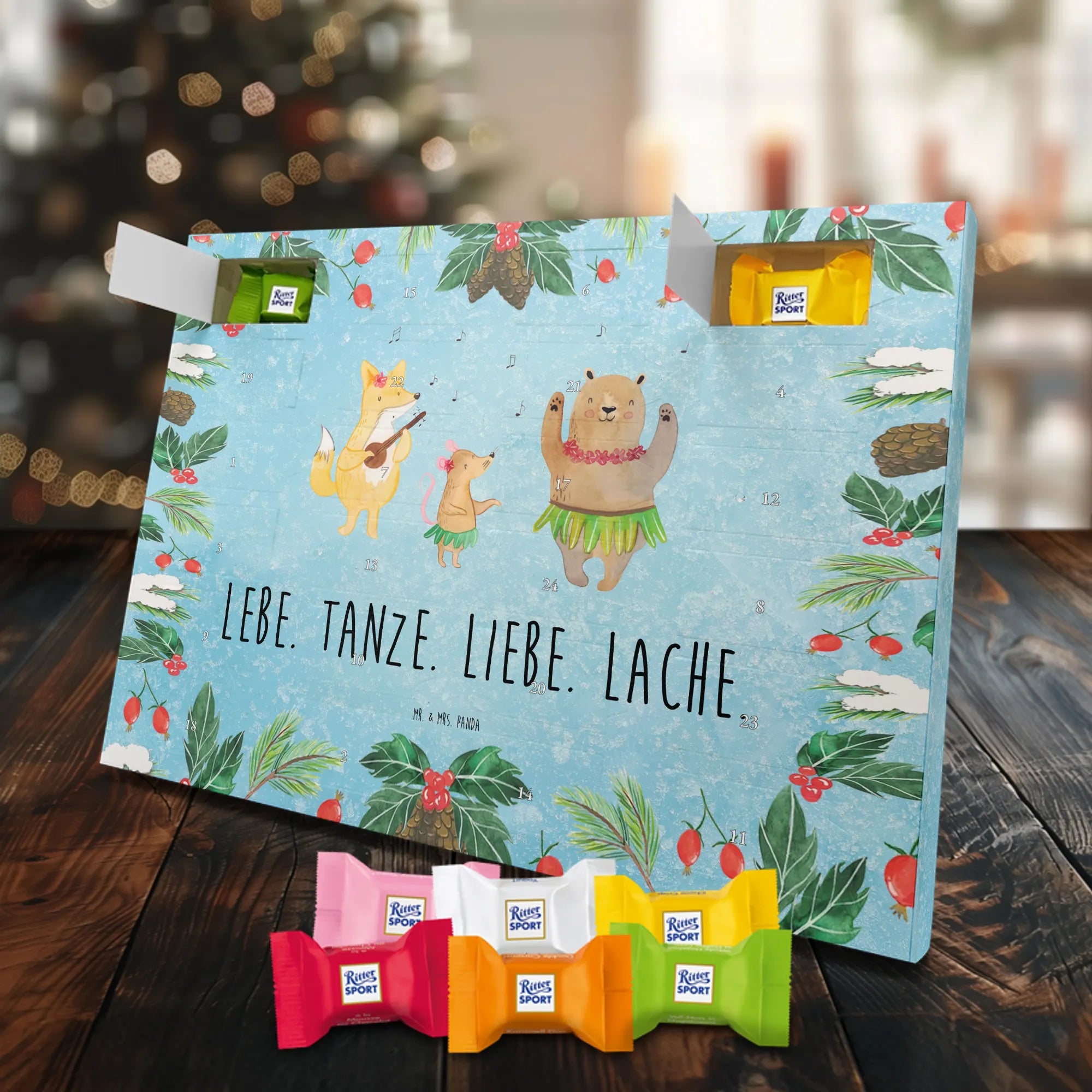 Mit diesem zauberhaften Schokoladen Adventskalender von Mr. & Mrs. Panda wird die Adventszeit bunt und fröhlich. Das Motiv zeigt niedliche Waldbewohner in Hula-Röcken, die zur hawaiianischen Musik tanzen. Der Slogan „Lebe. Tanze. Liebe. Lache.“ bringt genau die richtige Portion Gute Laune in jeden Dezembermorgen.
