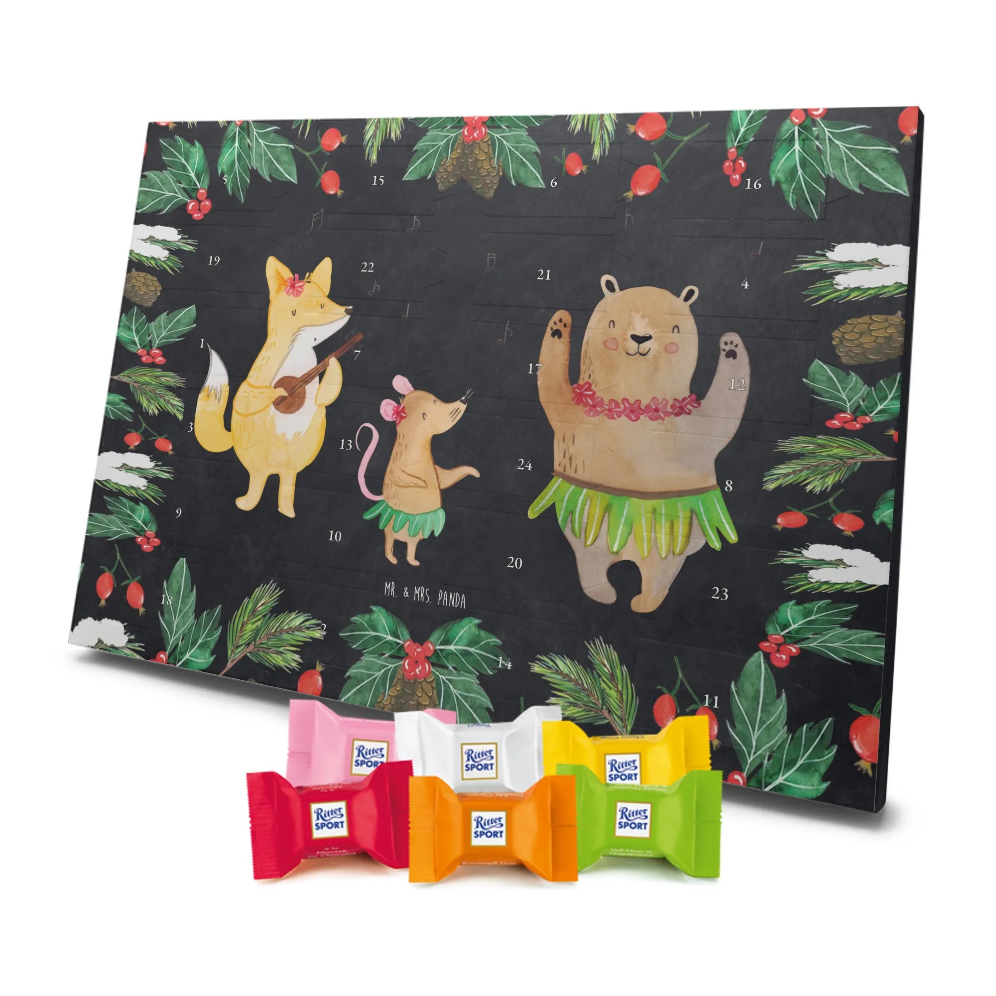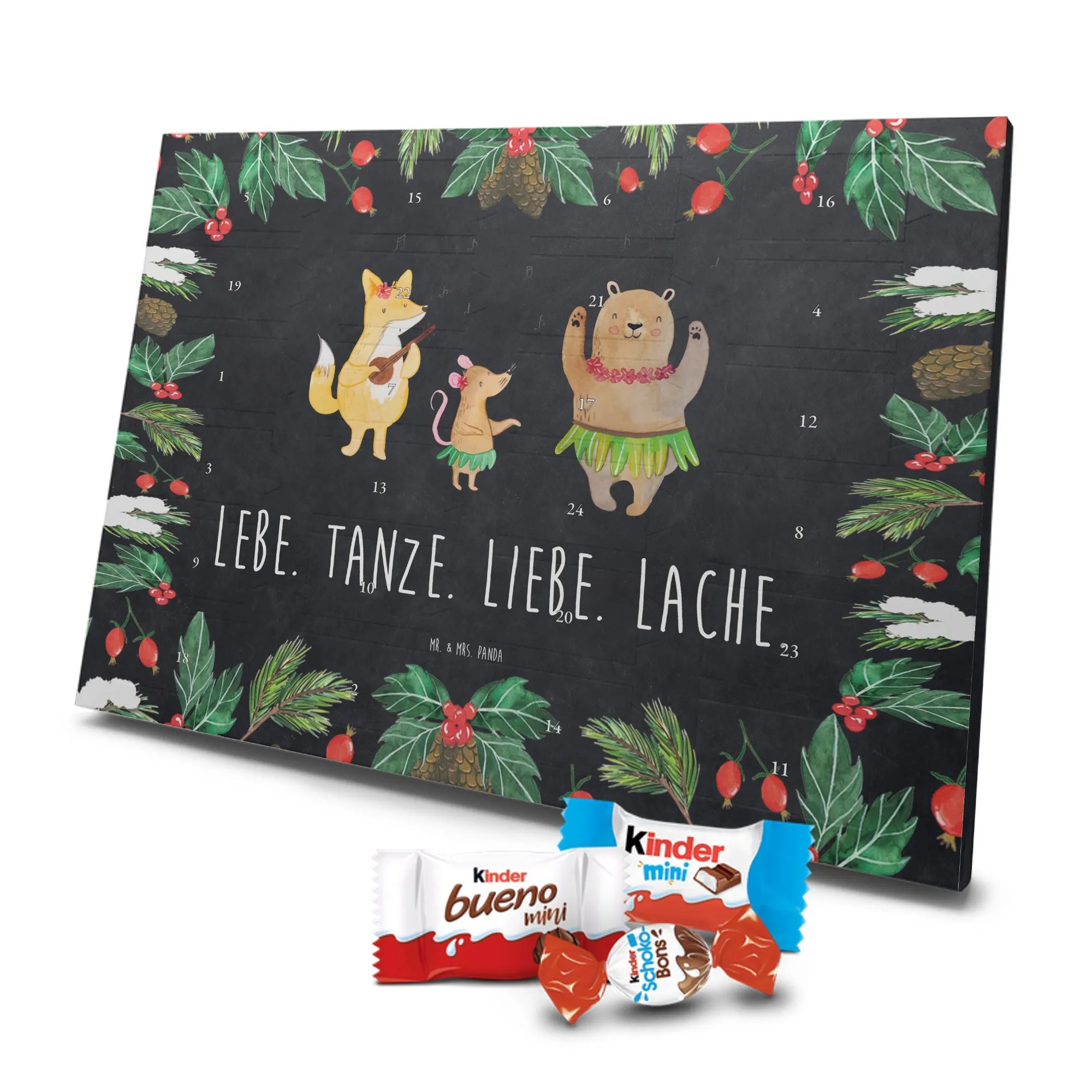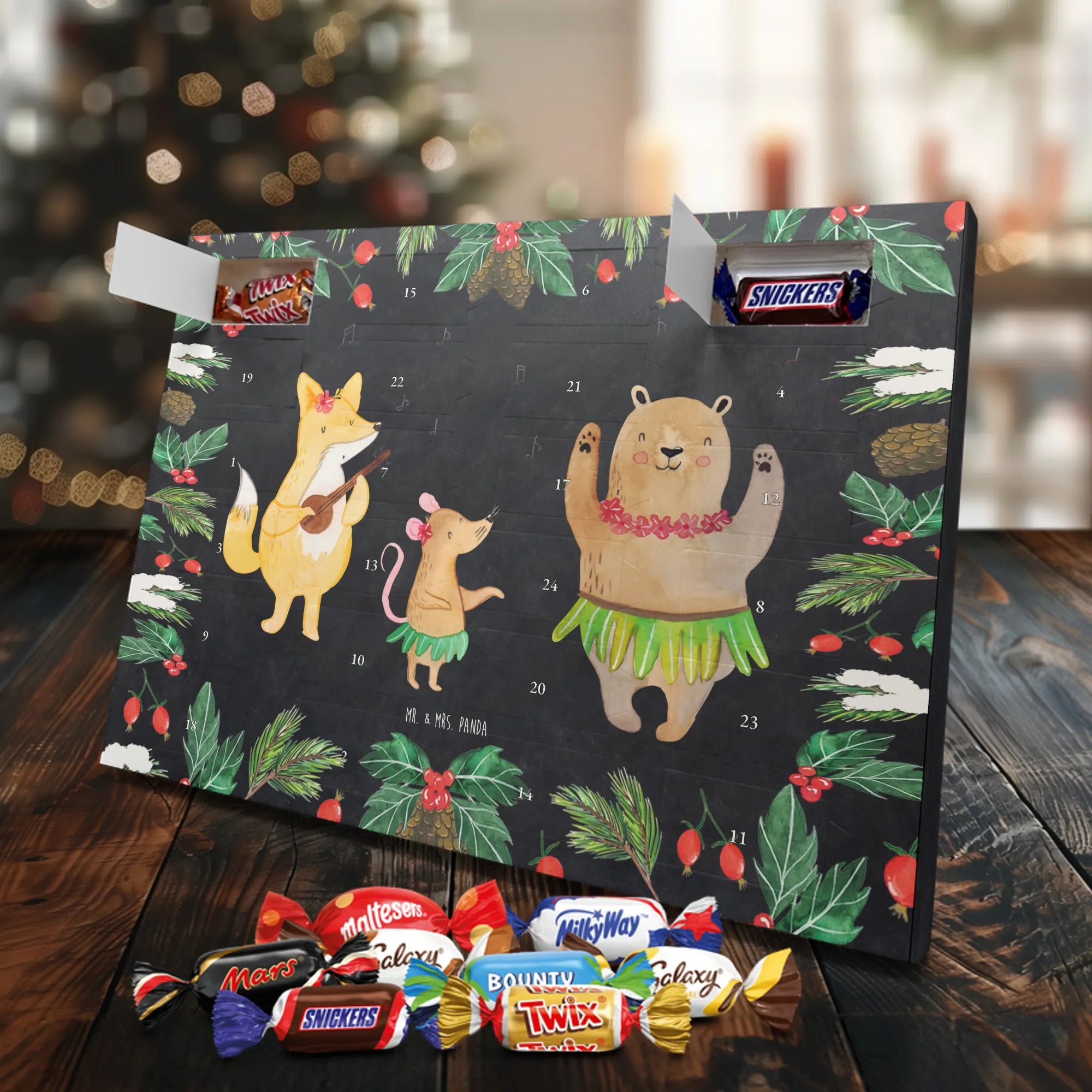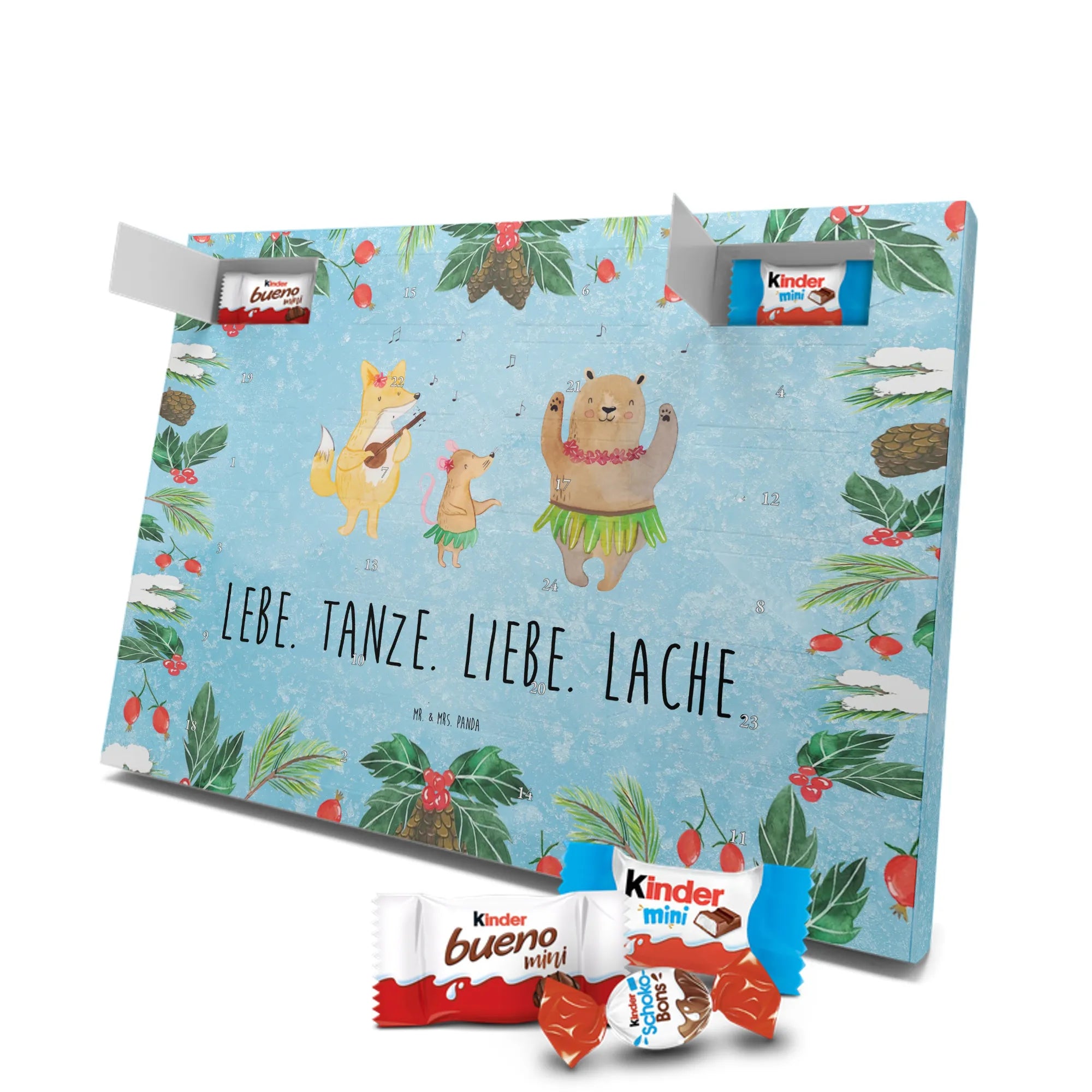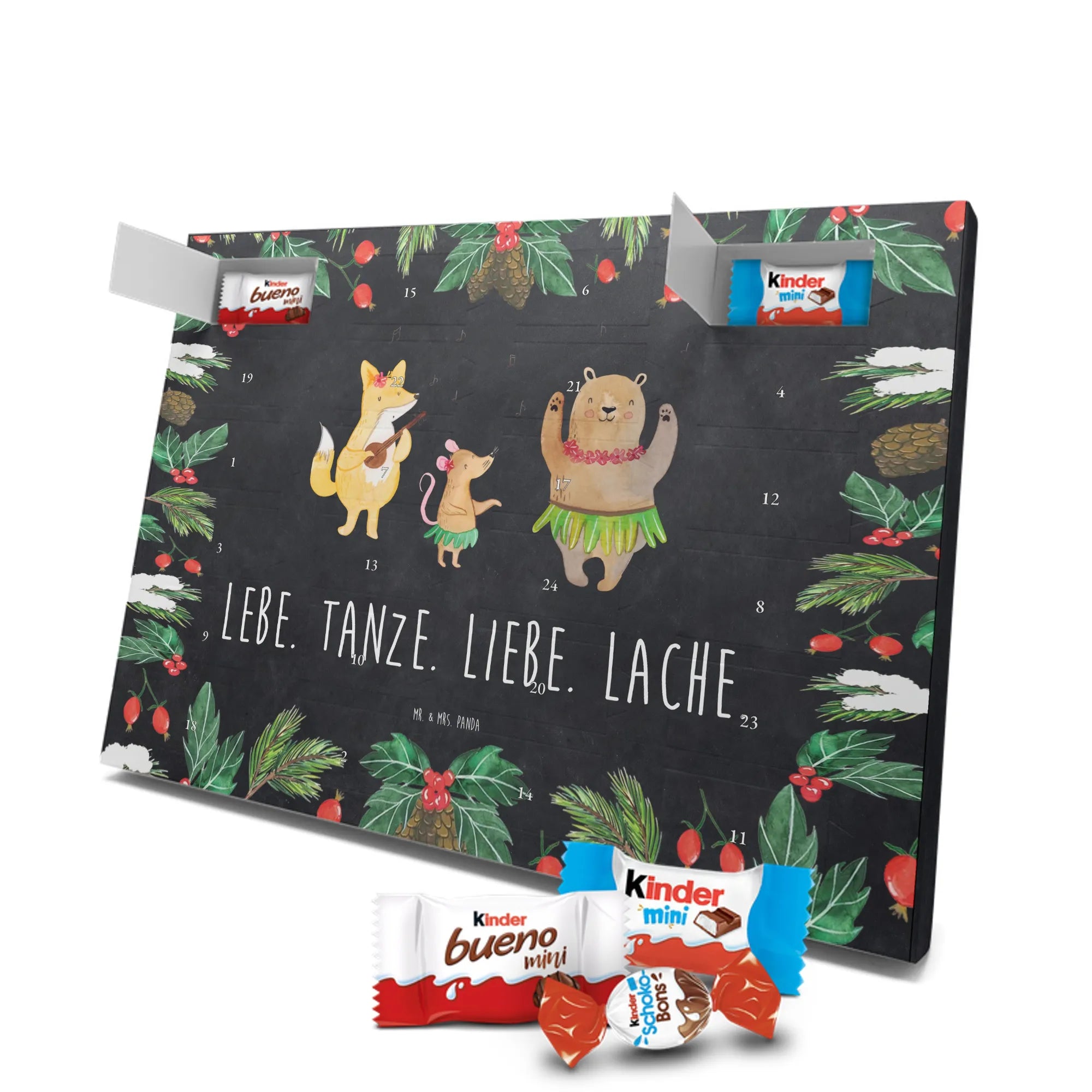 Mit diesem zauberhaften Schokoladen Adventskalender von Mr. & Mrs. Panda wird die Adventszeit bunt und fröhlich. Das Motiv zeigt niedliche Waldbewohner in Hula-Röcken, die zur hawaiianischen Musik tanzen. Der Slogan „Lebe. Tanze. Liebe. Lache.“ bringt genau die richtige Portion Gute Laune in jeden Dezembermorgen.