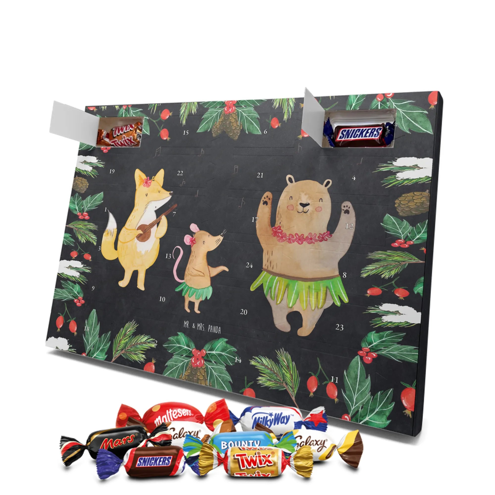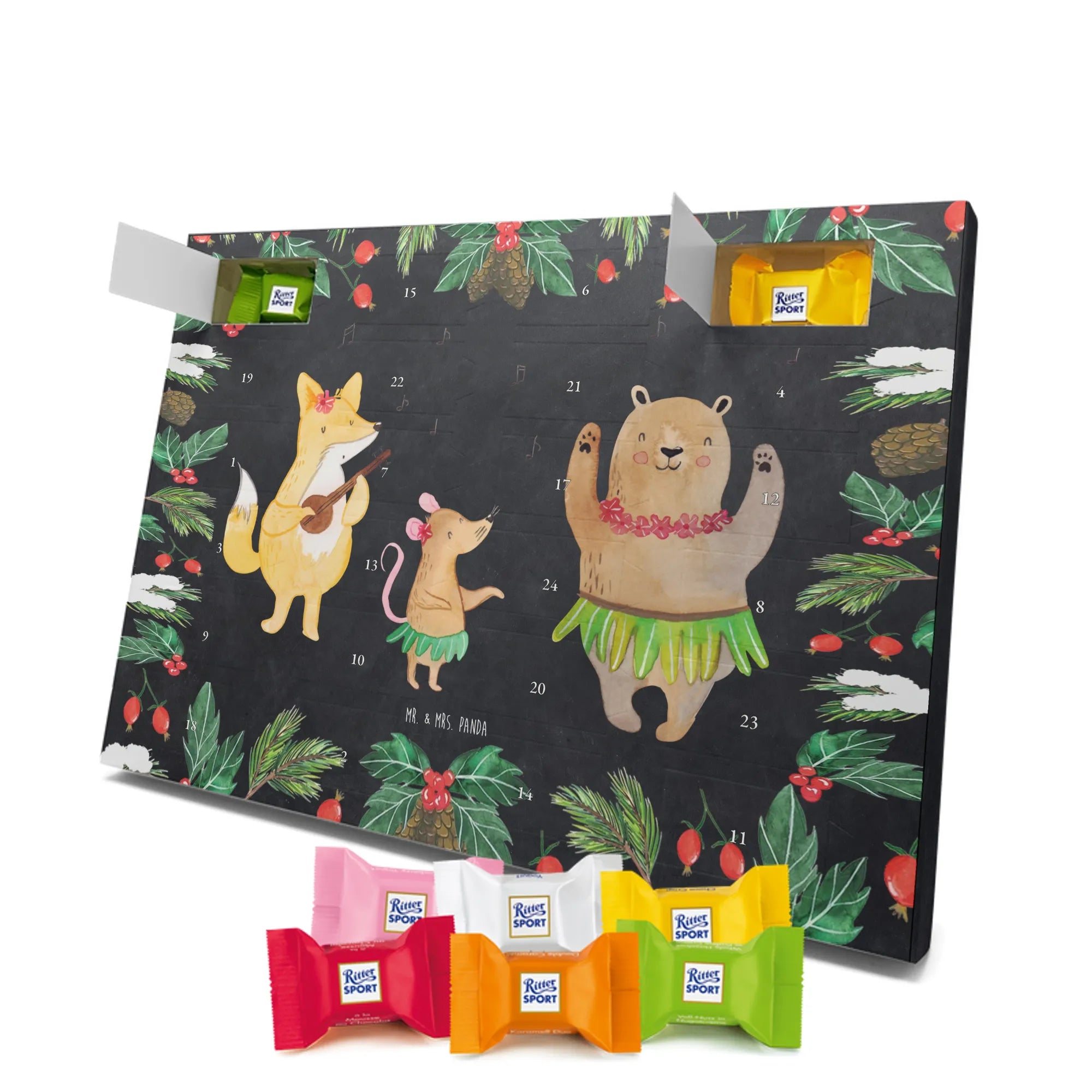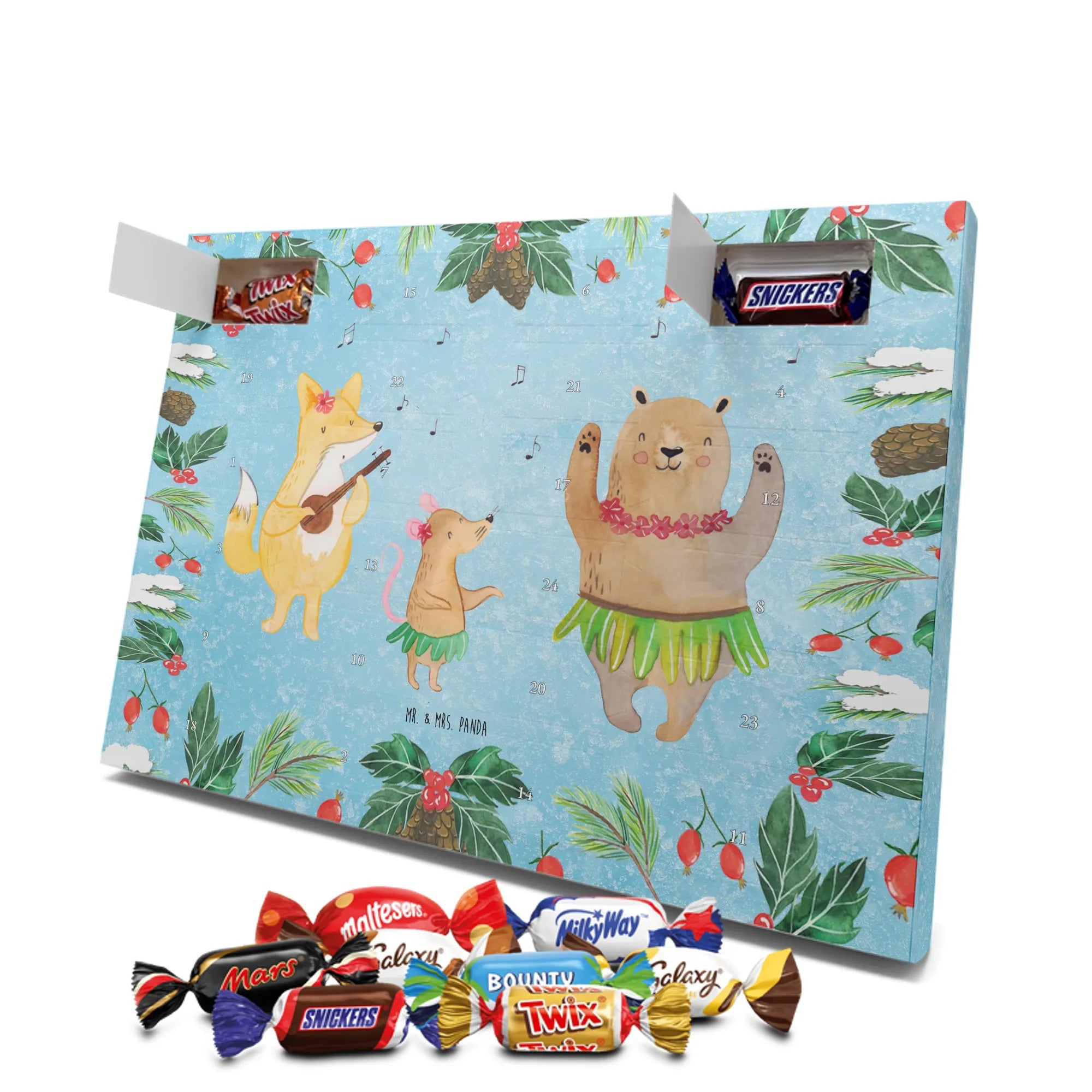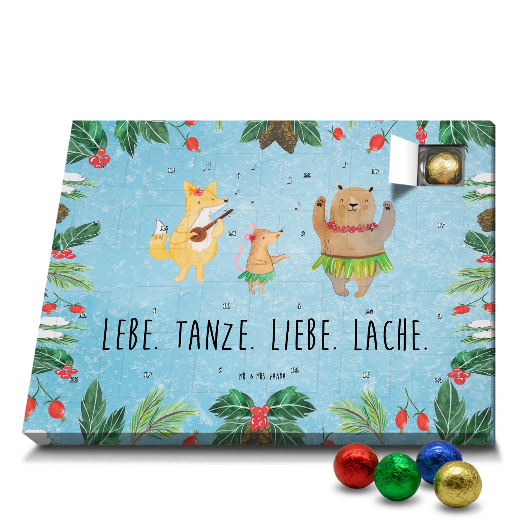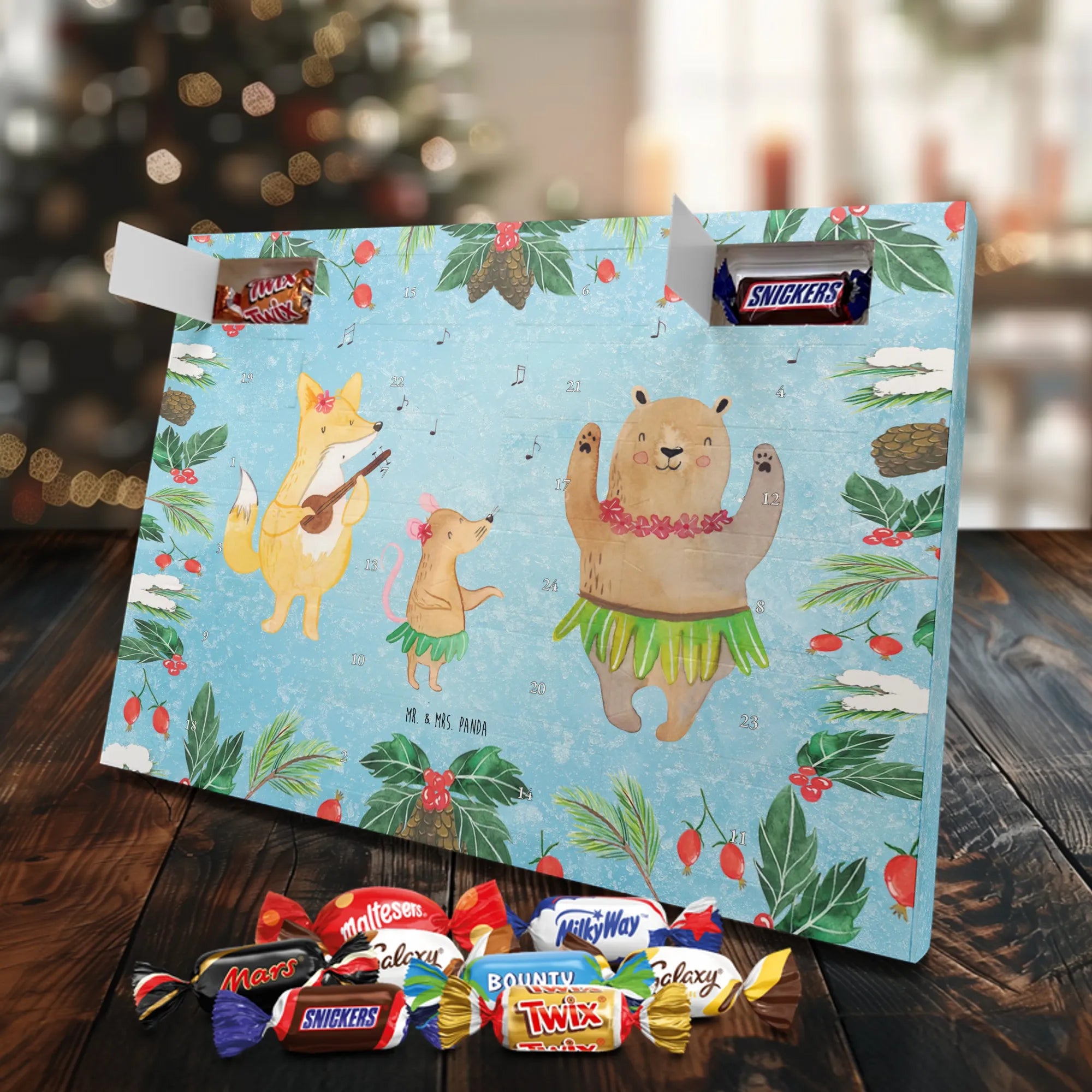 Mit diesem zauberhaften Schokoladen Adventskalender von Mr. & Mrs. Panda wird die Adventszeit bunt und fröhlich. Das Motiv zeigt niedliche Waldbewohner in Hula-Röcken, die zur hawaiianischen Musik tanzen. Der Slogan „Lebe. Tanze. Liebe. Lache.“ bringt genau die richtige Portion Gute Laune in jeden Dezembermorgen.