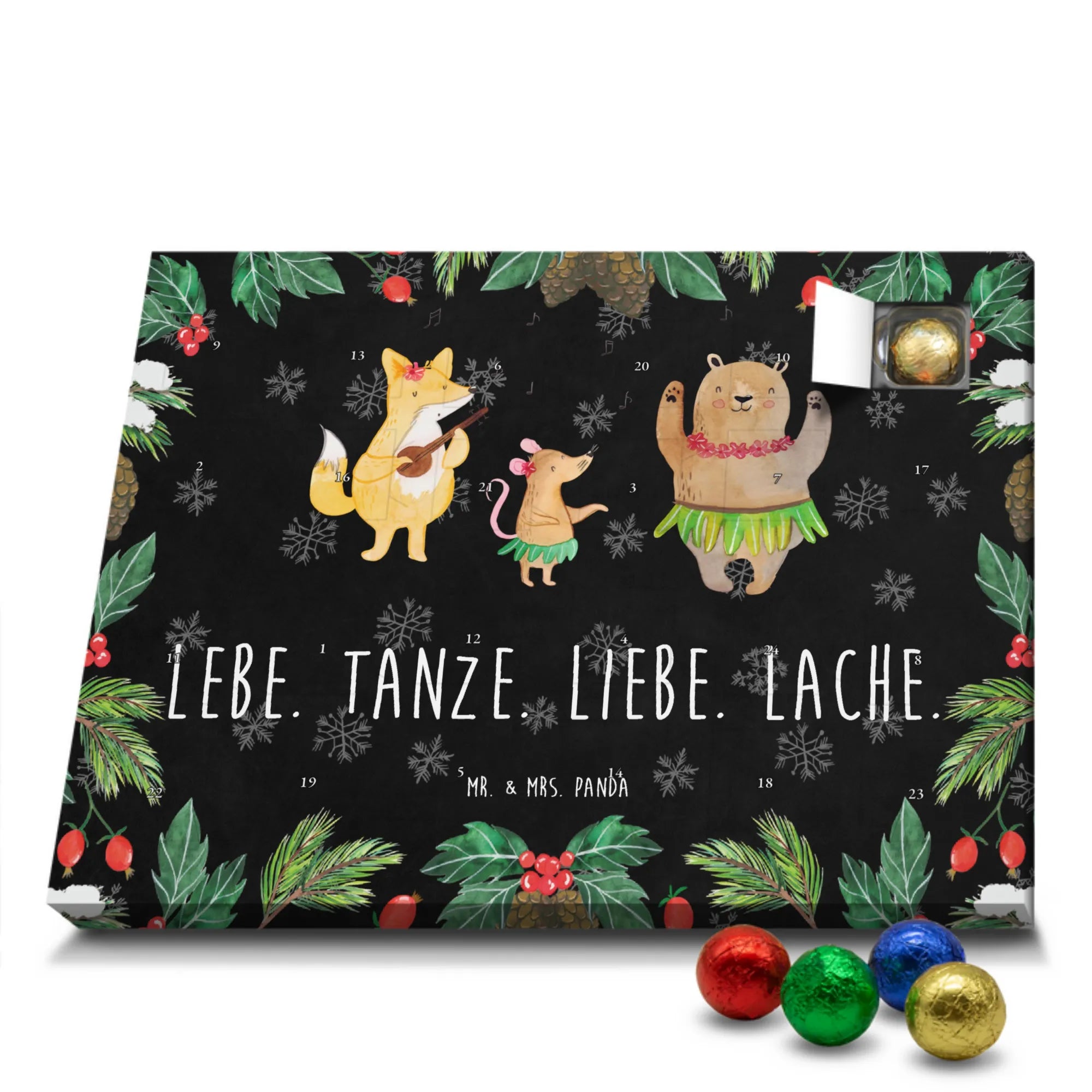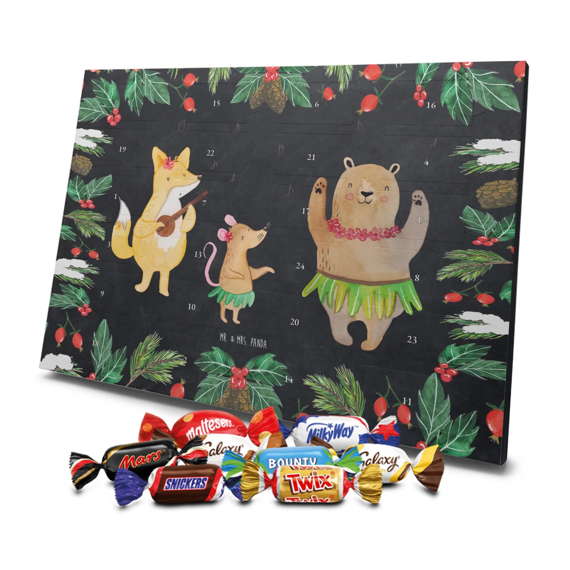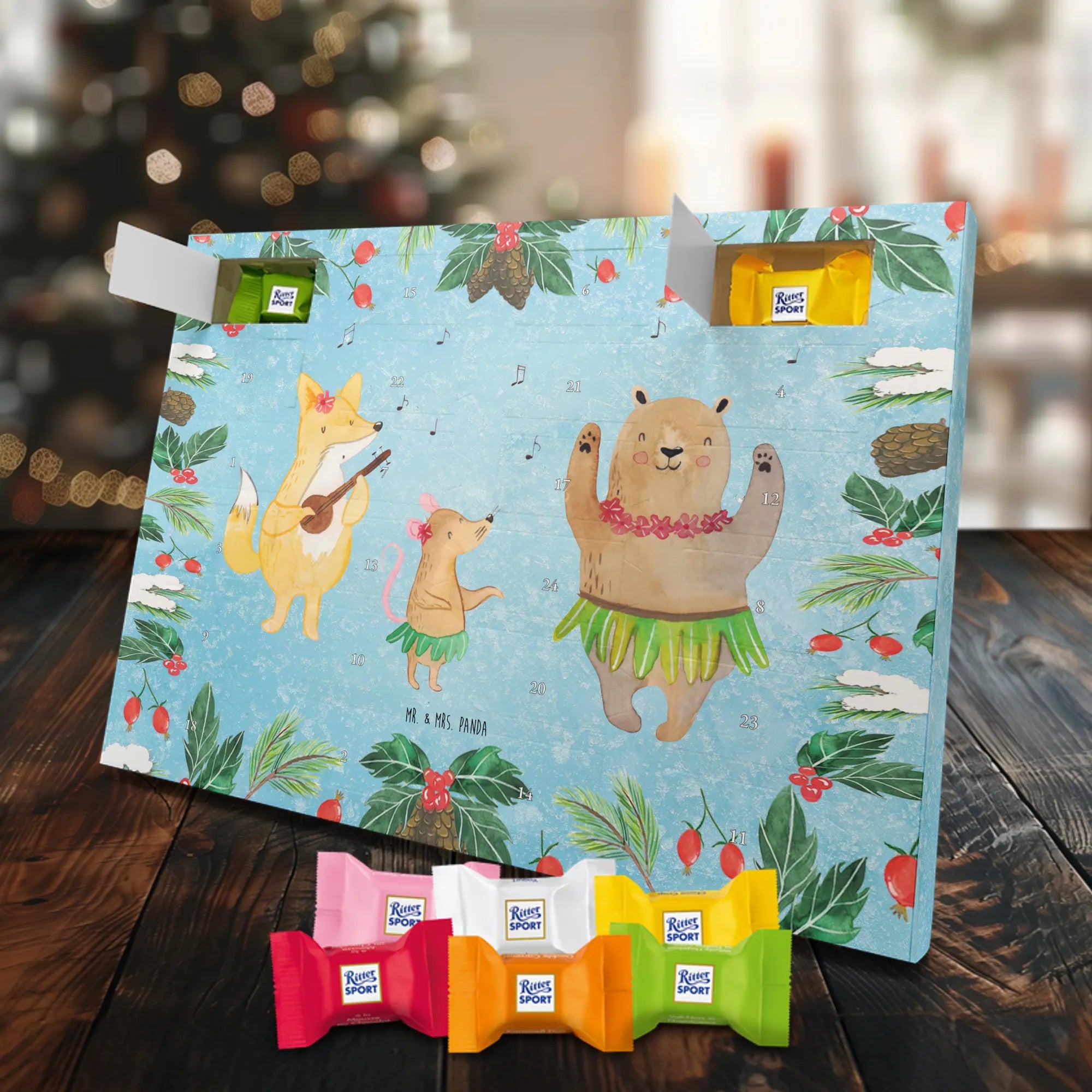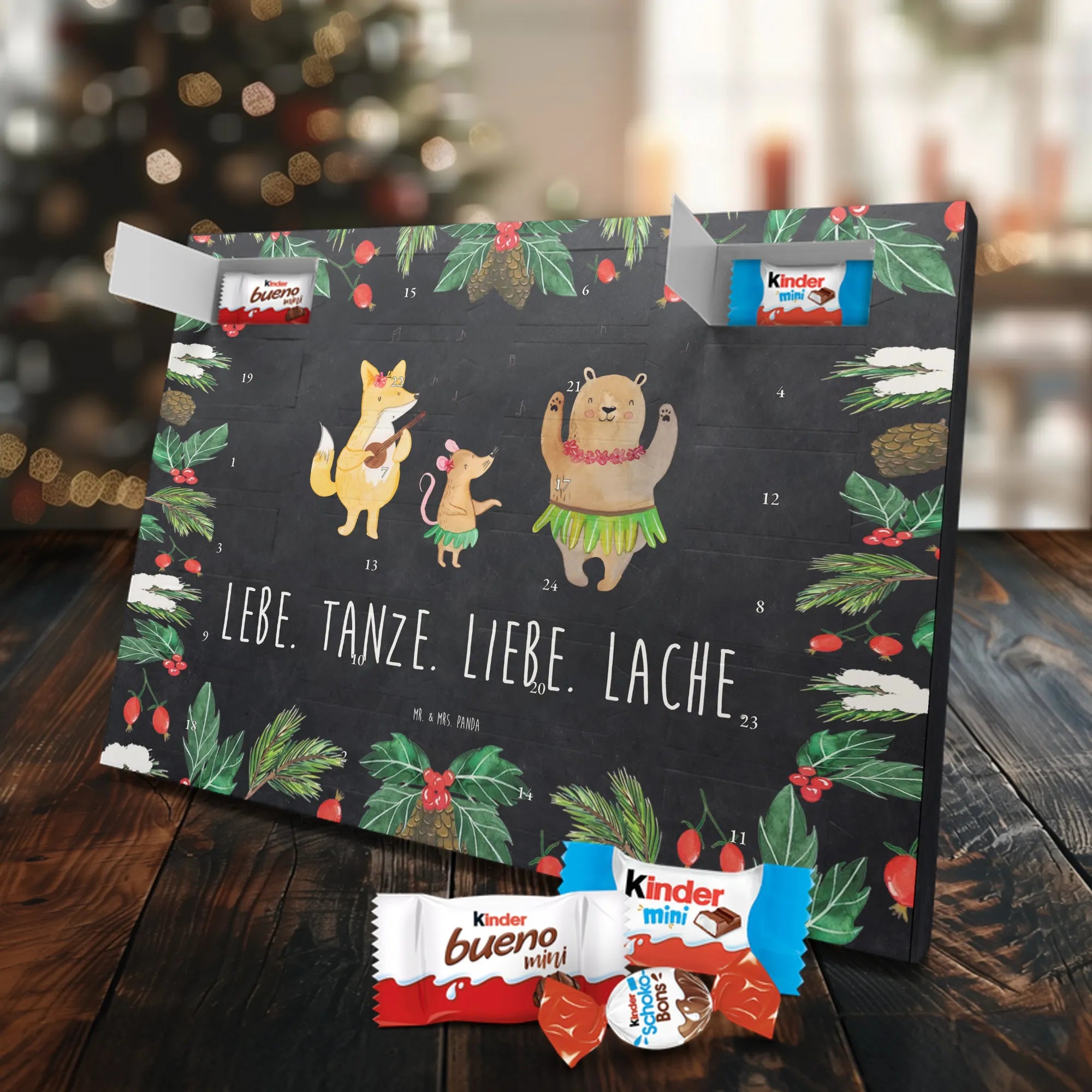 Mit diesem zauberhaften Schokoladen Adventskalender von Mr. & Mrs. Panda wird die Adventszeit bunt und fröhlich. Das Motiv zeigt niedliche Waldbewohner in Hula-Röcken, die zur hawaiianischen Musik tanzen. Der Slogan „Lebe. Tanze. Liebe. Lache.“ bringt genau die richtige Portion Gute Laune in jeden Dezembermorgen.