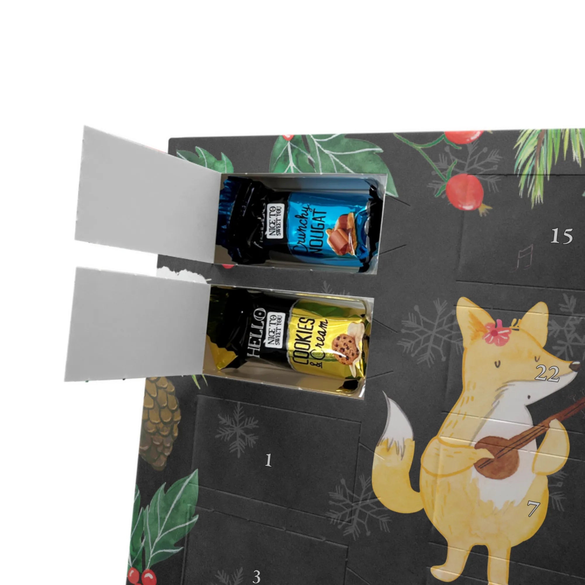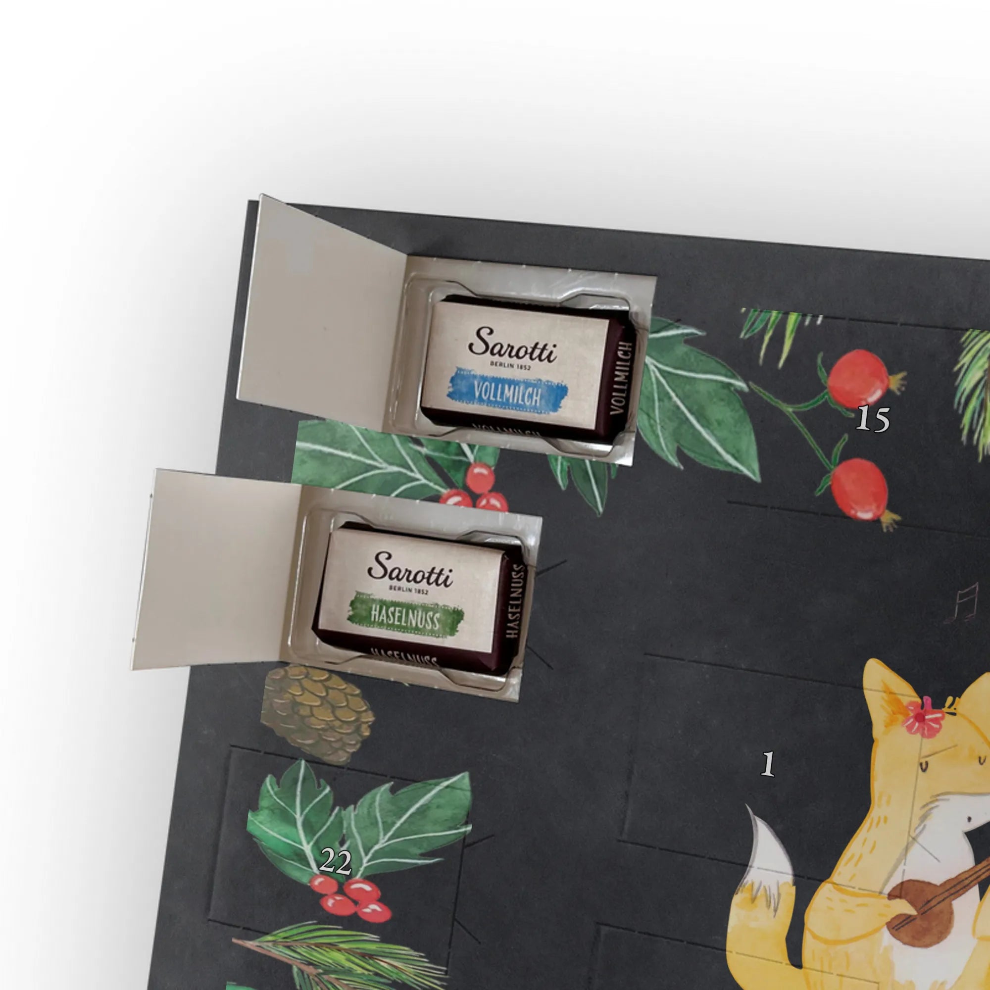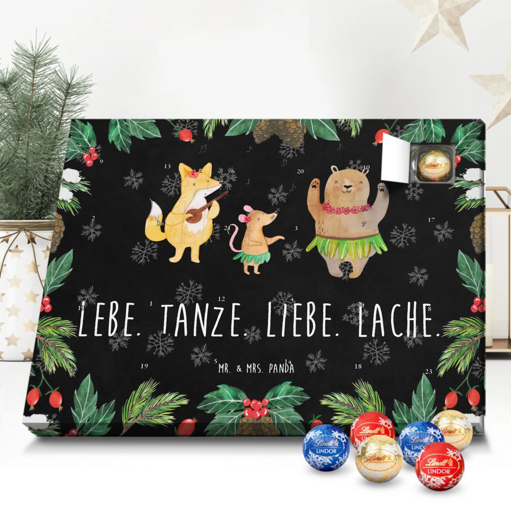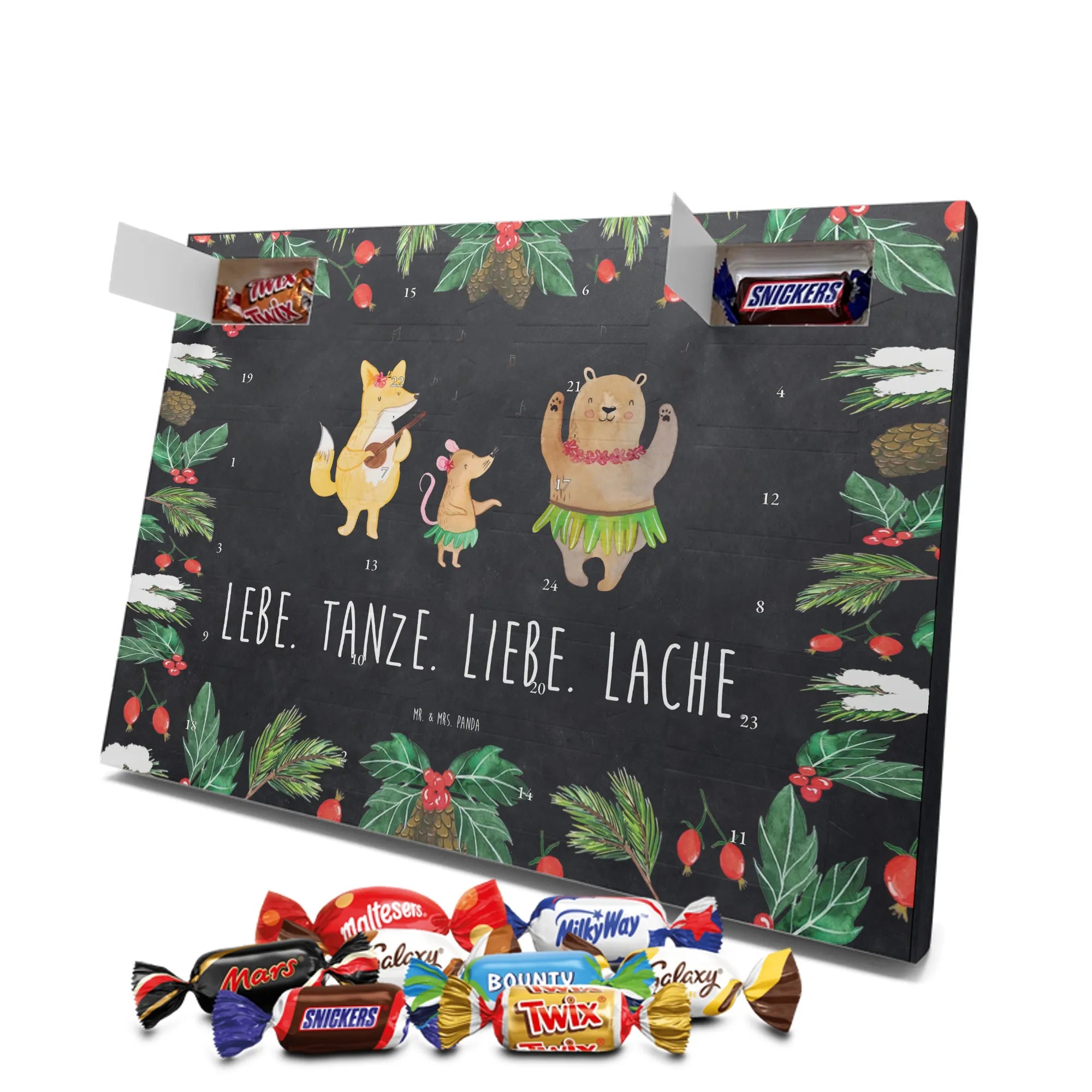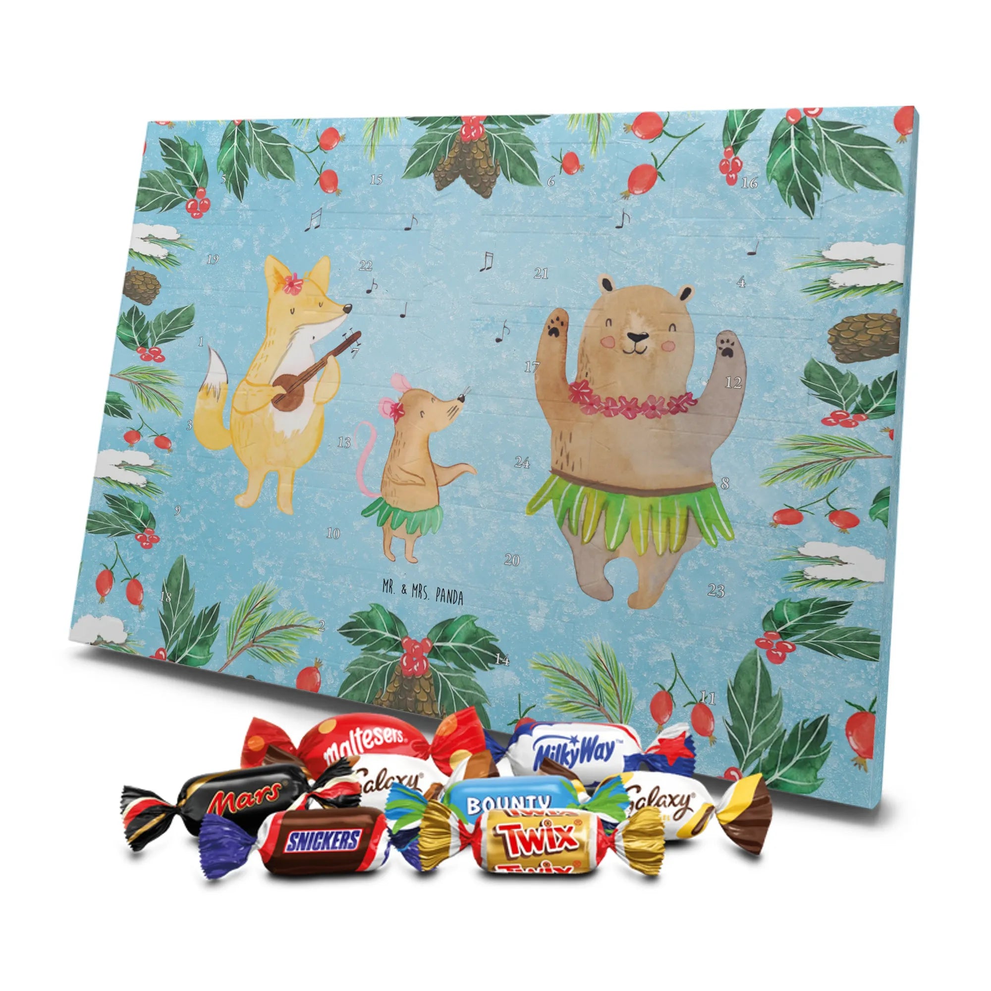 Mit diesem zauberhaften Schokoladen Adventskalender von Mr. & Mrs. Panda wird die Adventszeit bunt und fröhlich. Das Motiv zeigt niedliche Waldbewohner in Hula-Röcken, die zur hawaiianischen Musik tanzen. Der Slogan „Lebe. Tanze. Liebe. Lache.“ bringt genau die richtige Portion Gute Laune in jeden Dezembermorgen.