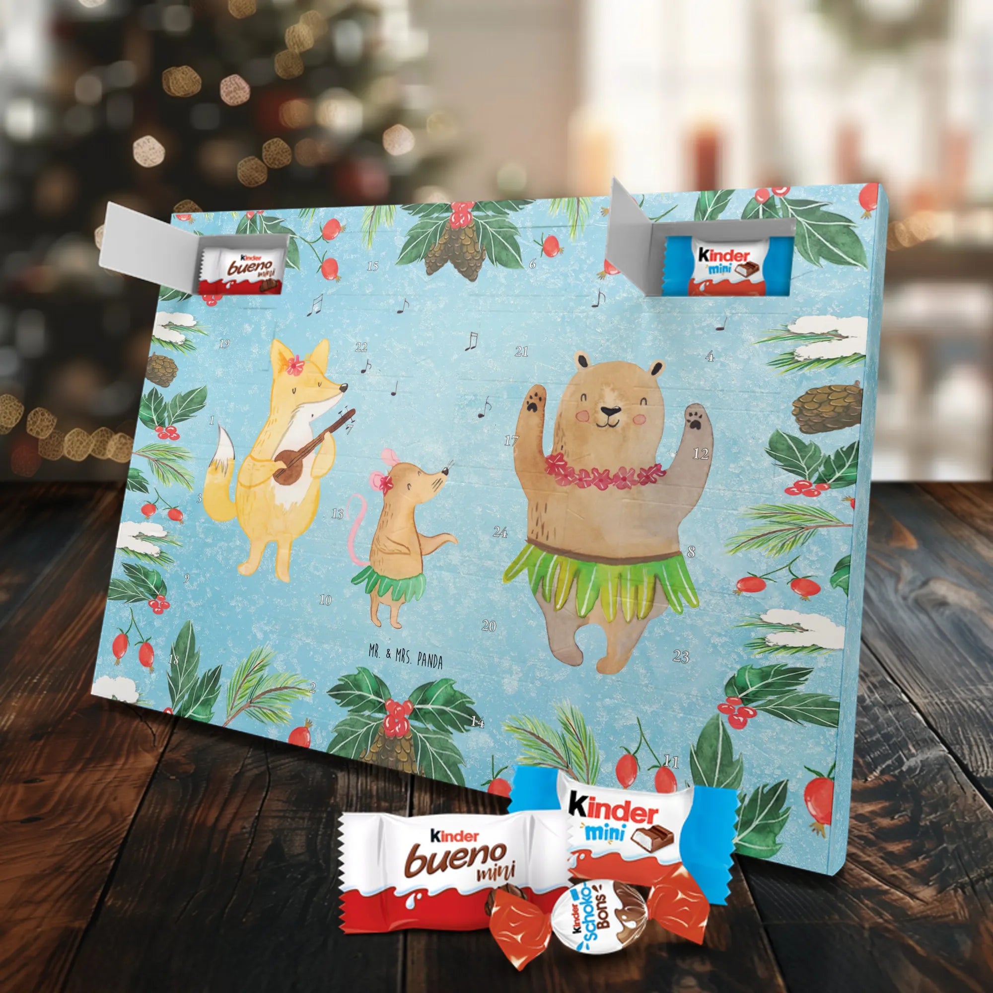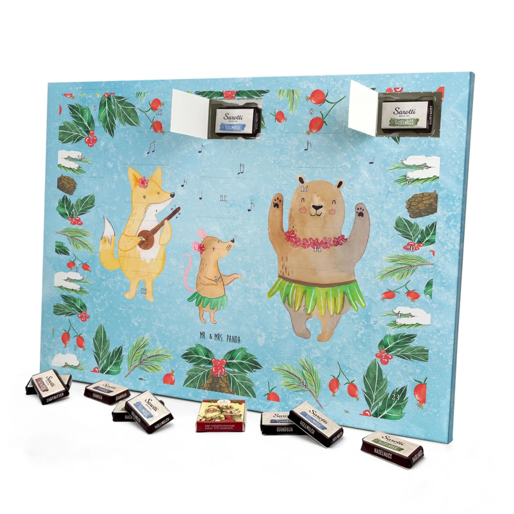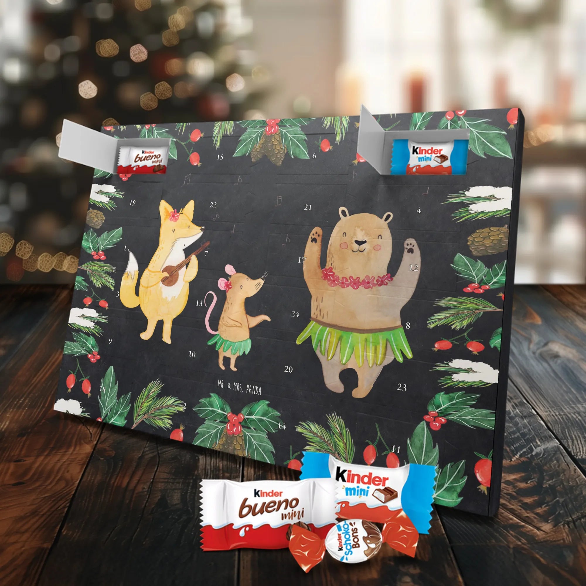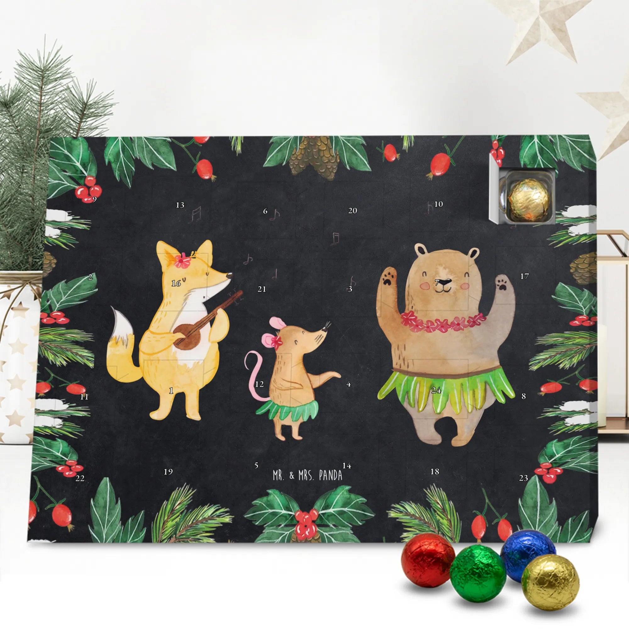 Mr. & Mrs. Panda Schoko Adventskalender Waldtiere Aloha – ein Adventskalender Schokolade, der Herz und Gaumen zugleich erfreut. Die niedlichen Waldbewohner in Hula-Röcken tanzen fröhlich unter dem Motto "Lebe. Tanze. Liebe. Lache." und machen den Countdown bis Weihnachten zu einem bunten Vergnügen. Dieser Weihnachtskalender Schoko verbindet liebevolle Illustrationen mit hochwertiger Druckqualität.