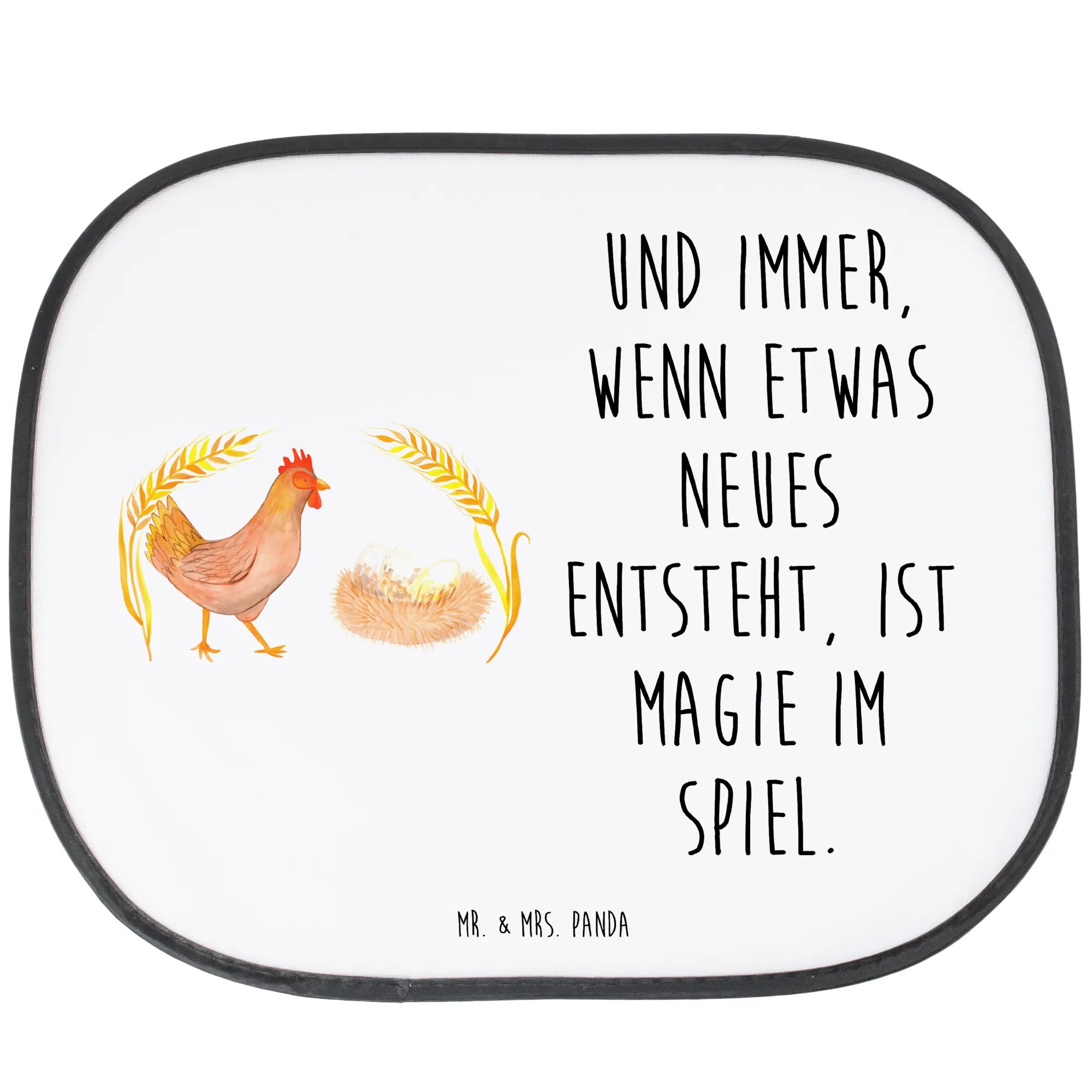 Mit einem durchdachten Motiv, das ein süßes Huhn zeigt, zaubert unser Sonnenschutz ein Lächeln ins Gesicht und bringt ländlichen Charme in dein Auto. Der Spruch „Und immer, wenn etwas neues entsteht, ist Magie im Spiel“, erinnert uns daran, wie besonders das Leben ist.