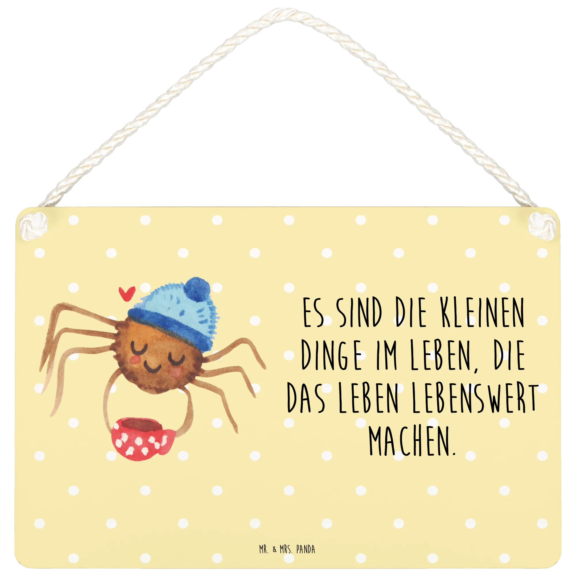 Mit seinem charmanten Motiv der niedlichen Spinne Agathe, die genüsslich ihren Kaffee genießt und dabei eine Wollmütze trägt, bringt es eine humorvolle Note in jeden Raum. Neben Agathe ist noch ein Herz zu sehen, das die Aussage von Mr. & Mrs. Panda wunderbar unterstreicht: Es sind die kleinen Dinge im Leben, die das Leben lebenswert machen, und genau das vermittelt dieses Schild.