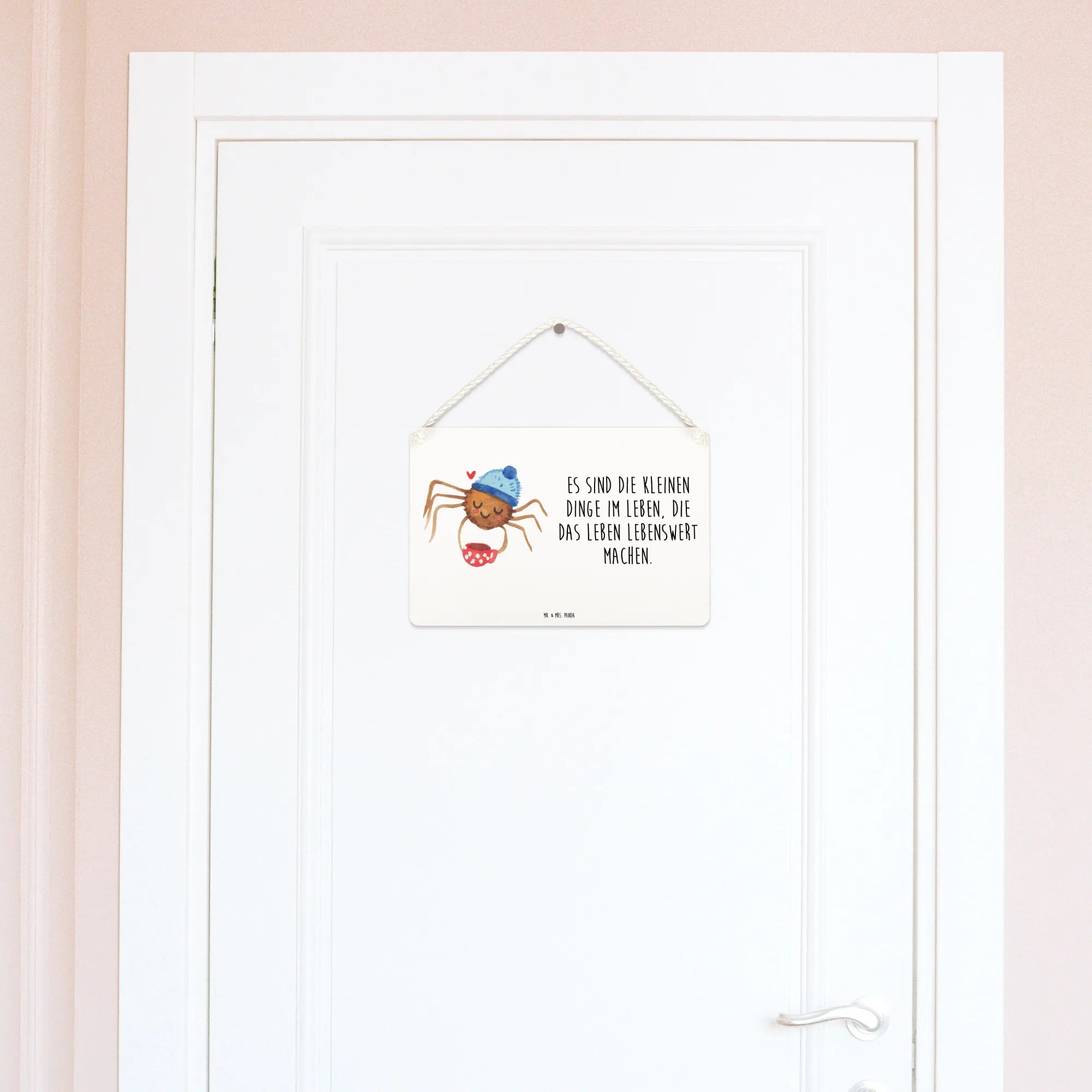 Mit einem charmanten Design, das die süße Spinne Agathe zeigt, die gemütlich ihren Kaffee genießt, bringt dieses Schild einen Hauch von Freude in Dein Zuhause. Die Zeichnung zeigt Agathe in einer süßen Wollmütze, umgeben von einem kleinen Herz, und unterstreicht die Botschaft: 'Es sind die kleinen Dinge im Leben, die das Leben lebenswert machen.'